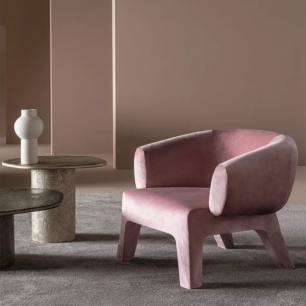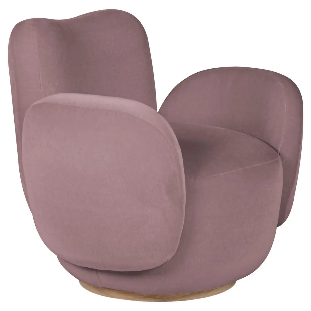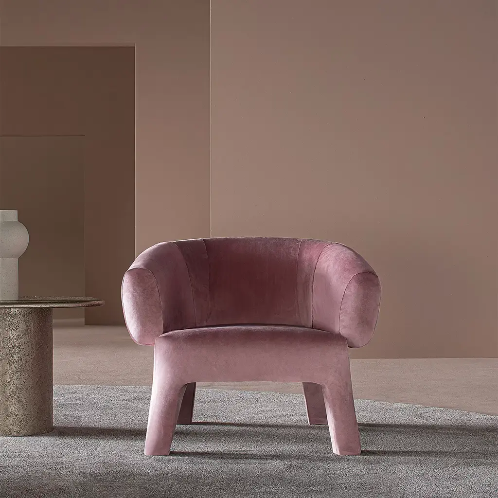 The elegant armchair features a solid fir wood frame and poplar plywood for a sturdy yet stylish structure. The seat is padded with different densities of polyurethane foam for comfort. Fixed cover in Amster mauve velvet, it adds a sophisticated and luxurious touch to any space. Perfect for enhancing both modern and classic interiors, it combines craftsmanship, comfort, and timeless design.