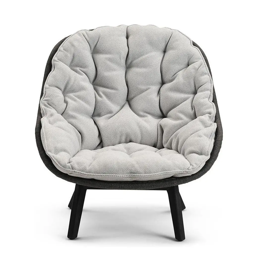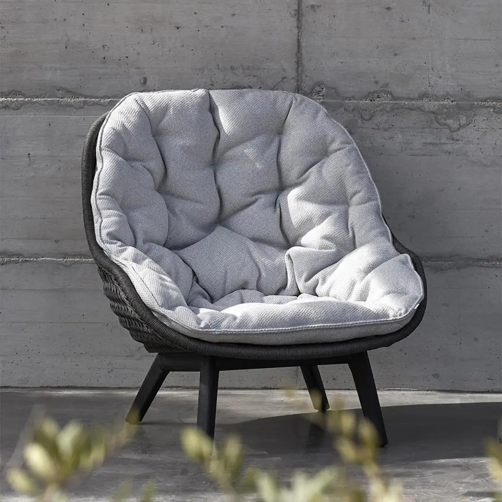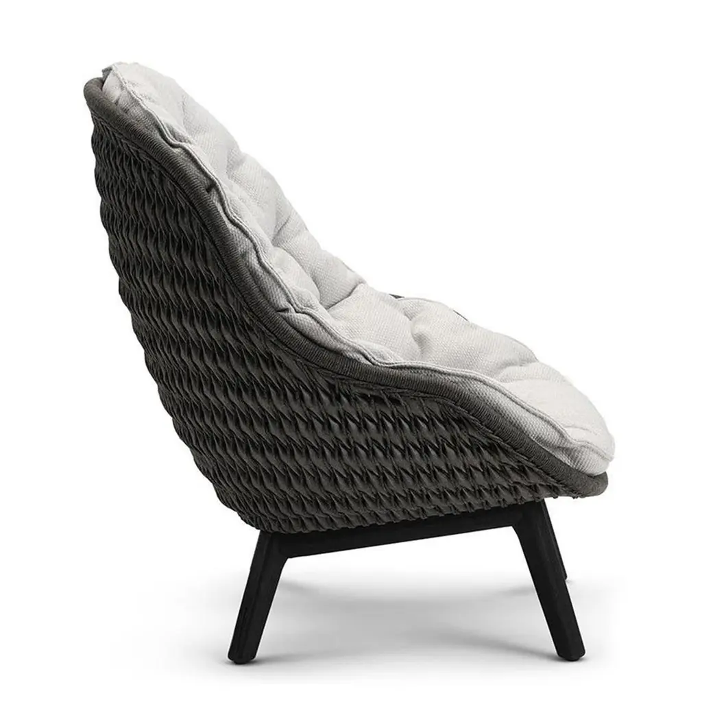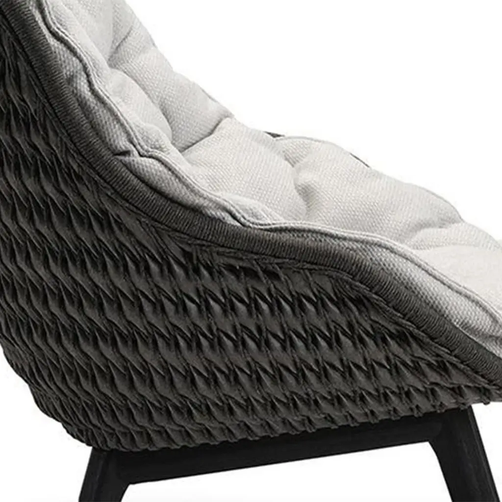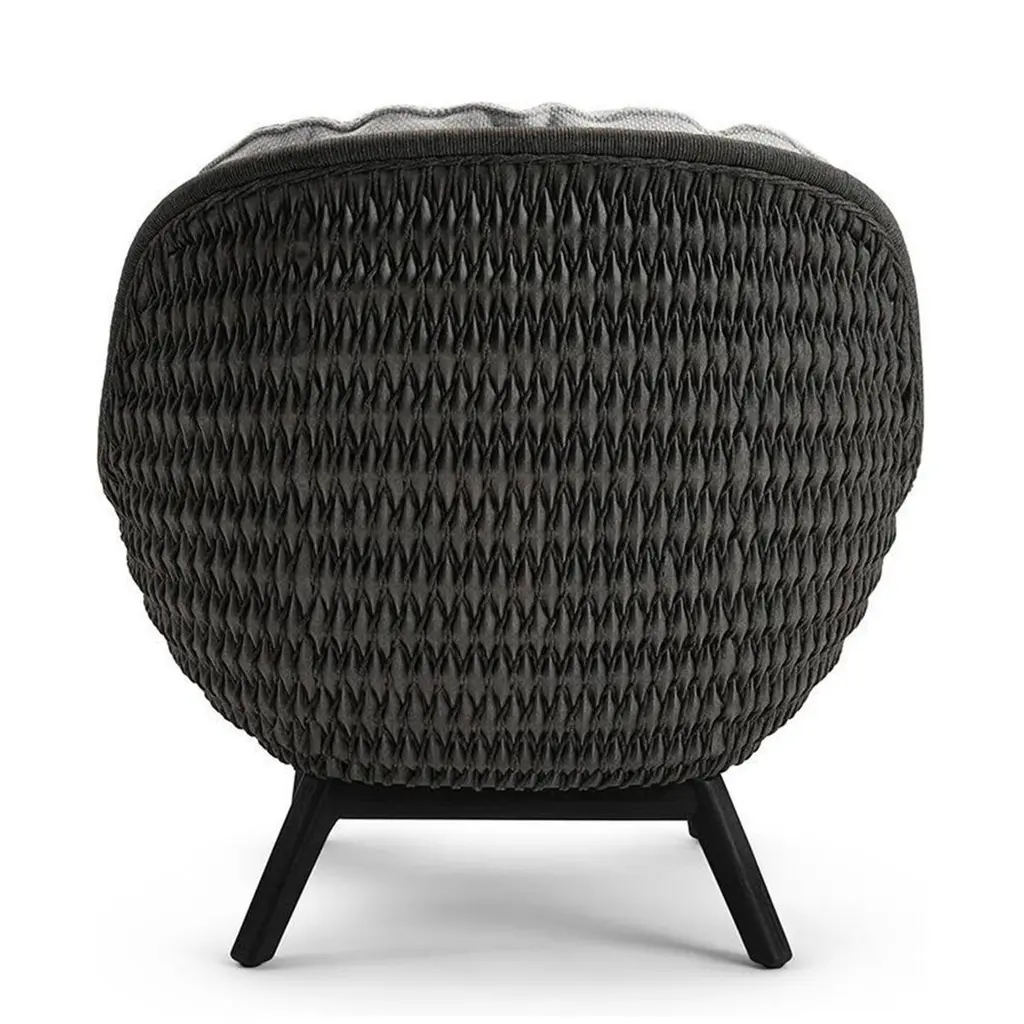 Armchair Lonam Black with structure in solid teak in black stained finish,back seat structure in wicker and cord alliage in anthracite finish, withupholstered seat covered in cement outdoor fabric (Cat B.).