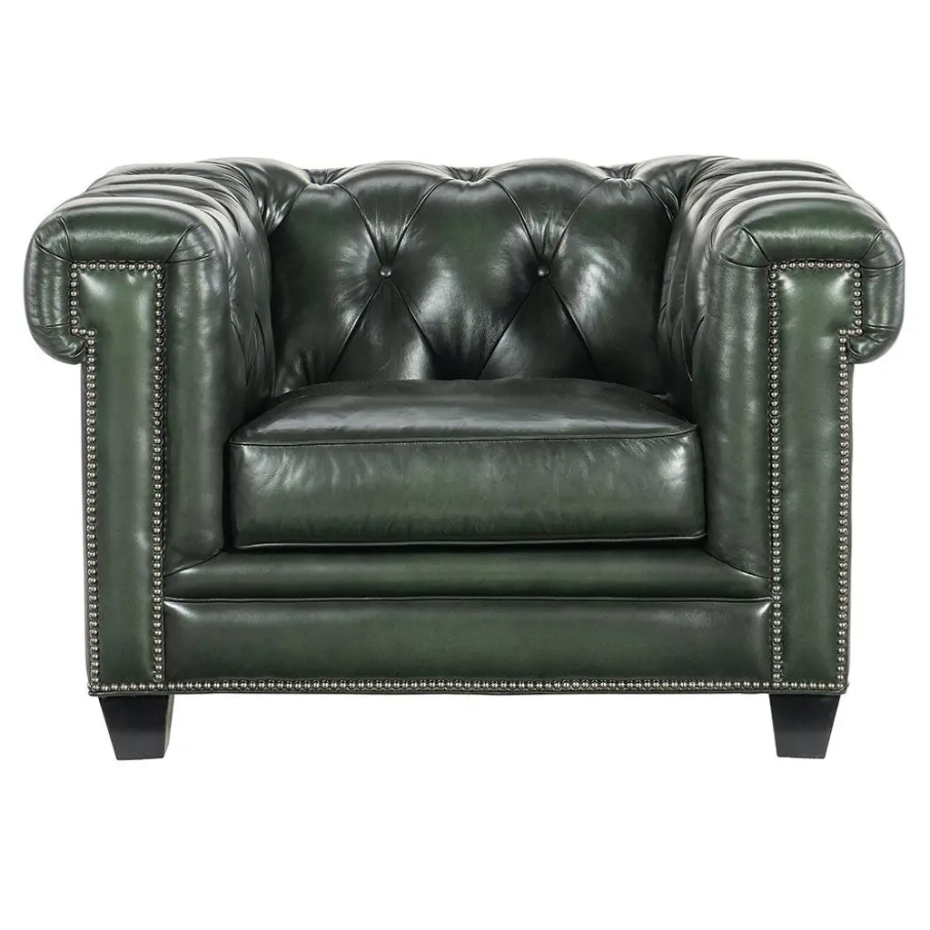 Exuding warmth and sophistication, this armchair will make for an exclusive accent to contemporary interiors. Crafted by hand following traditional methods, it features a solid wood frame padded with polyurethane, upholstered with first-rate green-hued leather boasting a handmade capitonné motif on the interior of the enveloping back and armrests. Please consult the Concierge for further information.