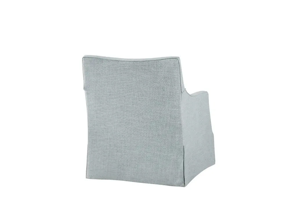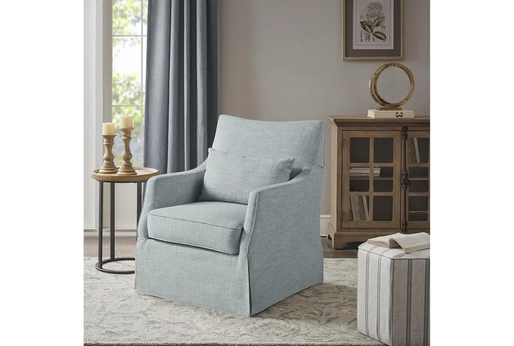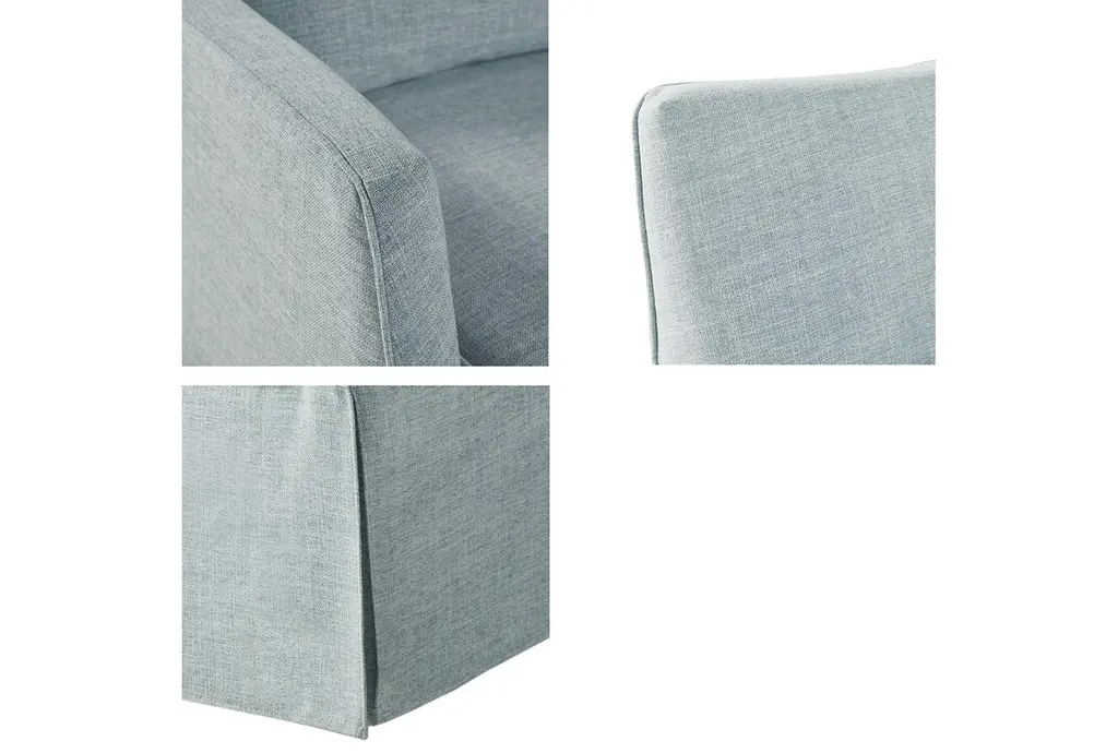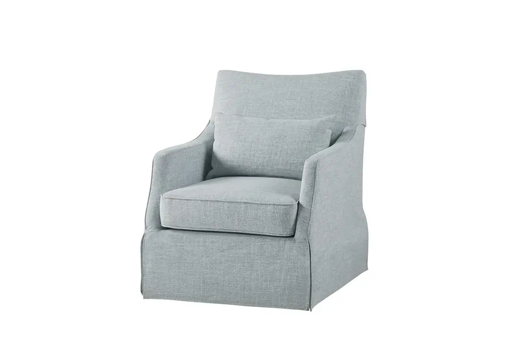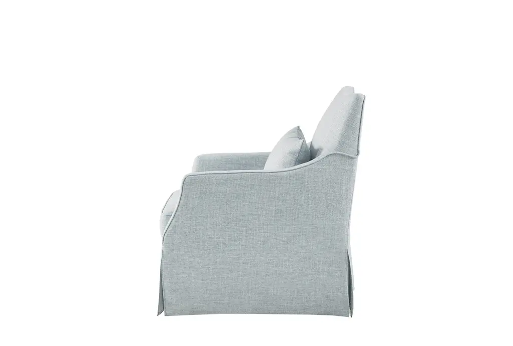 Introducing the London Light Blue Skirted Fabric Swivel Arm Chair, a perfect blend of comfort and functionality for your living room. This chair features a traditional design with a soothing light blue color, adding a touch of tranquility to any space. Its firm comfort level ensures excellent support while you relax.