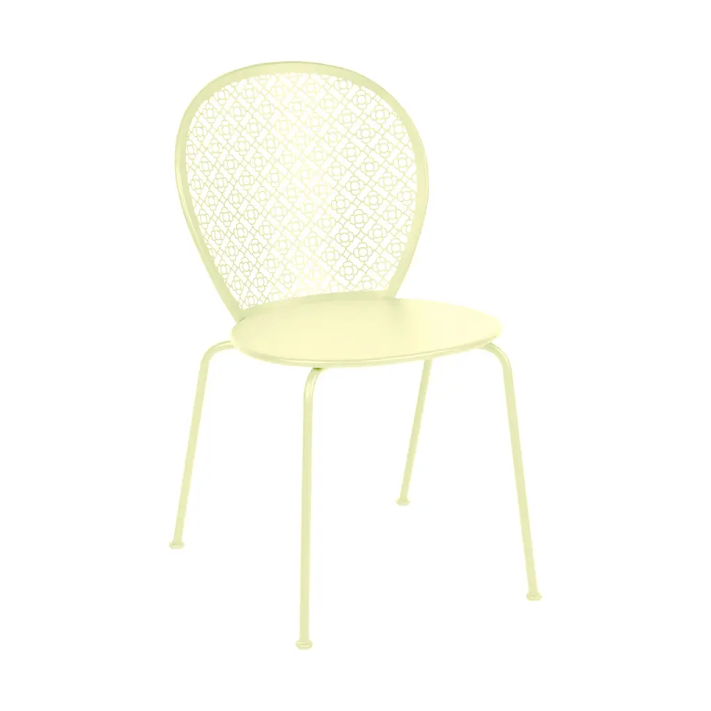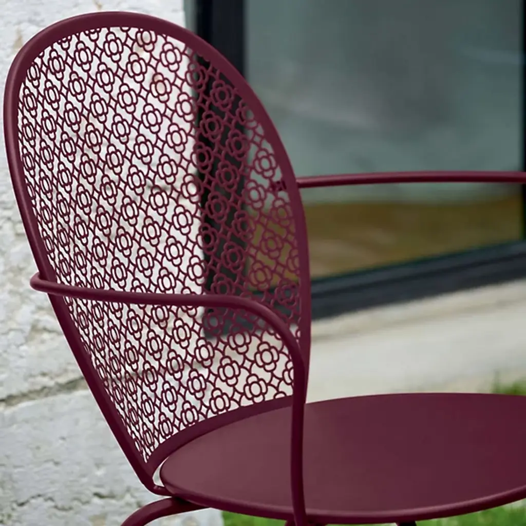 A curvy, lacy take on 1950s garden furniture. Designed by Frederic Sofia, the Lorette Low Armchair, Set of 2 by Fermob has wide, generously curved surfaces and smooth angles. The perforated back, made of laser-cut steel sheet, catches the eye with its intricate, floral geometry. The rest of the chair is also steel: a steel sheet seat, steel rod arms and tubular steel frame. The chosen powder coat finish only enhances the look of the latticed backrest, and it makes this armchair durable for outdoor use.