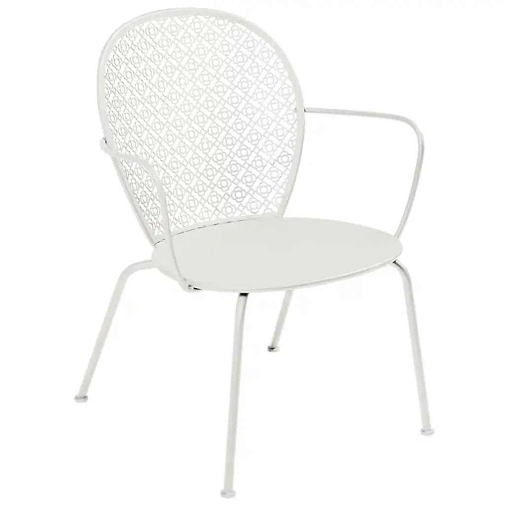 A curvy, lacy take on 1950s garden furniture. Designed by Frederic Sofia, the Lorette Low Armchair, Set of 2 by Fermob has wide, generously curved surfaces and smooth angles. The perforated back, made of laser-cut steel sheet, catches the eye with its intricate, floral geometry. The rest of the chair is also steel: a steel sheet seat, steel rod arms and tubular steel frame. The chosen powder coat finish only enhances the look of the latticed backrest, and it makes this armchair durable for outdoor use.