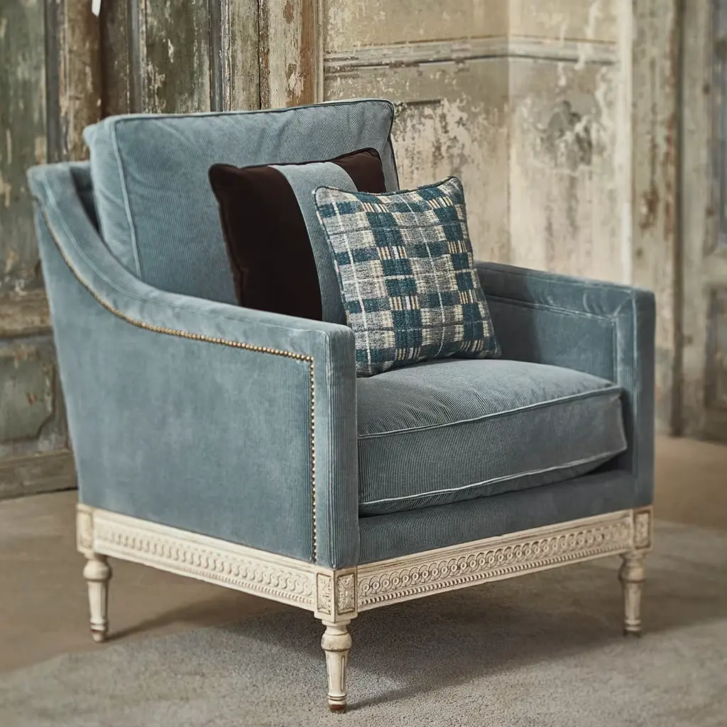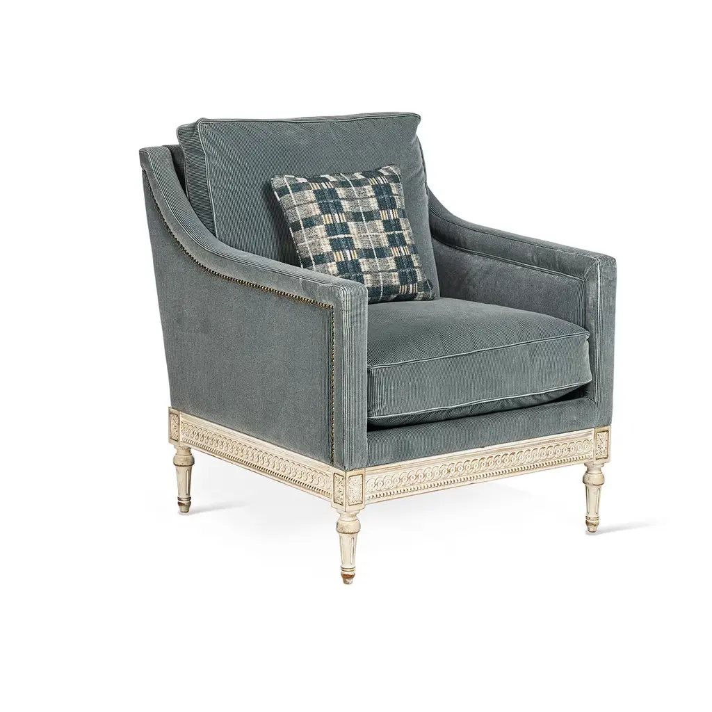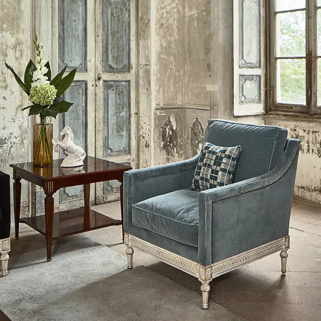 The Louis XVI armchair is characterized by straight armrests and a fully upholstered seat, with all the carvings completely hand-made. The structure is made in beechwood fully covered in light-blue fabric. The cushion is extra comfortable and in total the seat height is 50cm, the armrests are at 68cm and the depth of the seat is 56cm.