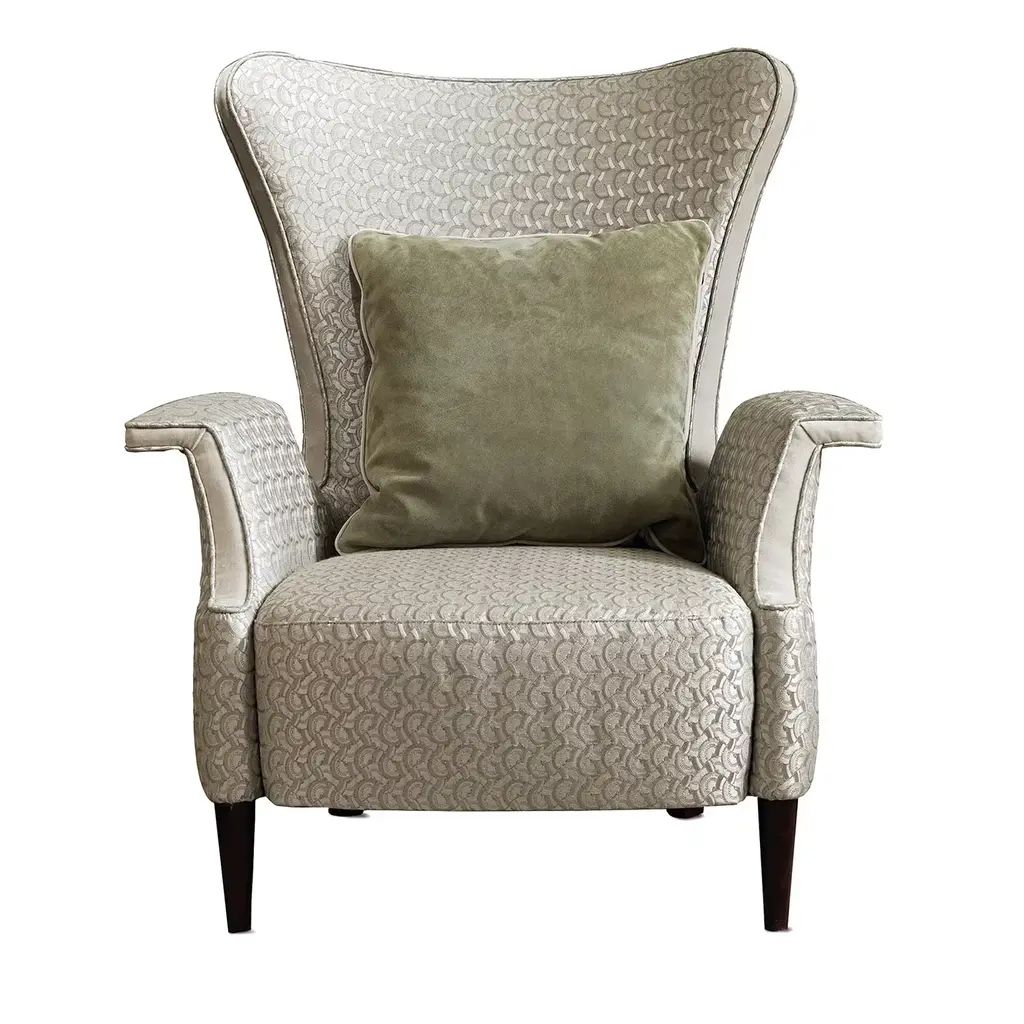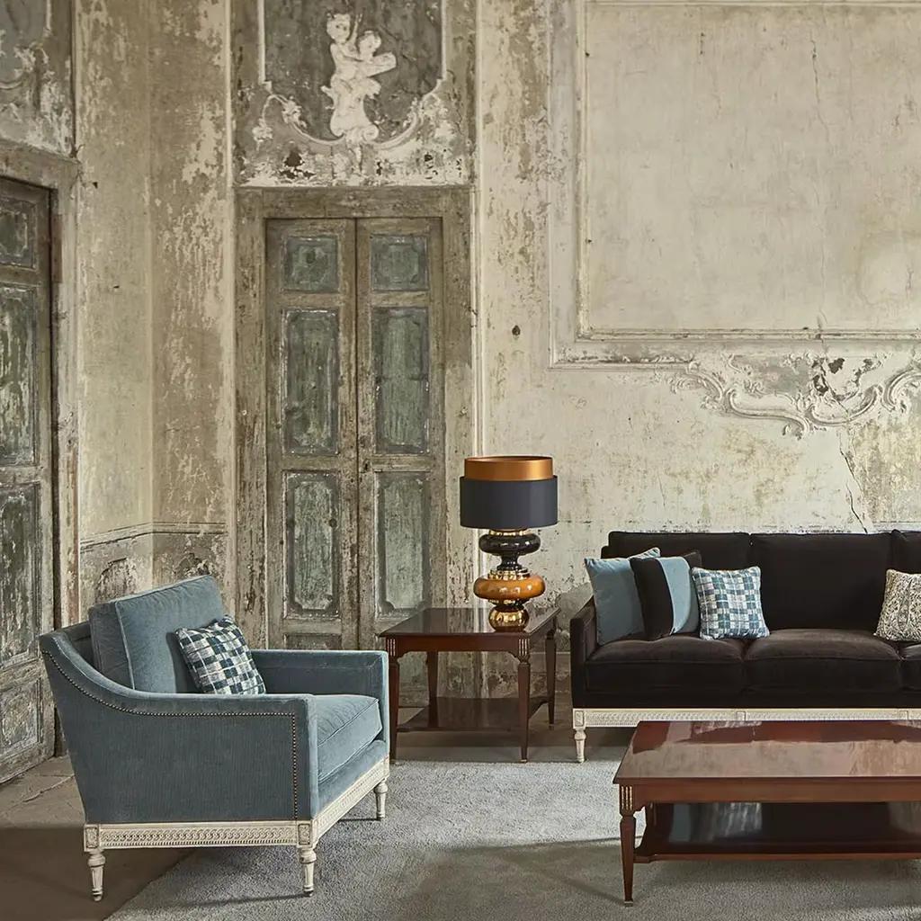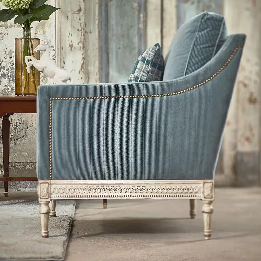 The Louis XVI armchair is characterized by straight armrests and a fully upholstered seat, with all the carvings completely hand-made. The structure is made in beechwood fully covered in light-blue fabric. The cushion is extra comfortable and in total the seat height is 50cm, the armrests are at 68cm and the depth of the seat is 56cm.