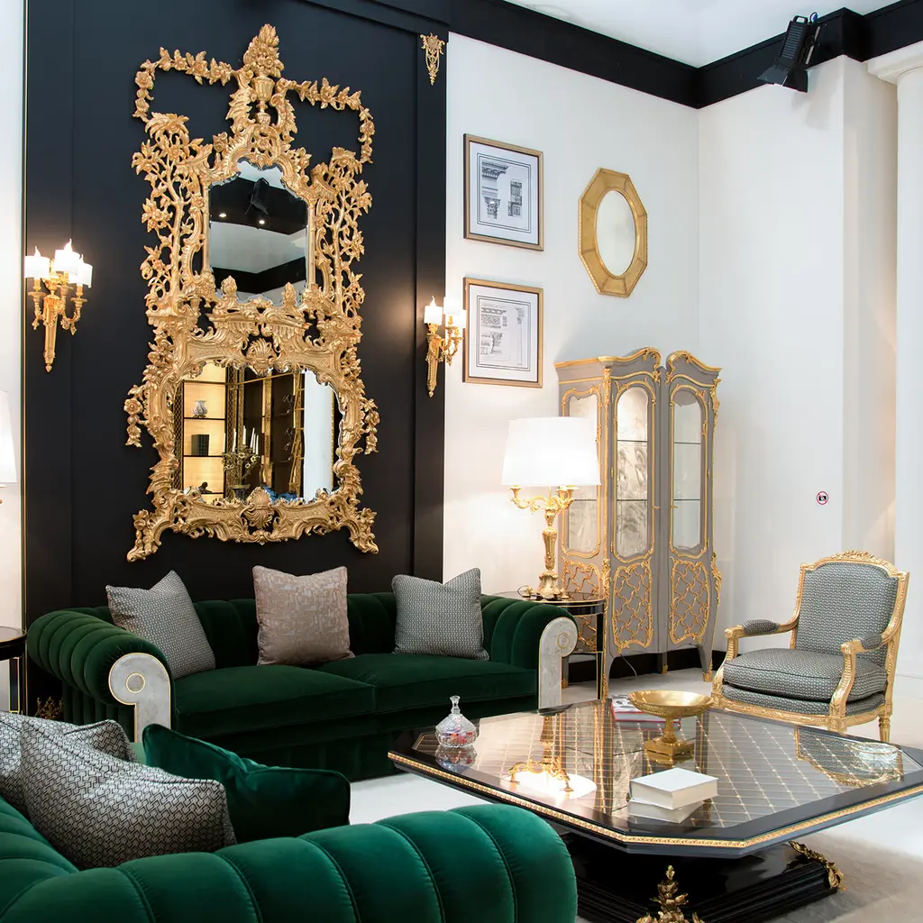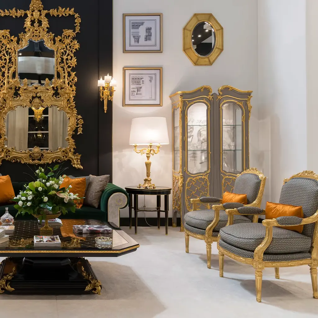 A magnificent design that combines comfort and sophistication, this splendid armchair will make a stately and iconic addition to a classic living area. Handcrafted of beechwood finished with gold leaf, it is decorated with leafed details and enriched with upholstered armrests. The upholstery is made of a refined patterned fabric. Please refer to the Concierge for more information.