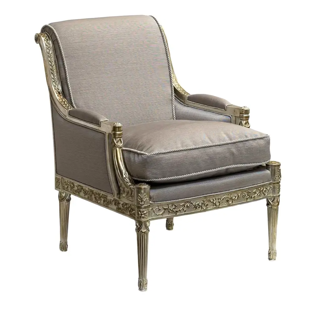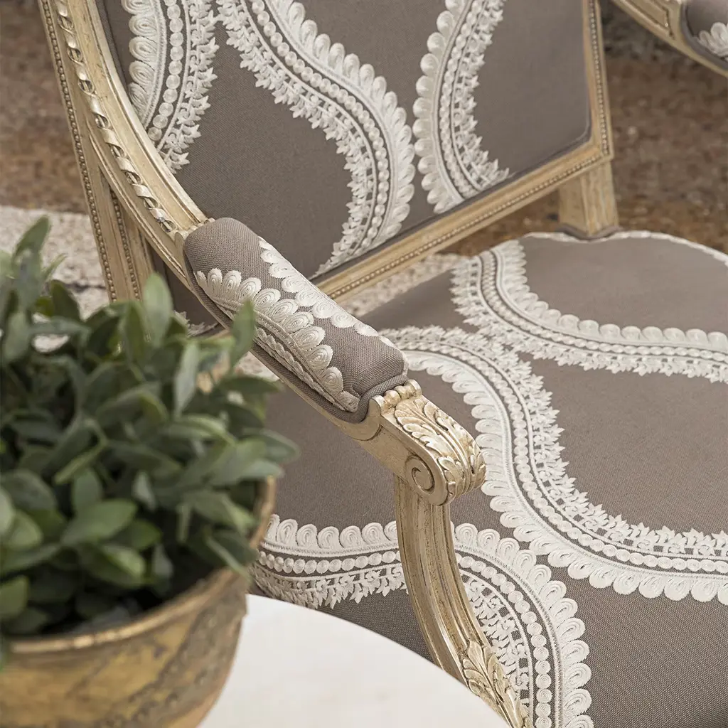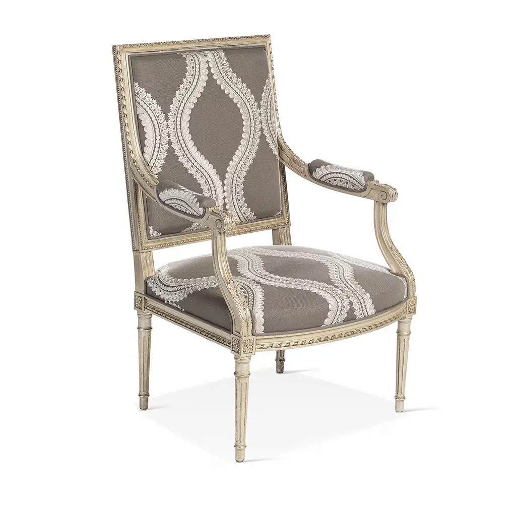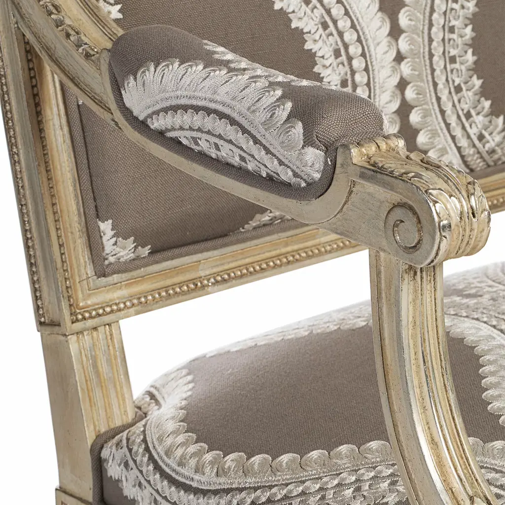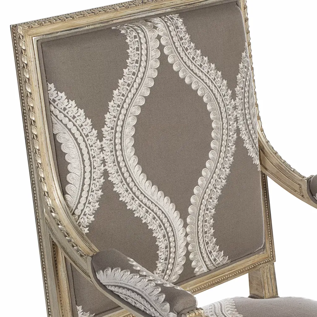 Inspired by the sumptuous Louis XVI's court, this beech armchair is a triumph of elefant profiles ennobled by minutely carved details. A delicate beige tone marks the graceful beech structure, while sinuous lace-like embroideries neatly emerge from the gray fabric upholstery sealing the richly padded seat, backrest, and armrests.