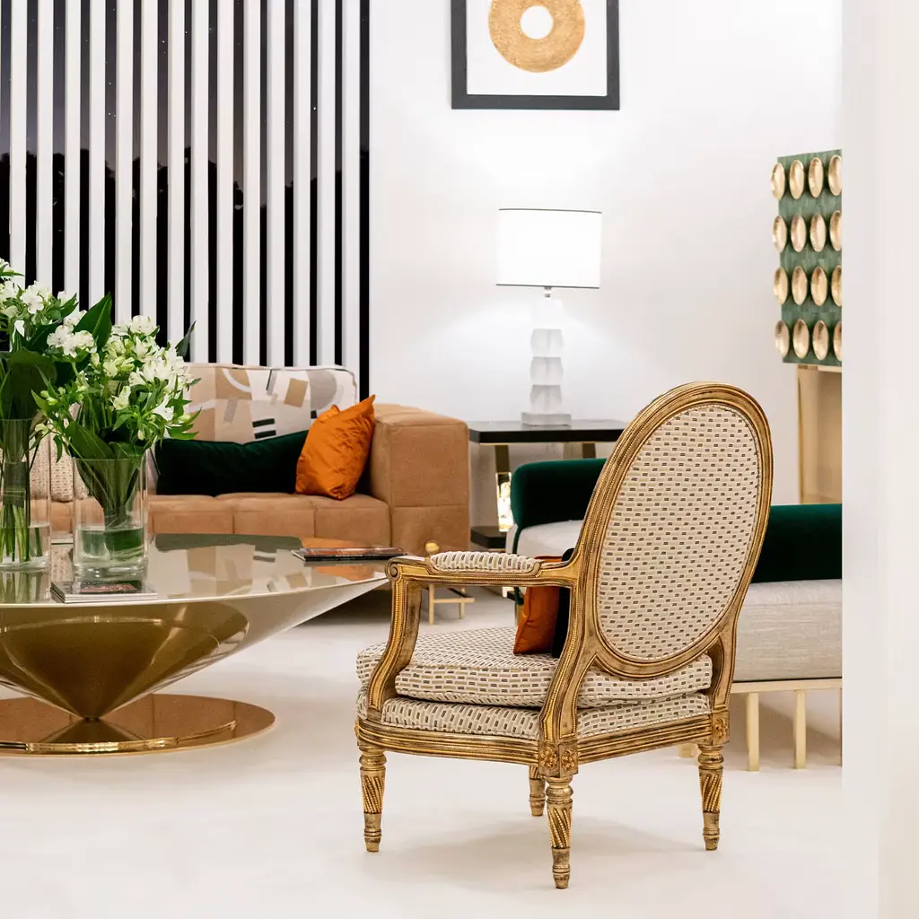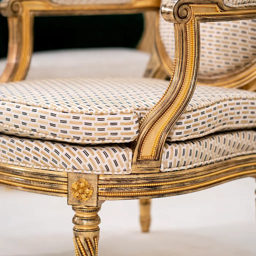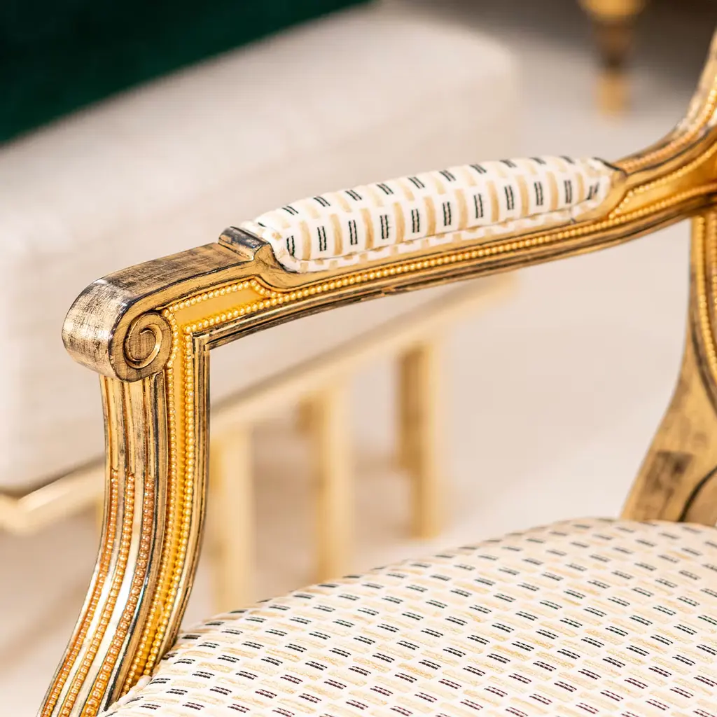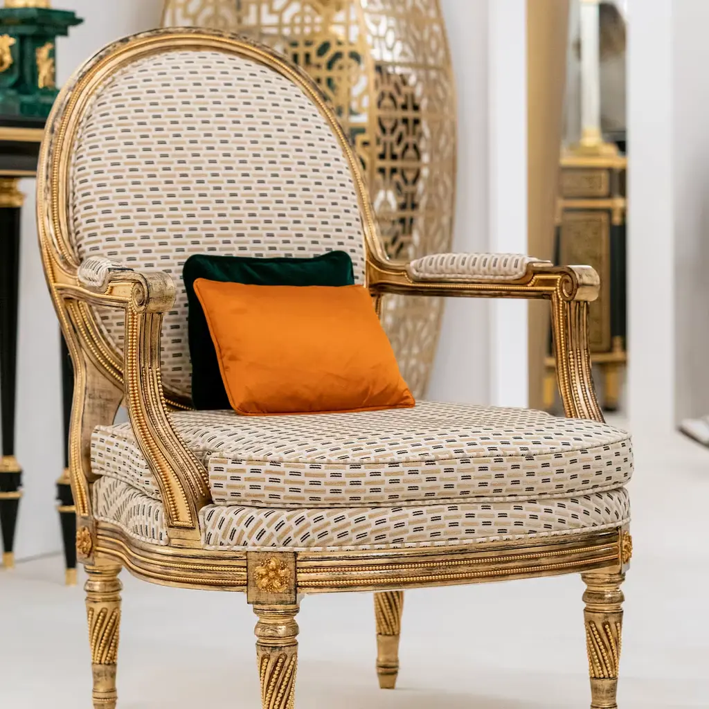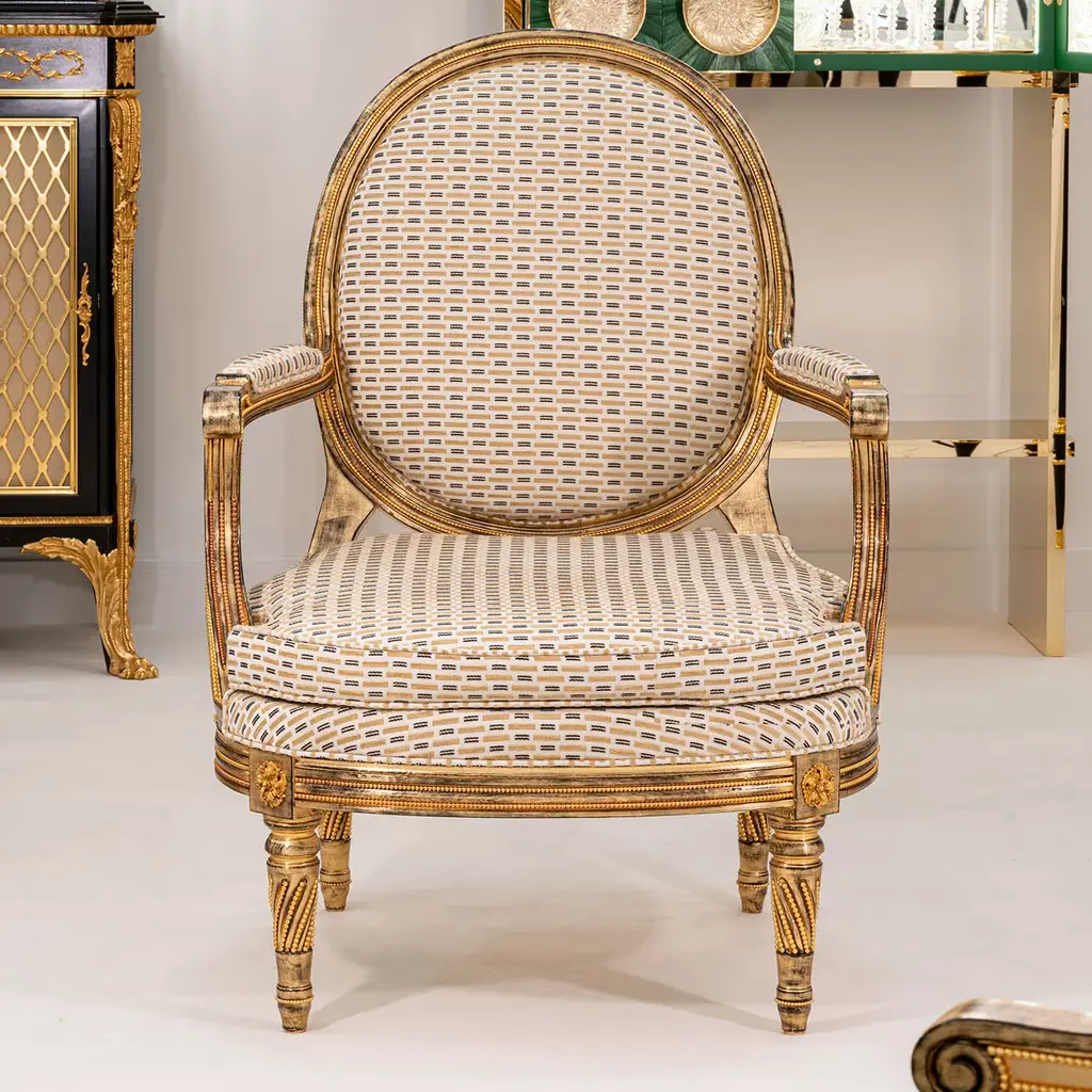 Intricate and extensive carved detailing made regal by a generous gold leaf layer on black bole lends this armchair its unmistakable regal flair. Inspired by the grandeur of Louis XVI's court, it is also characterized by a captivating geometric-inspired fabric upholstery extending to the armrests and oval backrest, inspiring moments of impeccable comfort.