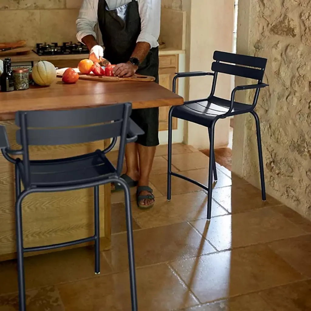 Enjoy a modern twist on a classic design. Designed as an ode to the legendary armchairs found in Jardin du Luxembourg, the Luxembourg High Armchair, Set of 2 by Fermob features clean lines and a bolstered height. Its tubular Aluminum frame supports 3 design elements that make this chair such a classic: curved slatted seat, curved slatted backrest, and slatted armrests. Made to reach countertops, this stackable high armchair is an optimal addition to bar-height tables.