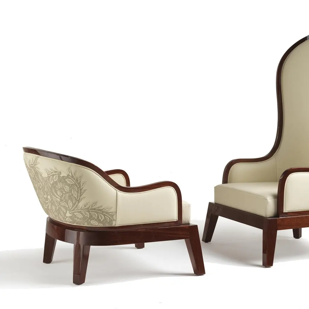 An ideal piece to lounge with a good book or enjoy the company of friends and family after dinner, this armchair features a stunning combination of comfort and elegant design. The structure in wood is finished in a rich mahogany shade that contrasts with the beige leather cover of its body, both on the inside and the outside. The seat is 44 cm high, enclosed in the embrace of the low armrest and reclined backrest. A superb object of functional decor, this piece can be showcased also in the middle of a room, thanks to the striking laser decorations in leather on its back.
