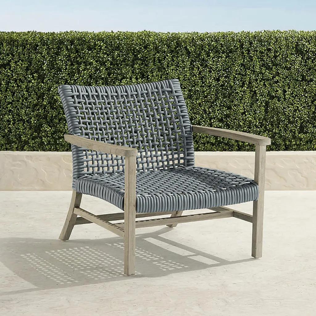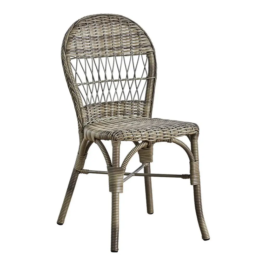 A modern interpretation of a classic Parisian bistro chair, this eye-catching piece is handcrafted of rattan and woven with polyresin wraps for added strength and durability. Its gray-and-white seat pops against the natural finish on its X-shaped stretcher and frame. Stacks for easy storage. Suitable for indoor use only.