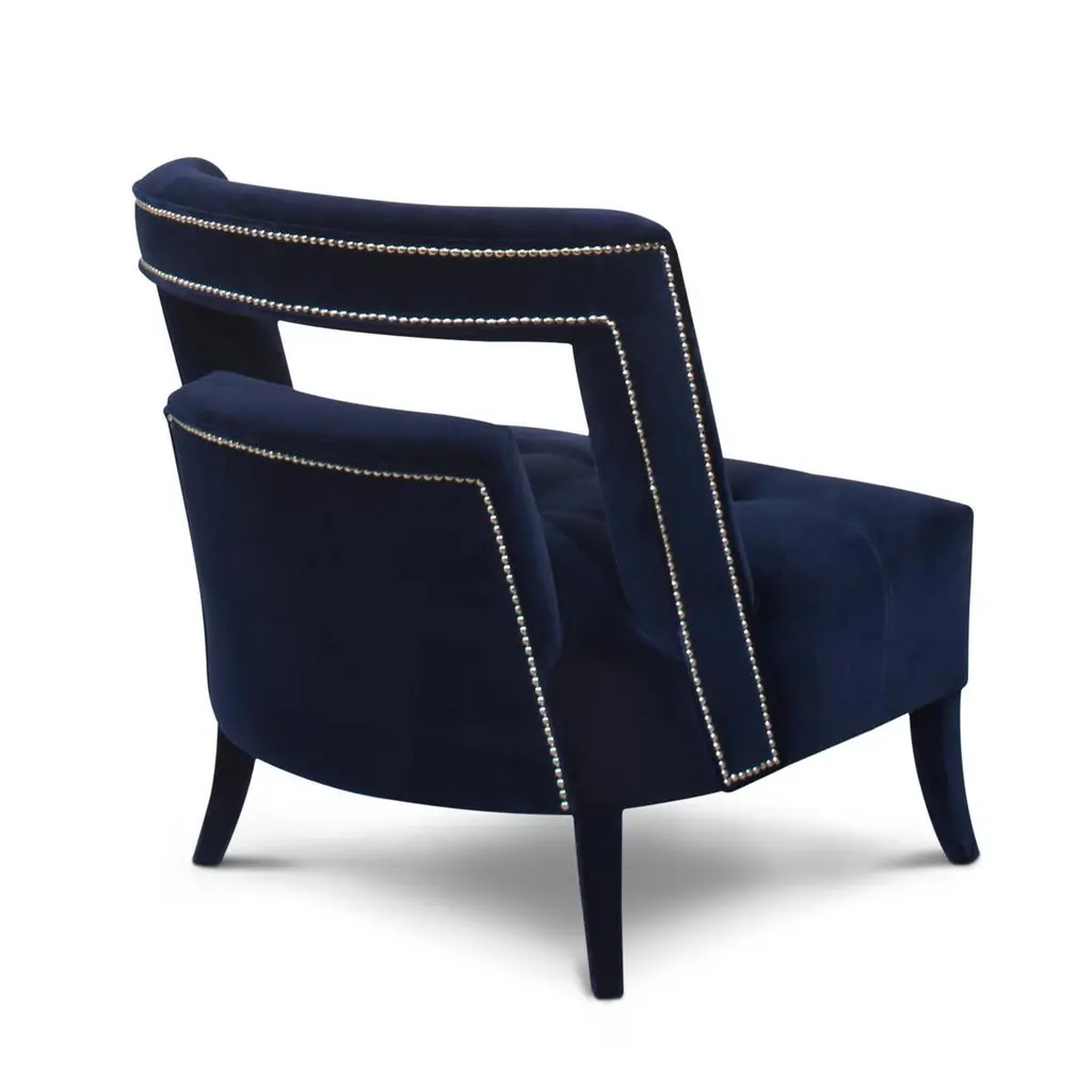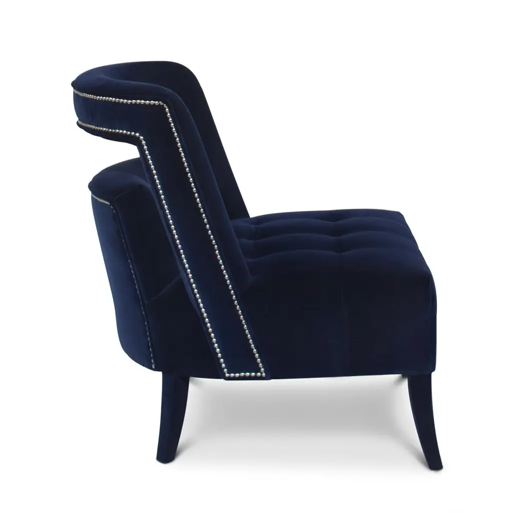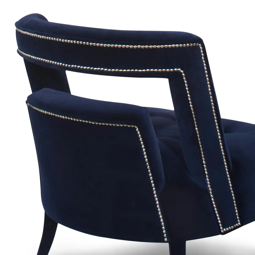 Armchair Mahal with structure in solid wood upholsteredand covered with deep blue velvet fabric. Feet are coveredwith deep blue velvet fabric too. With nails in nickel finish.Also available with other fabrics on request.