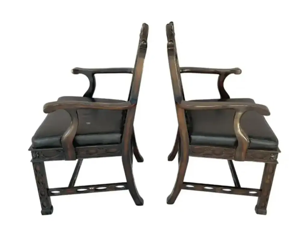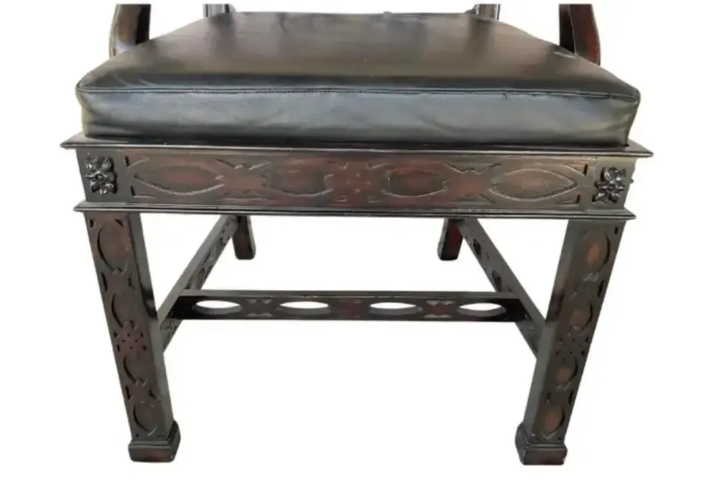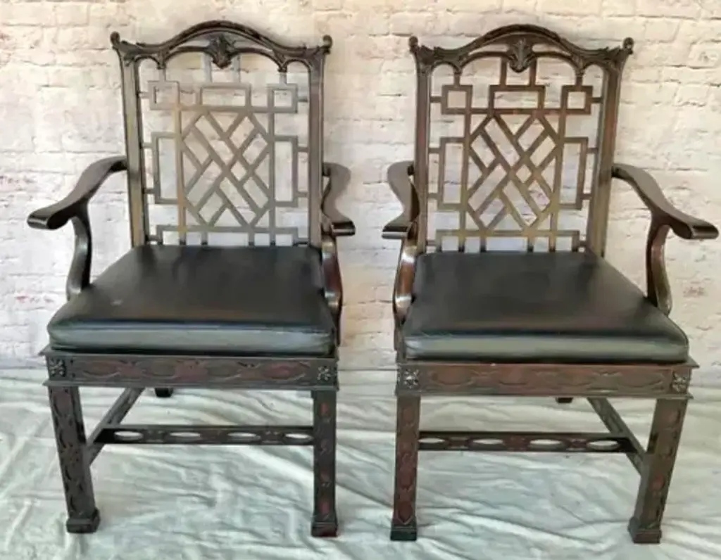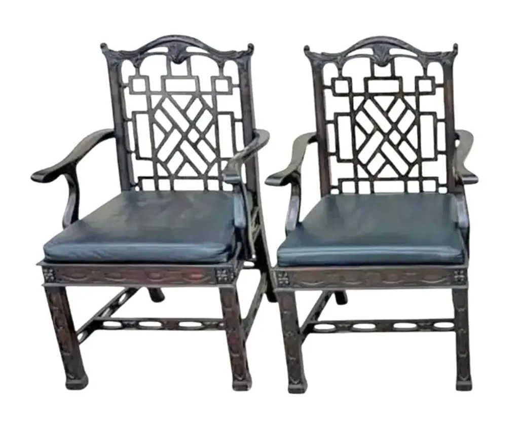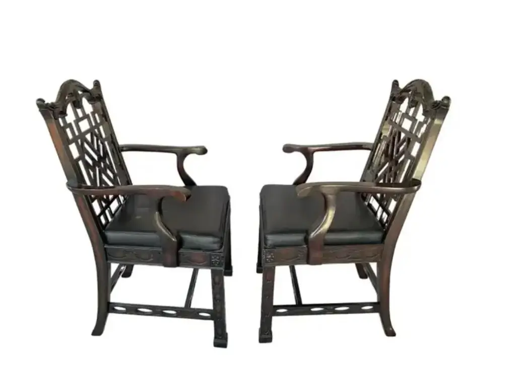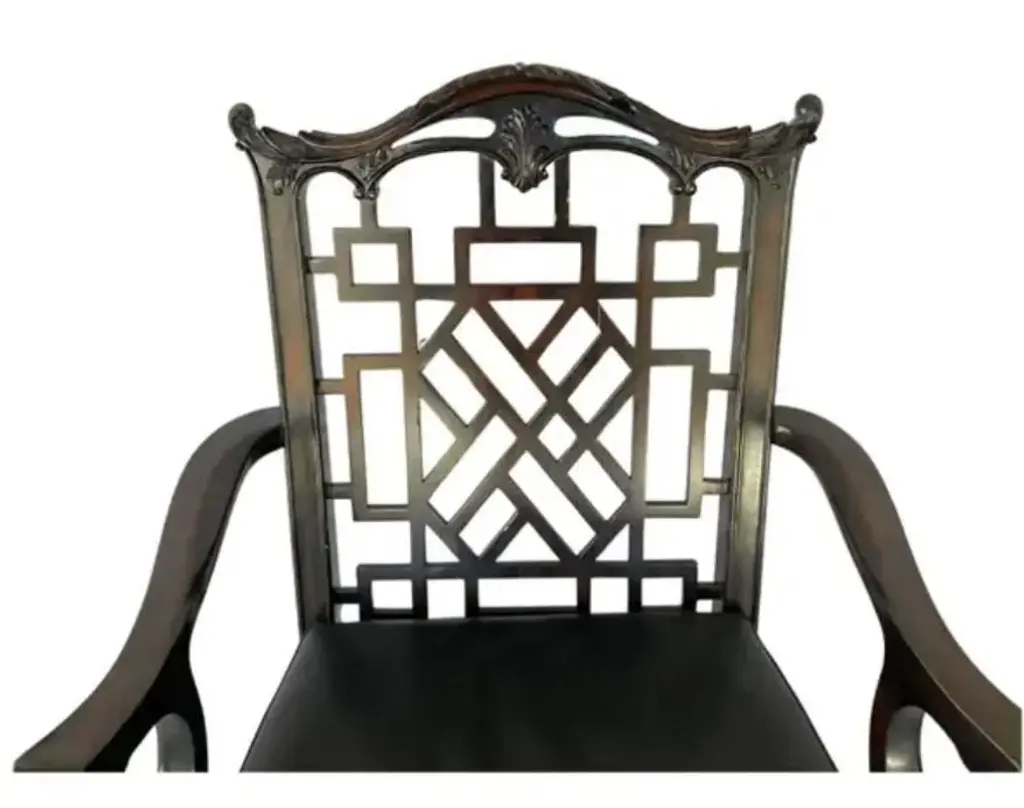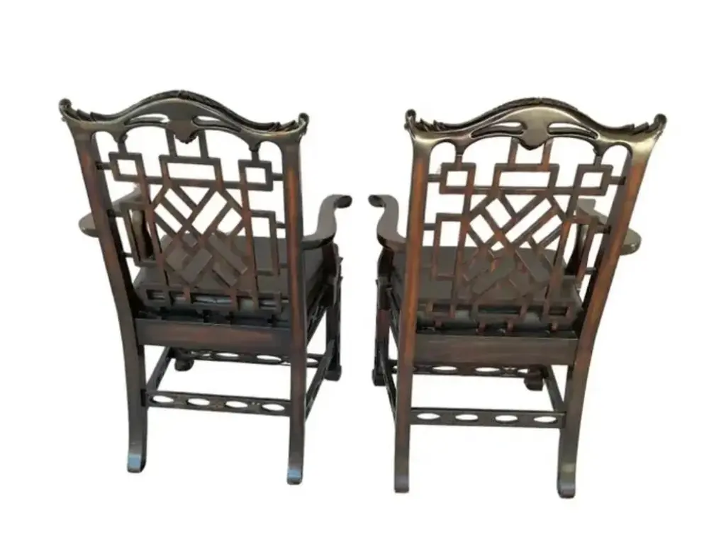 A pair of two refined and rare Maitland Smith Armchairs. Chairs are crafted in the Chinese Chippendale style and feature intricately pierced lattice backs, gracefully curved arms, and a rich, hand-carved mahogany frame with subtle Asian motifs and fretwork details. They have black leather seats with pierced stretchers. These chairs are perfect for eclectic, traditional, Hollywood Regency, or transitional interiors. Maitland-Smith stamp on underside of chair.