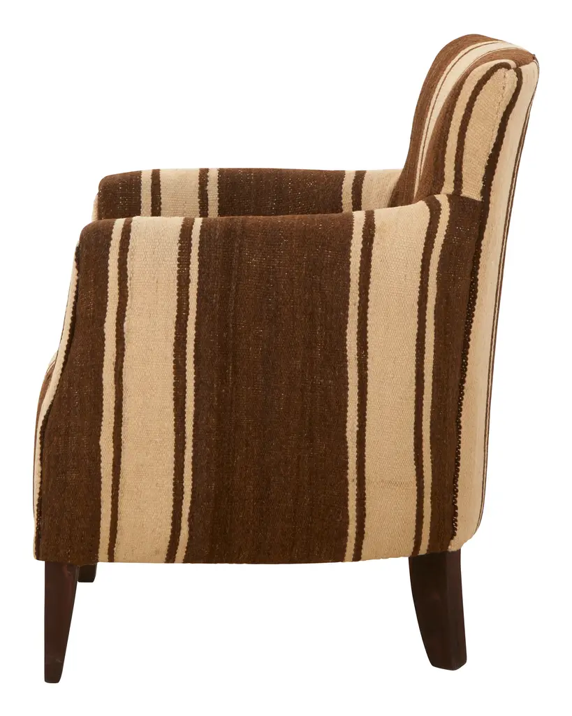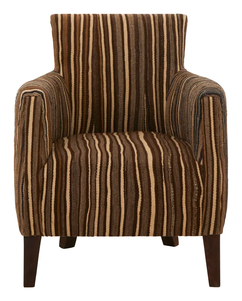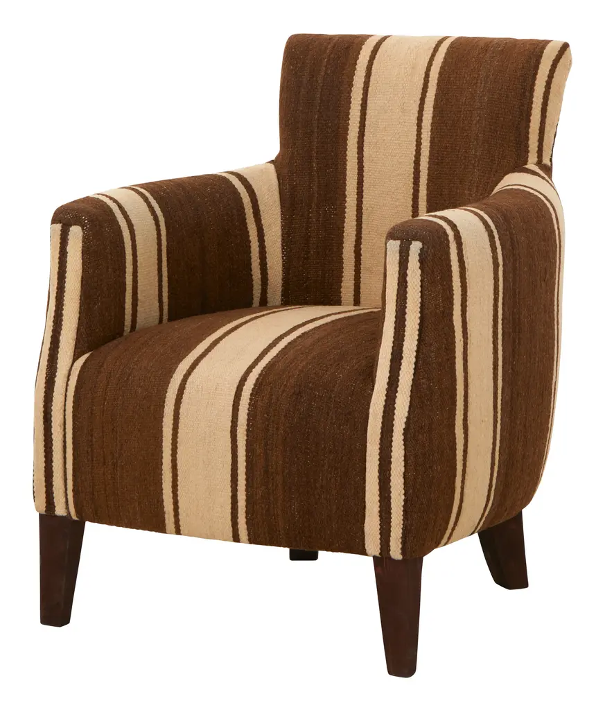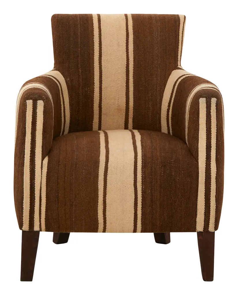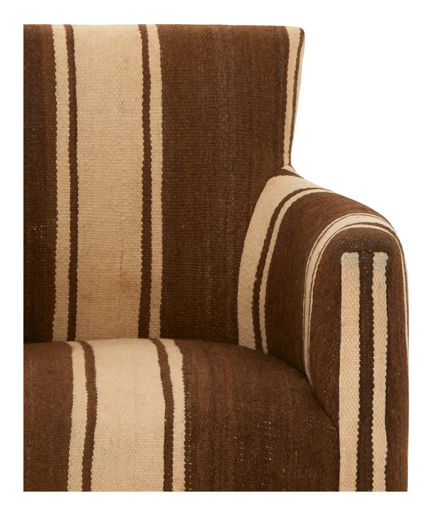 Showcase the beauty of traditional textiles in a fresh way with our Majid Chair. Simple and timeless in shape, this scaled-down armchair is upholstered in a one-of-a-kind striped kilim blanket, which was handwoven from sheep’s wool and dyed in neutral shades of brown by skilled Berber tribeswomen in Morocco’s Atlas Mountains. A unique combination of global and traditional style, it also offers an enveloping, comfortably upright sit thanks to its rounded, supportive back rest, firm seat cushion and two perfectly placed, low-lying armrests. Great for adding a layer of texture and character to just about any room, we love Majid as a single in a cozy reading nook or as a not-so-matching pair in a classic, collected living room. •upholstered in one-of-a-kind kilim blanket handwoven in morocco•matte black wood finish•morocco•each is unique; variations in upholstery's color and pattern should be expected Dimensions•27.5"W x 26.75"D x 32"H•arm height: 24"•seat width: 18"•seat depth: 20.5"•seat height: 17" •up to 10 available (pending availability) Each of our Majid Chairs is completely unique and variations should be expected. Please make a note at checkout or send us an email if you would like to receive photos of available options. If we don’t hear from you, we will choose one for you from our selection.