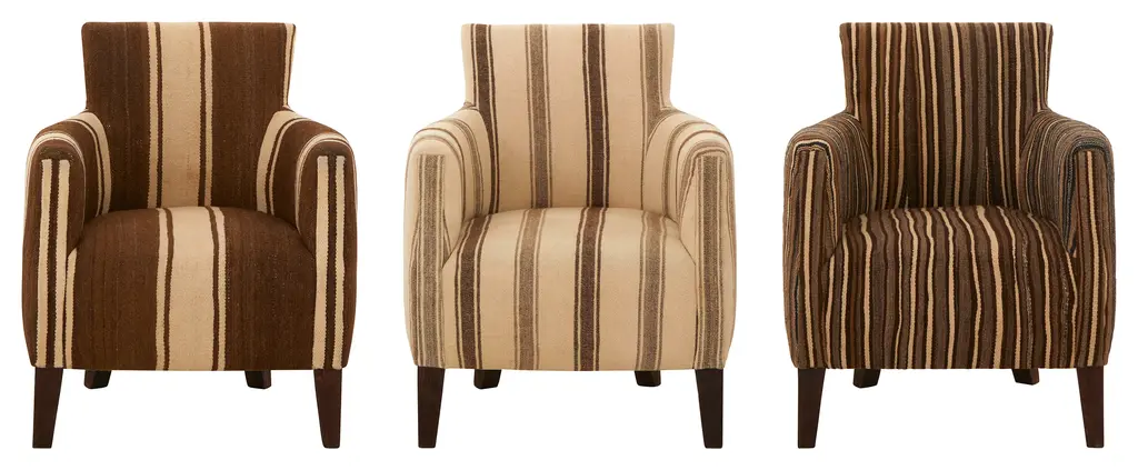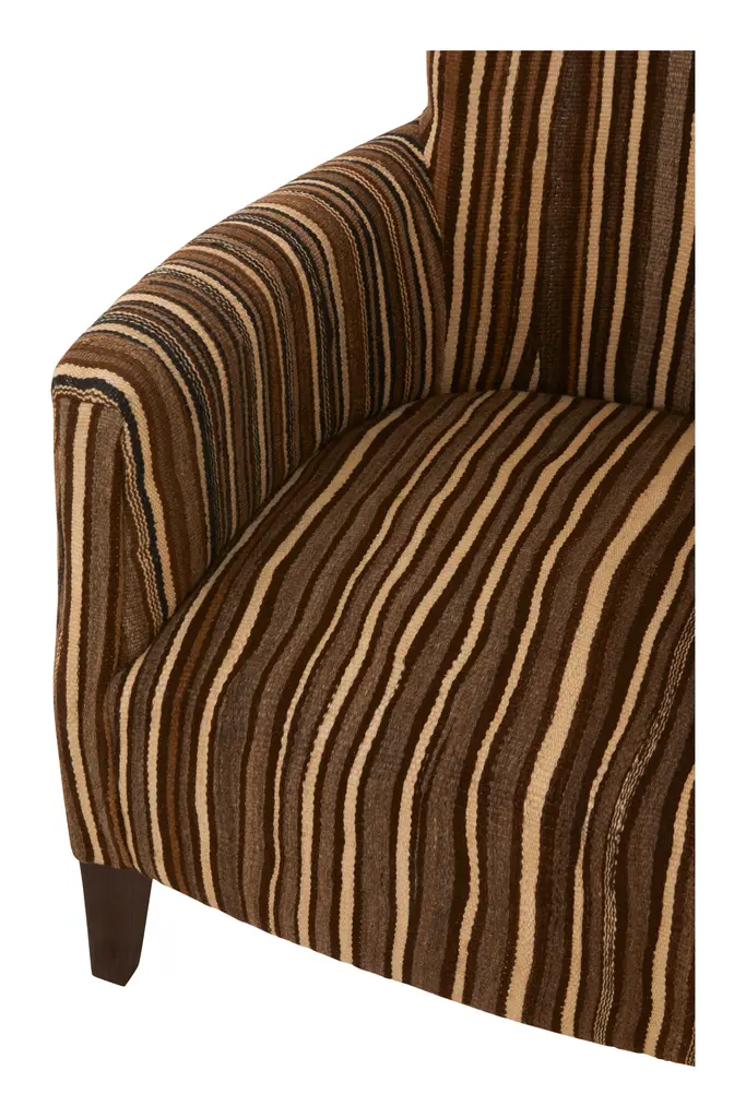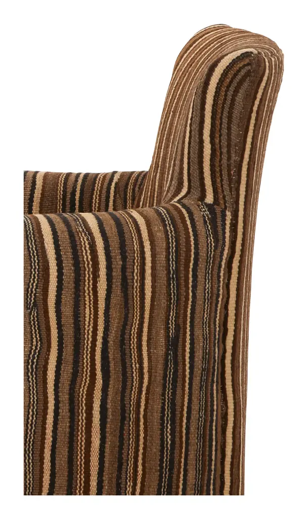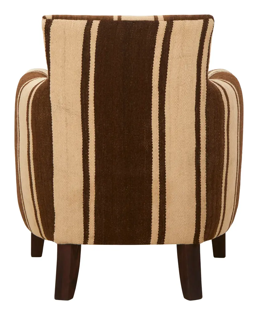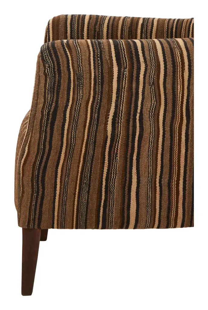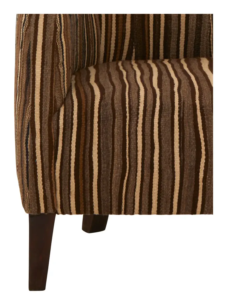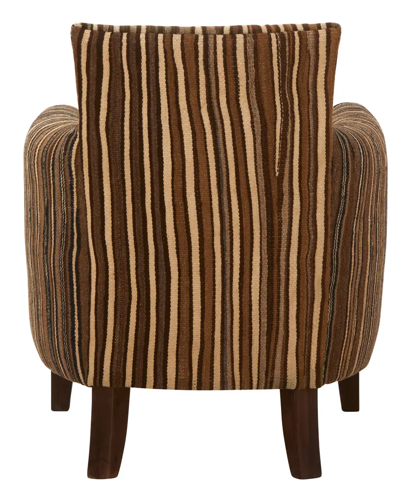 Showcase the beauty of traditional textiles in a fresh way with our Majid Chair. Simple and timeless in shape, this scaled-down armchair is upholstered in a one-of-a-kind striped kilim blanket, which was handwoven from sheep’s wool and dyed in neutral shades of brown by skilled Berber tribeswomen in Morocco’s Atlas Mountains. A unique combination of global and traditional style, it also offers an enveloping, comfortably upright sit thanks to its rounded, supportive back rest, firm seat cushion and two perfectly placed, low-lying armrests. Great for adding a layer of texture and character to just about any room, we love Majid as a single in a cozy reading nook or as a not-so-matching pair in a classic, collected living room. •upholstered in one-of-a-kind kilim blanket handwoven in morocco•matte black wood finish•morocco•each is unique; variations in upholstery's color and pattern should be expected Dimensions•27.5"W x 26.75"D x 32"H•arm height: 24"•seat width: 18"•seat depth: 20.5"•seat height: 17" •up to 10 available (pending availability) Each of our Majid Chairs is completely unique and variations should be expected. Please make a note at checkout or send us an email if you would like to receive photos of available options. If we don’t hear from you, we will choose one for you from our selection.
