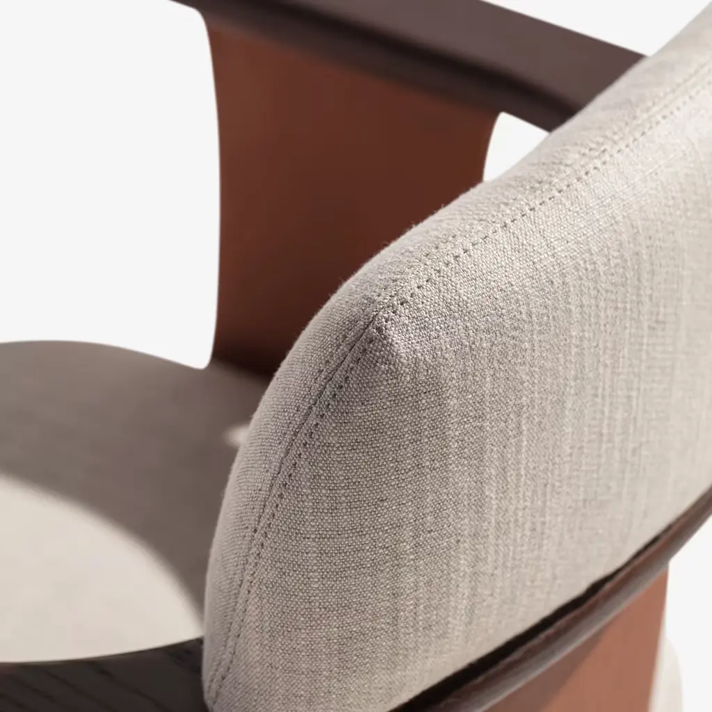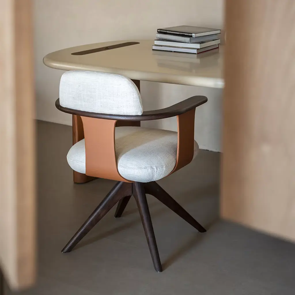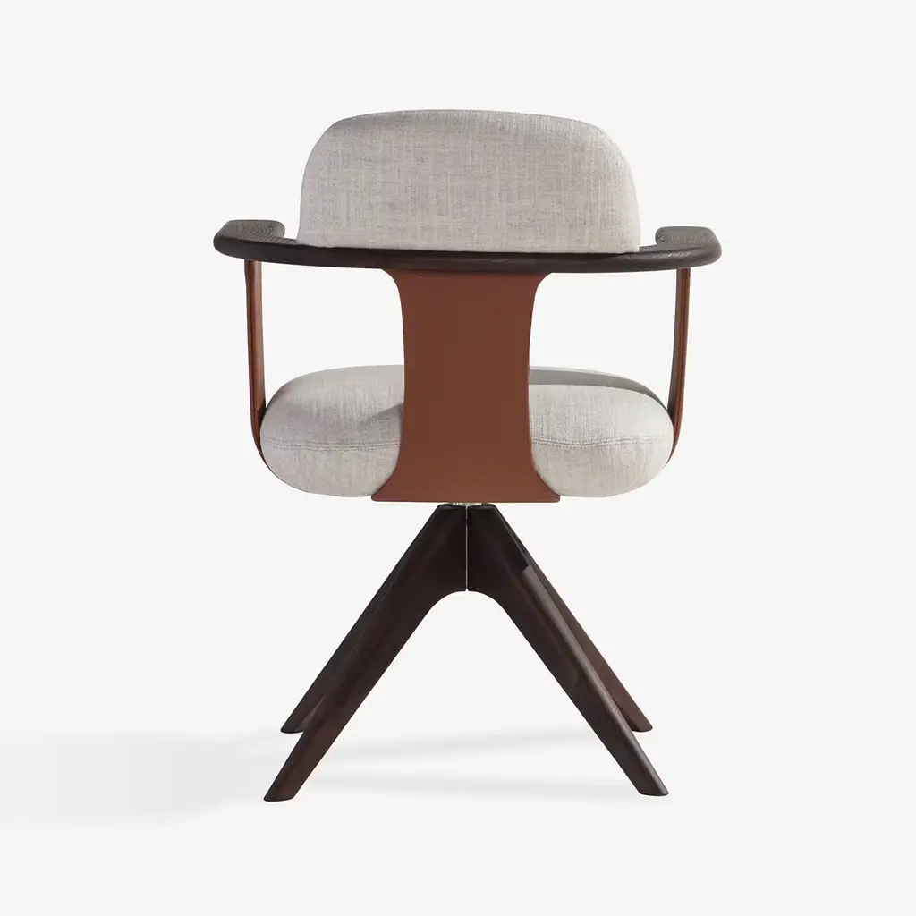 The Manta P Armchair exemplifies modern elegance and functionality, making it an ideal addition to a contemporary space. Its handcrafted leather structure forms the basis for a plush padded seat and supportive backrest, ensuring both comfort and style. The striking contrast of solid wood armrests enhances its aesthetic appeal, seamlessly blending materials and shapes. The chair stands on sturdy, pyramid-shaped legs crafted from solid ash wood, providing enhanced stability while emphasizing meticulous attention to detail. Designed with an ergonomic focus, the Manta P Armchair features a sophisticated construction using EPA certified plywood, fir, and hardboard. This versatile piece allows for full customization. Contact the Concierge for more details.