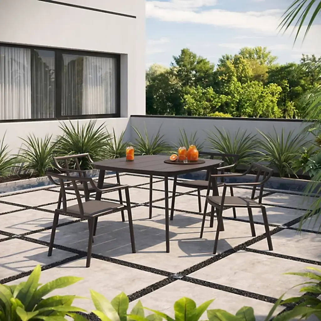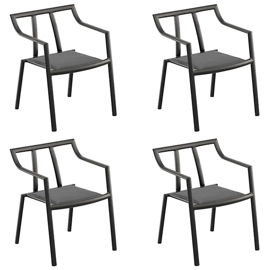 Outdoor seating that is at once simple and substantial. With its clean, minimalist lines and distinctive contours, the Markoe Outdoor Armchair - Set of 4 by Oxford Garden presents with a Far Eastern design sensibility. Its refined strokes are also bold, with wide bars of aluminum providing a sturdy and supportive yet lightweight structure. This armchair’s airy support continues through the seat, which is a composite sling material that is comfortably taut and weather resistant.