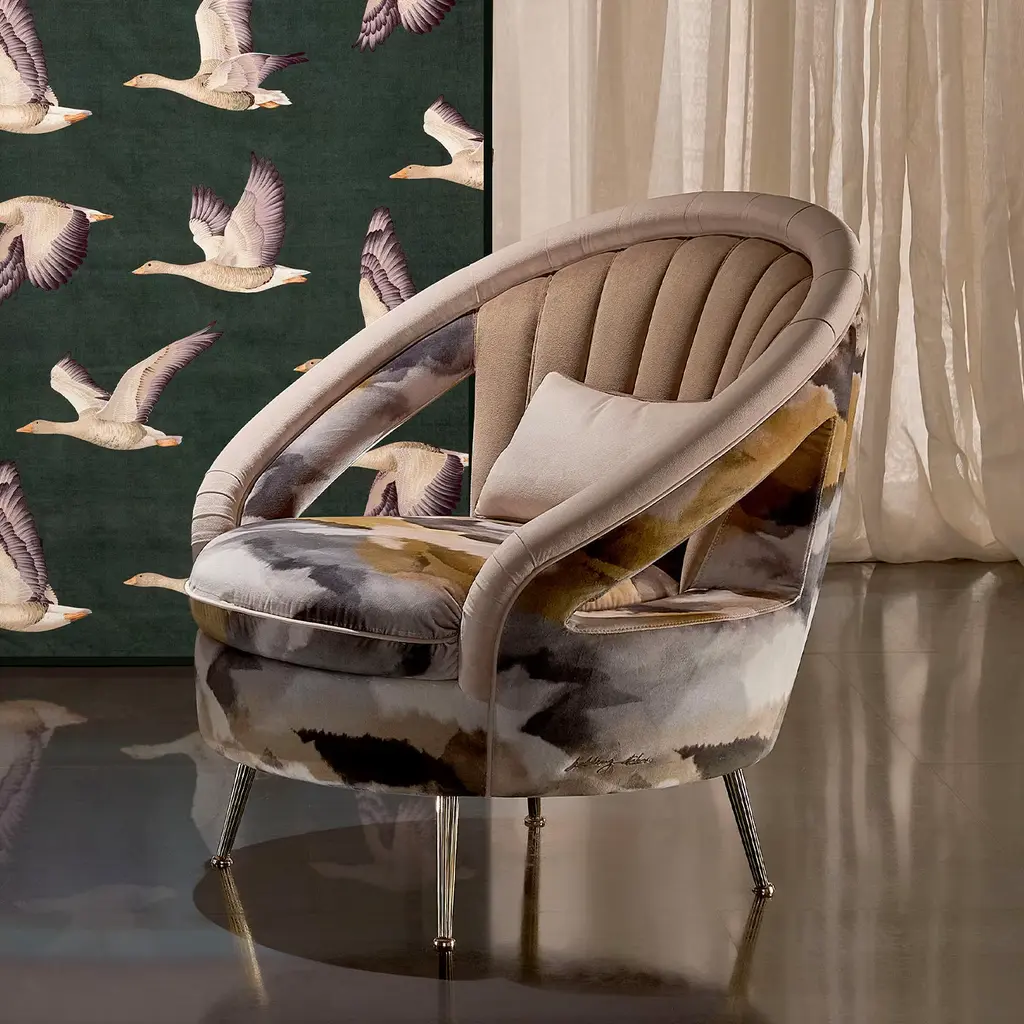This armchair invites to lounge in its plush embrace, combining glamour and sleekness. The structure in solid wood is shaped to create a shell-like design that, together with the mottled-style fabric upholstery - suggests a visionary artistic potential. Raised on stiletto metal feet, the body is finished with a beige fabric covering the edge and inner side of the backrest enlivened by a channeled quilted texture.