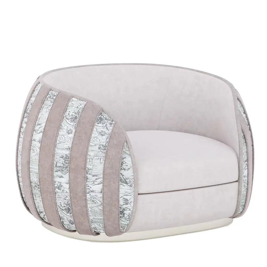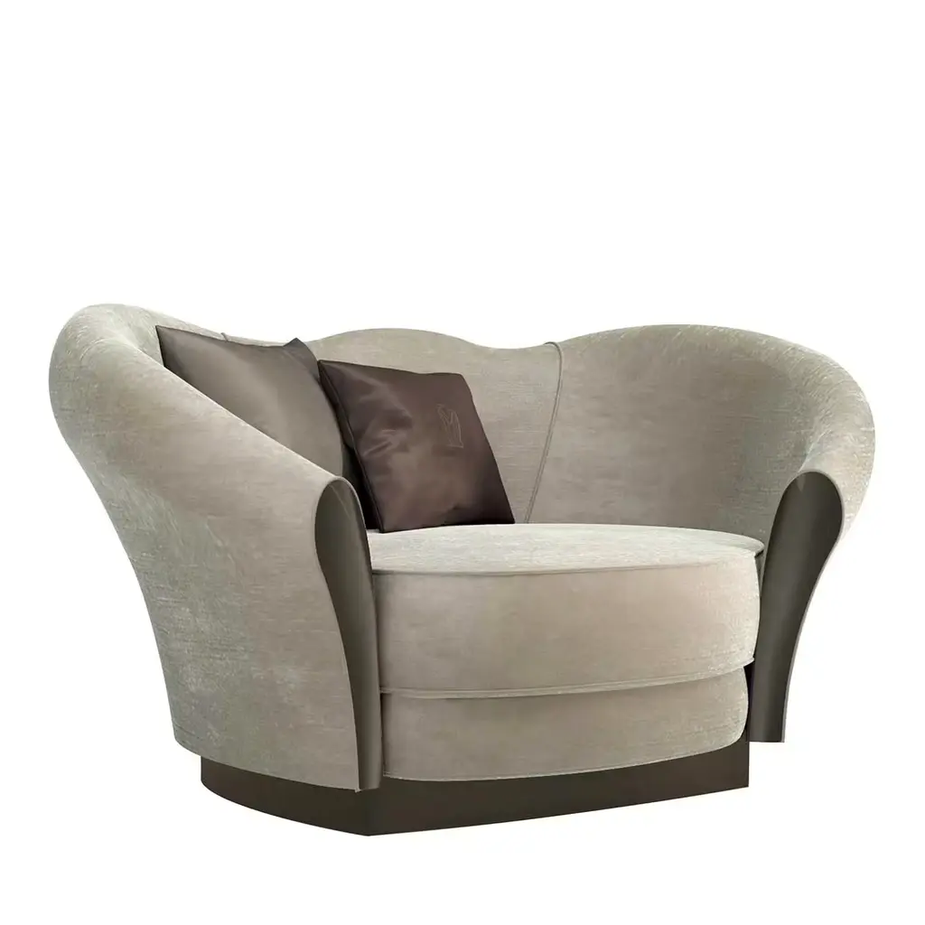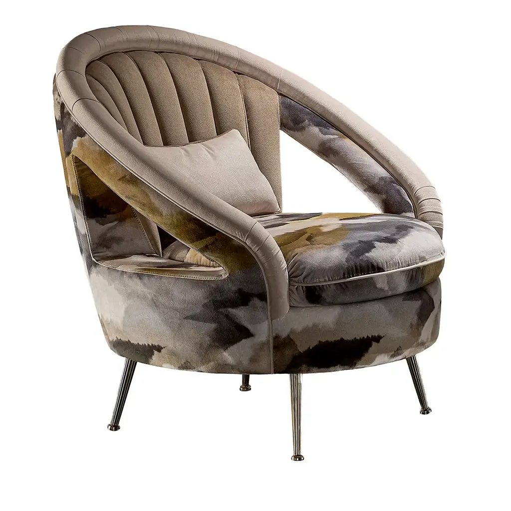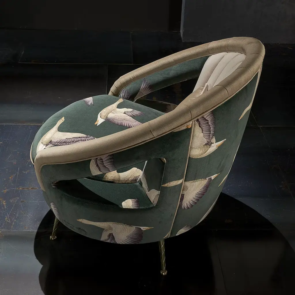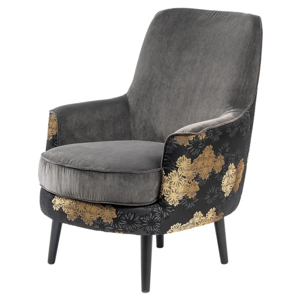 A meticulous showcase of traditional craftsmanship and an elegant testament to modern sophistication, this armchair is distinguished by two velvet fabric upholsteries, rendered in plain and nature-inspired patterns. Rounded and enveloping, it features a solid wood frame padded with polyurethane. Customizable in size, please contact the Concierge for more information.