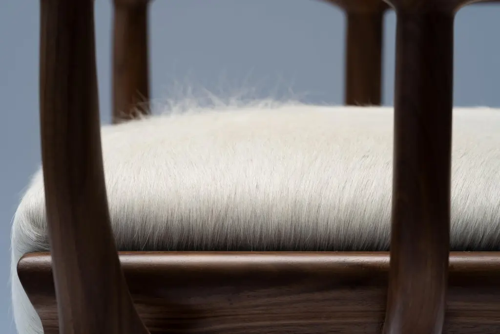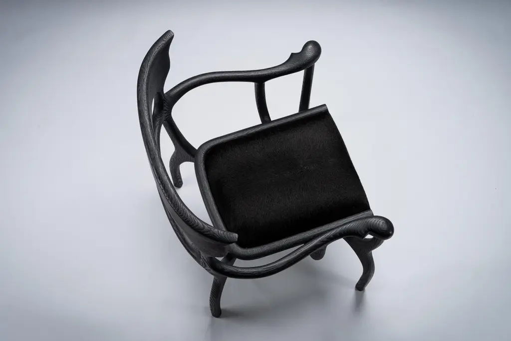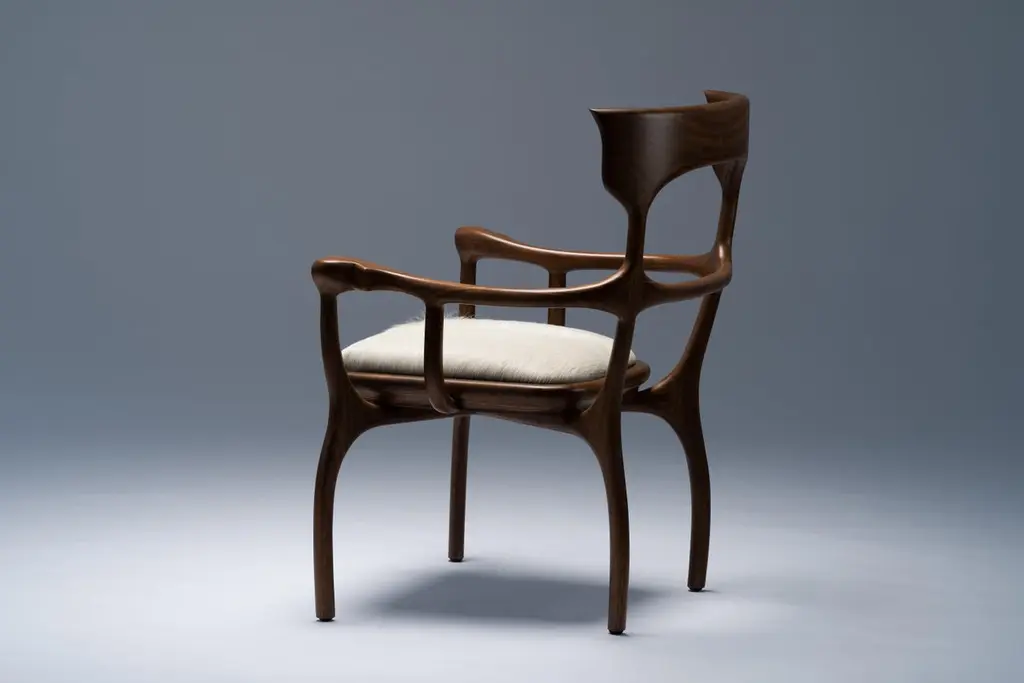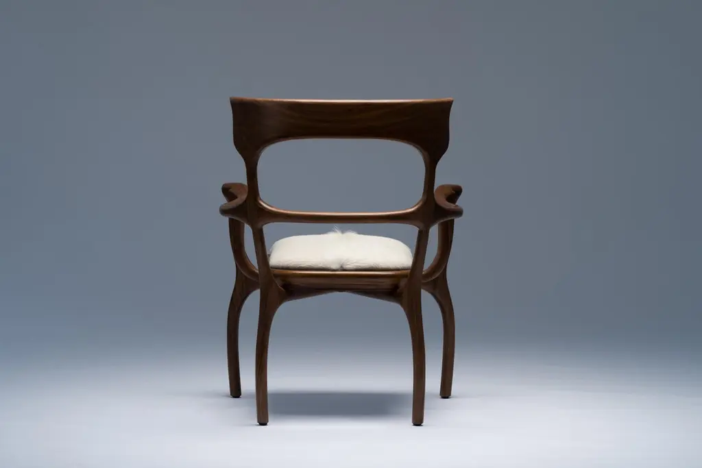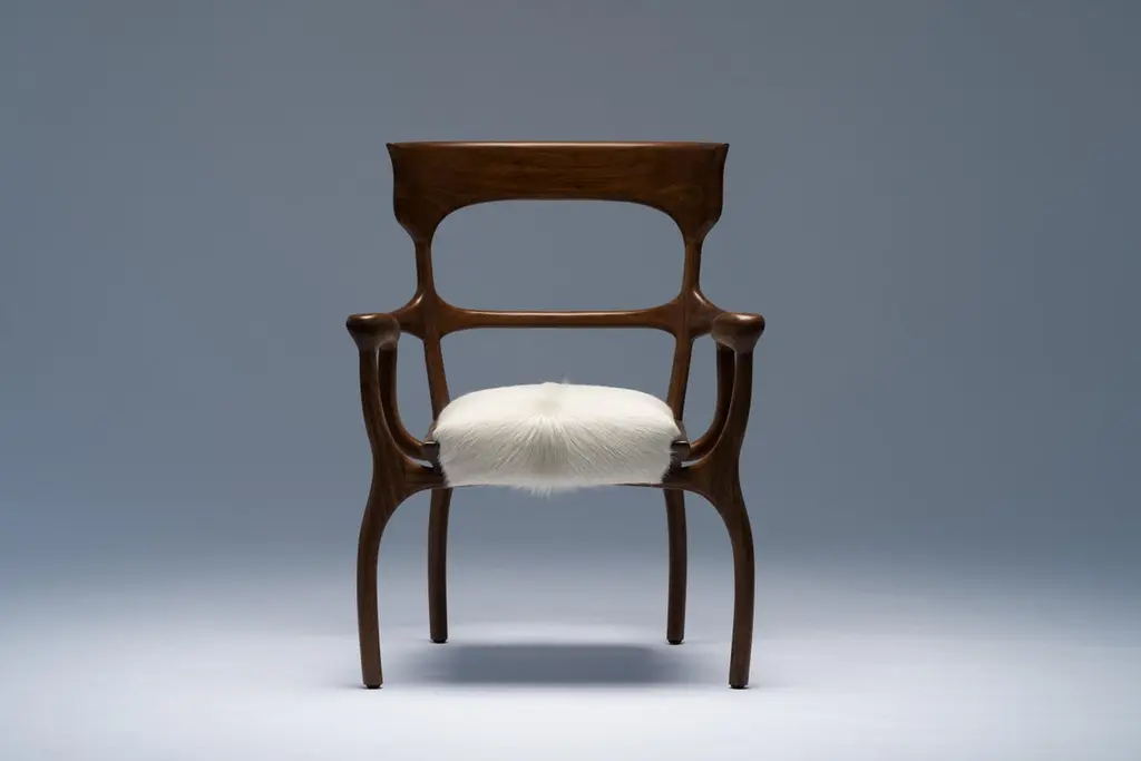 MARTA chair by Mandy Graham MARTAM01, chair armchairAmerican walnut or sandblasted white oak, hairy cowhide seatMeasures: 27" W x 25" D x 36"A statement collection that embodies luxury and bespoke design. The exquisite sculptural frames available in oiled walnut or ebonized sandblasted oak are paired with rich cowhide. Stunning curved silhouettes accompanied by structural simplicity are a memorable experience for your home. Handcrafted in Los Angeles by the skilled hands of select local tradesmen.It is with their unmeasured patience, commitment and soul behind every piece that reminds us of something essential... art.Mandy Graham collection.