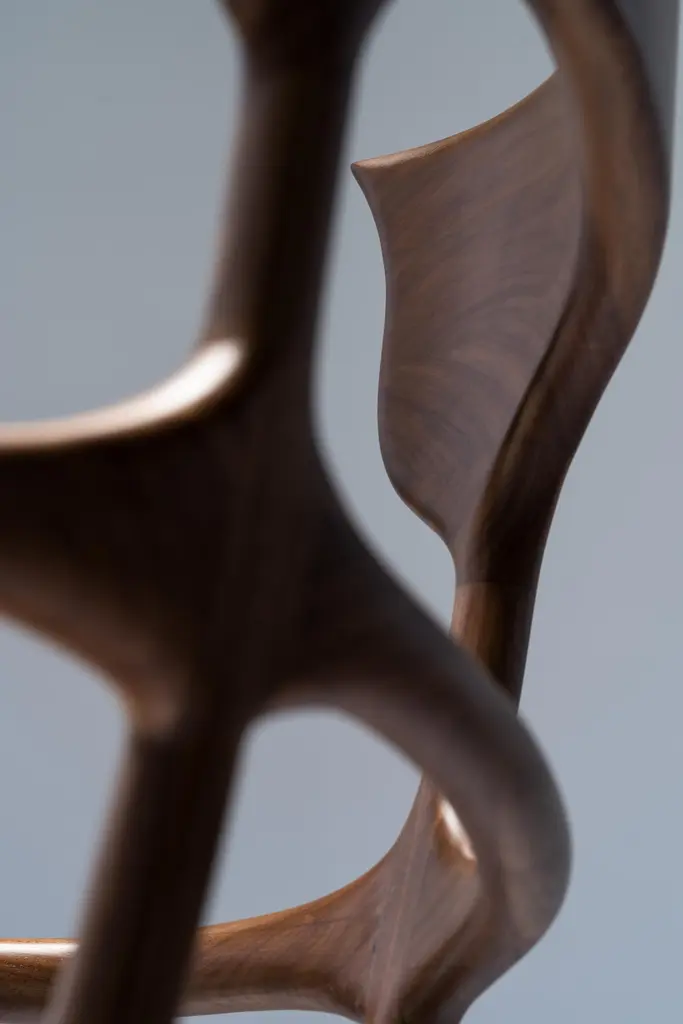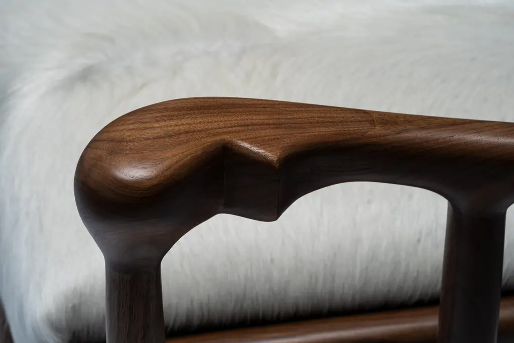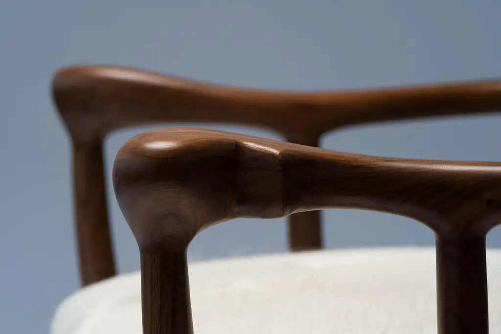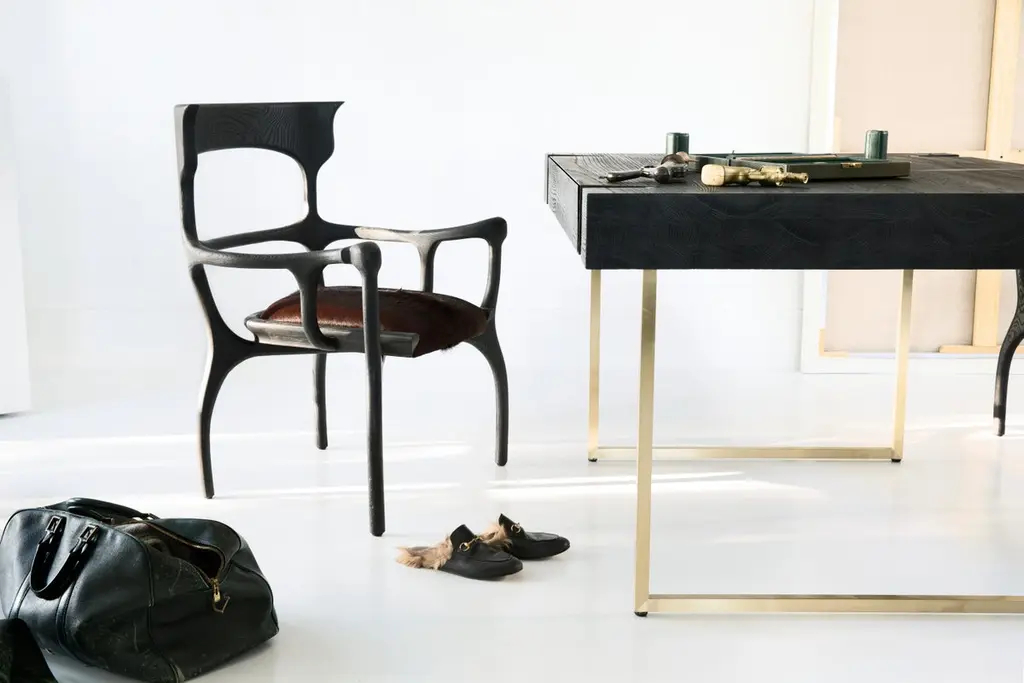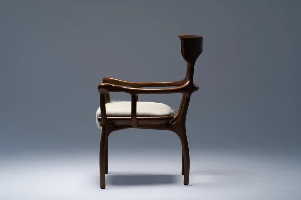 MARTA chair by Mandy Graham MARTAM01, chair armchairAmerican walnut or sandblasted white oak, hairy cowhide seatMeasures: 27" W x 25" D x 36"A statement collection that embodies luxury and bespoke design. The exquisite sculptural frames available in oiled walnut or ebonized sandblasted oak are paired with rich cowhide. Stunning curved silhouettes accompanied by structural simplicity are a memorable experience for your home. Handcrafted in Los Angeles by the skilled hands of select local tradesmen.It is with their unmeasured patience, commitment and soul behind every piece that reminds us of something essential... art.Mandy Graham collection.