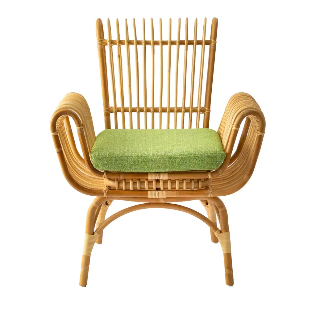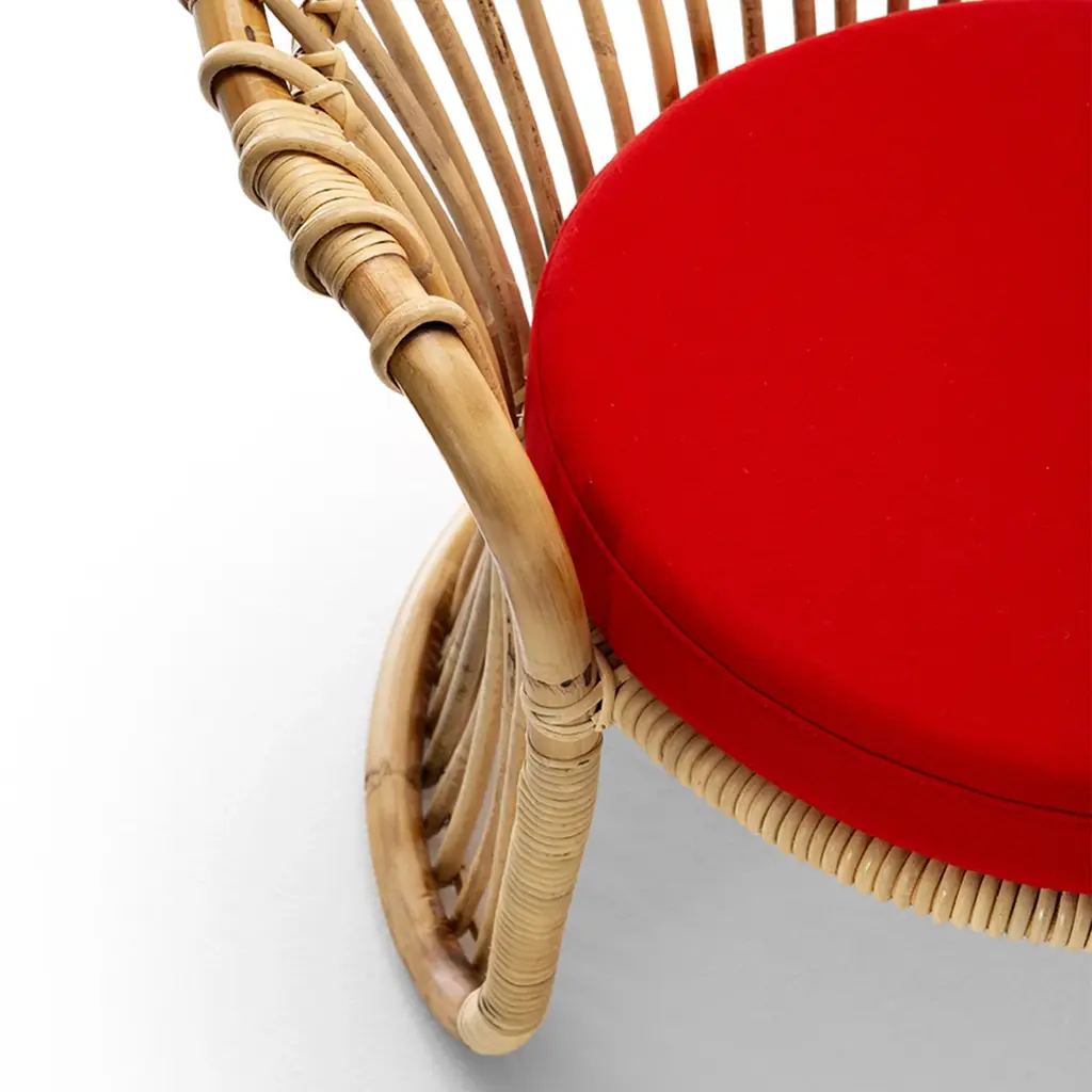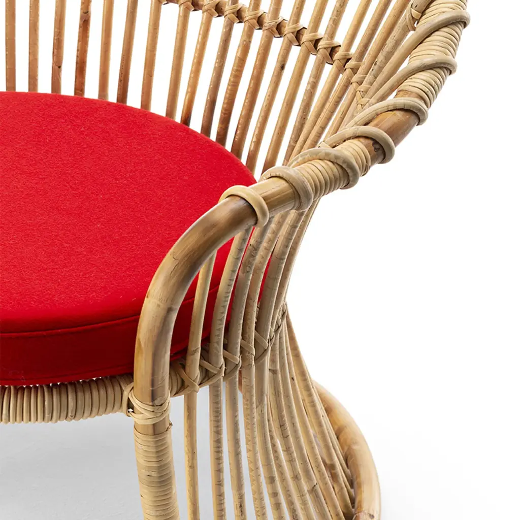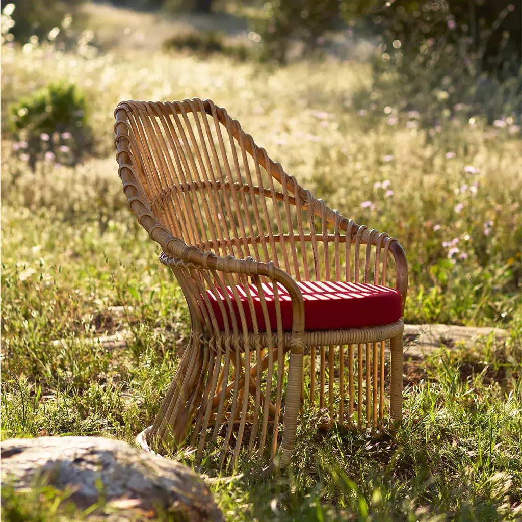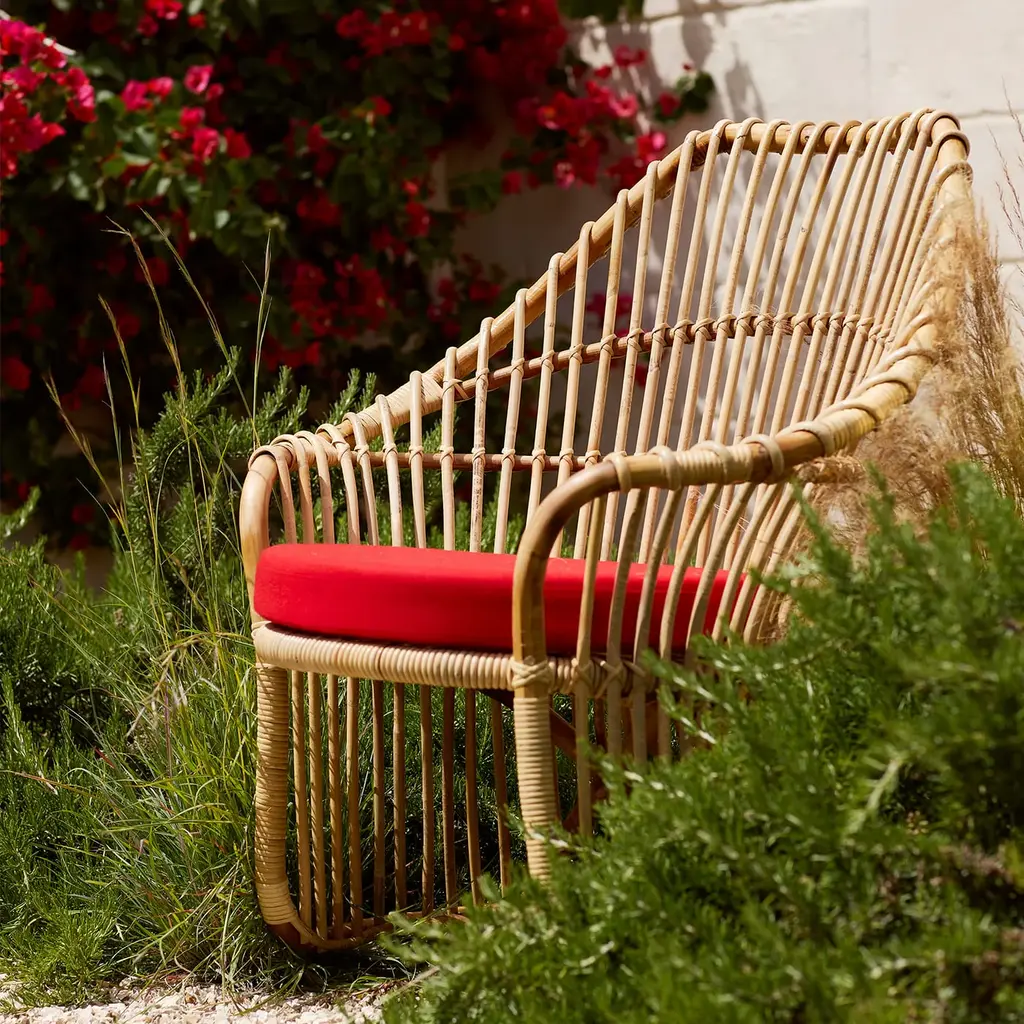 Sculptural and airy thanks to its intriguing rattan structure, this outdoor armchair is an exclusive re-edition of a 1959 design by Marco Zanuso. Masterful manual crafting and thermo-forming techniques lead to its dynamic and enveloping silhouette that, sinuous and elegant, promises impeccable comfort with its sloped profiles and colorful seat cushion. Durable and resistant, the piece is also available in a darker - "barrique" - finish. If the products are placed completely outside, nightcovers that can be purchased at an extra price are recommended. Please contact the Concierge for further information.
