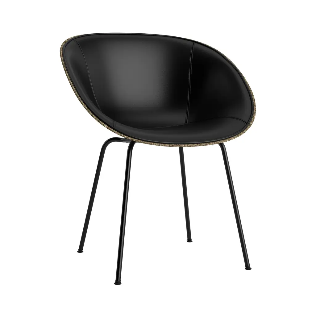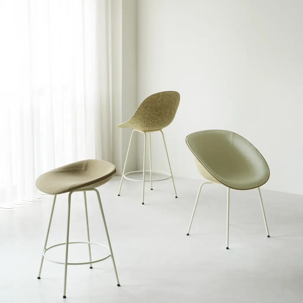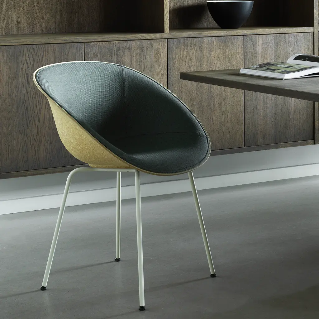 With its inviting contours and eco-friendly design, Mat’s molded armchair gets a personalizing touch with fine fabric or leather front upholstery and a choice of leg colors. The attractively variegated shell updates a Nordic classic in a recyclable composite material made of hemp and seaweed, an innovation from Danish designers Foersom & Hiort-Lorenzen.
