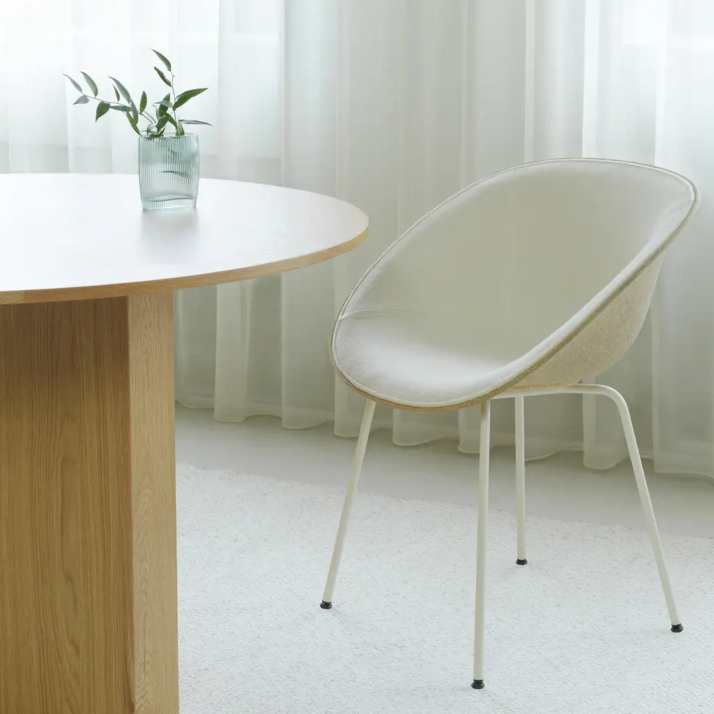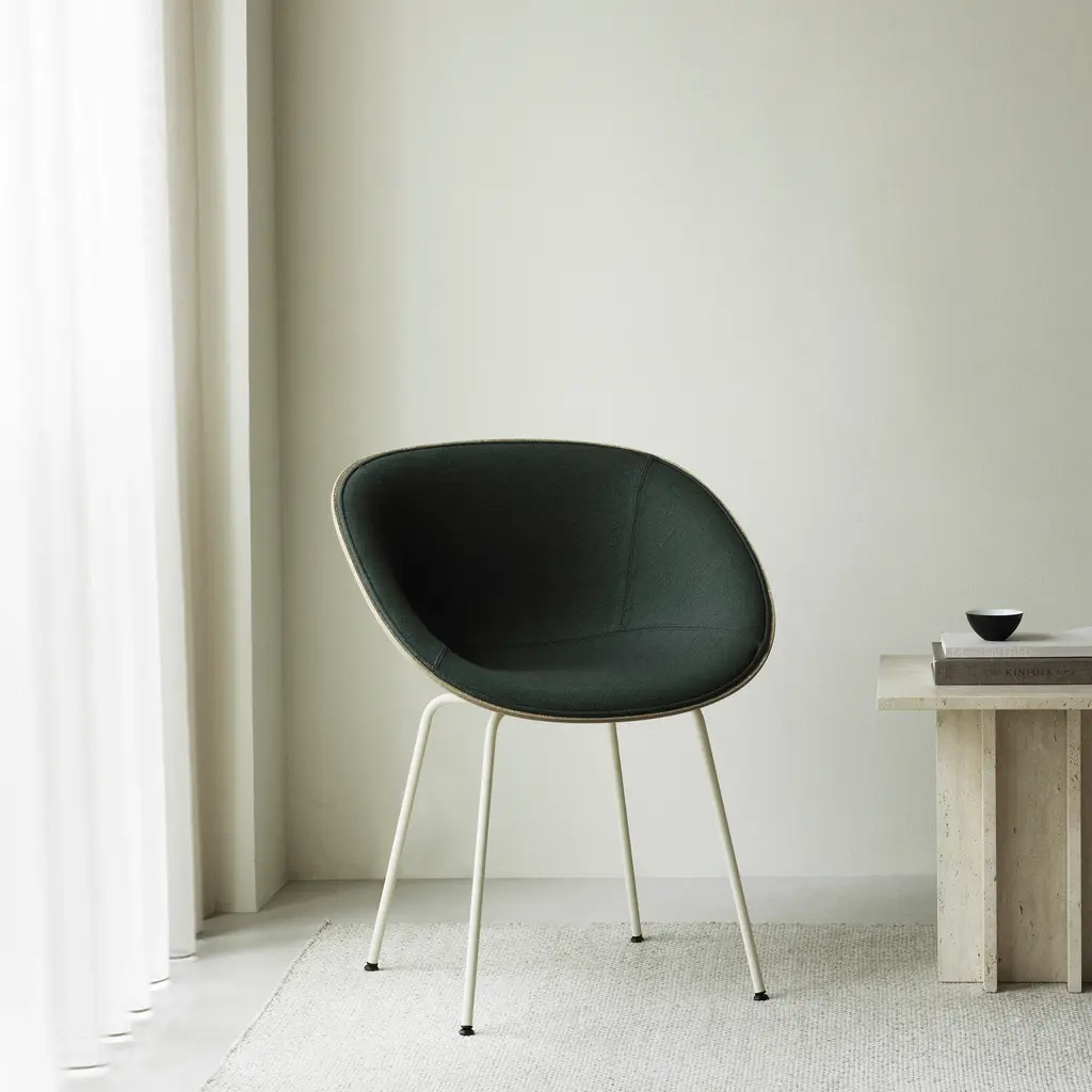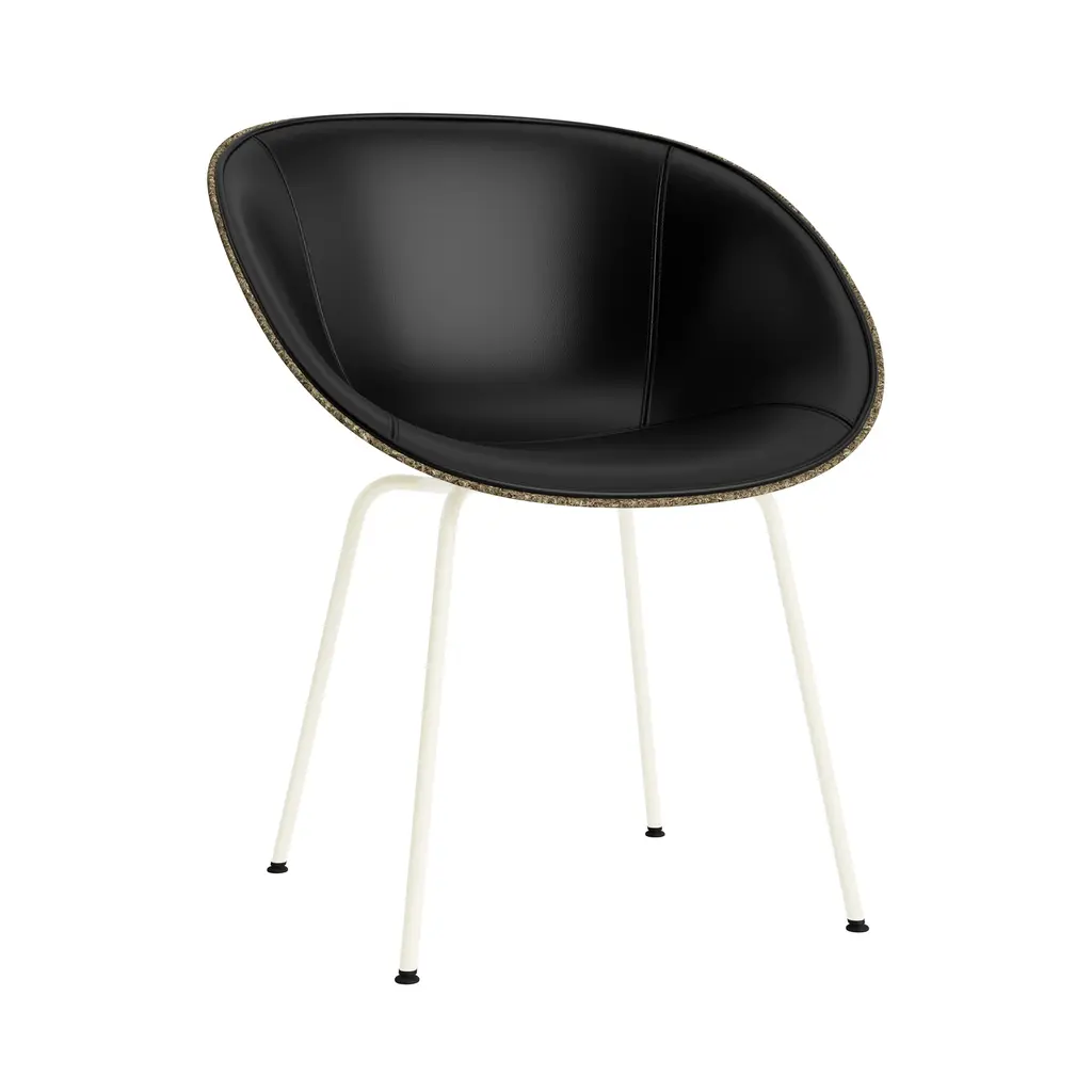 With its inviting contours and eco-friendly design, Mat’s molded armchair gets a personalizing touch with fine fabric or leather front upholstery and a choice of leg colors. The attractively variegated shell updates a Nordic classic in a recyclable composite material made of hemp and seaweed, an innovation from Danish designers Foersom & Hiort-Lorenzen.