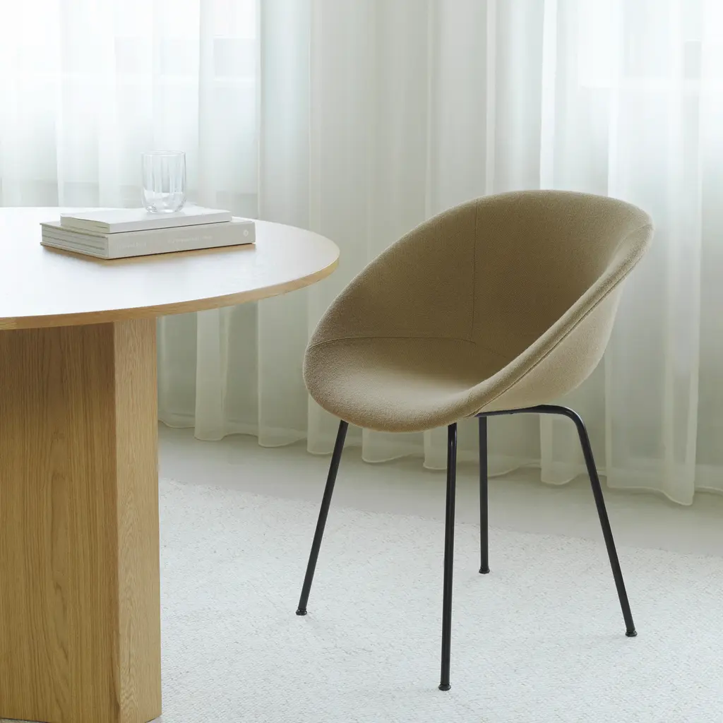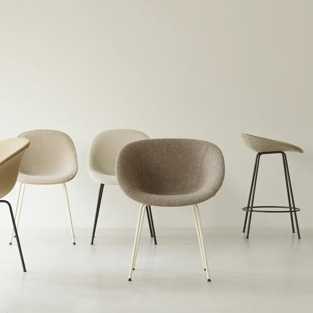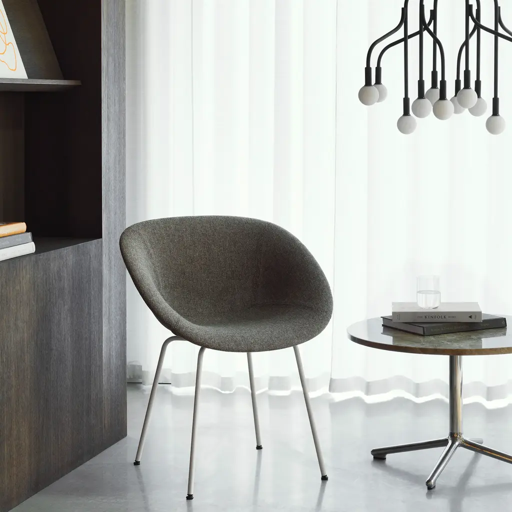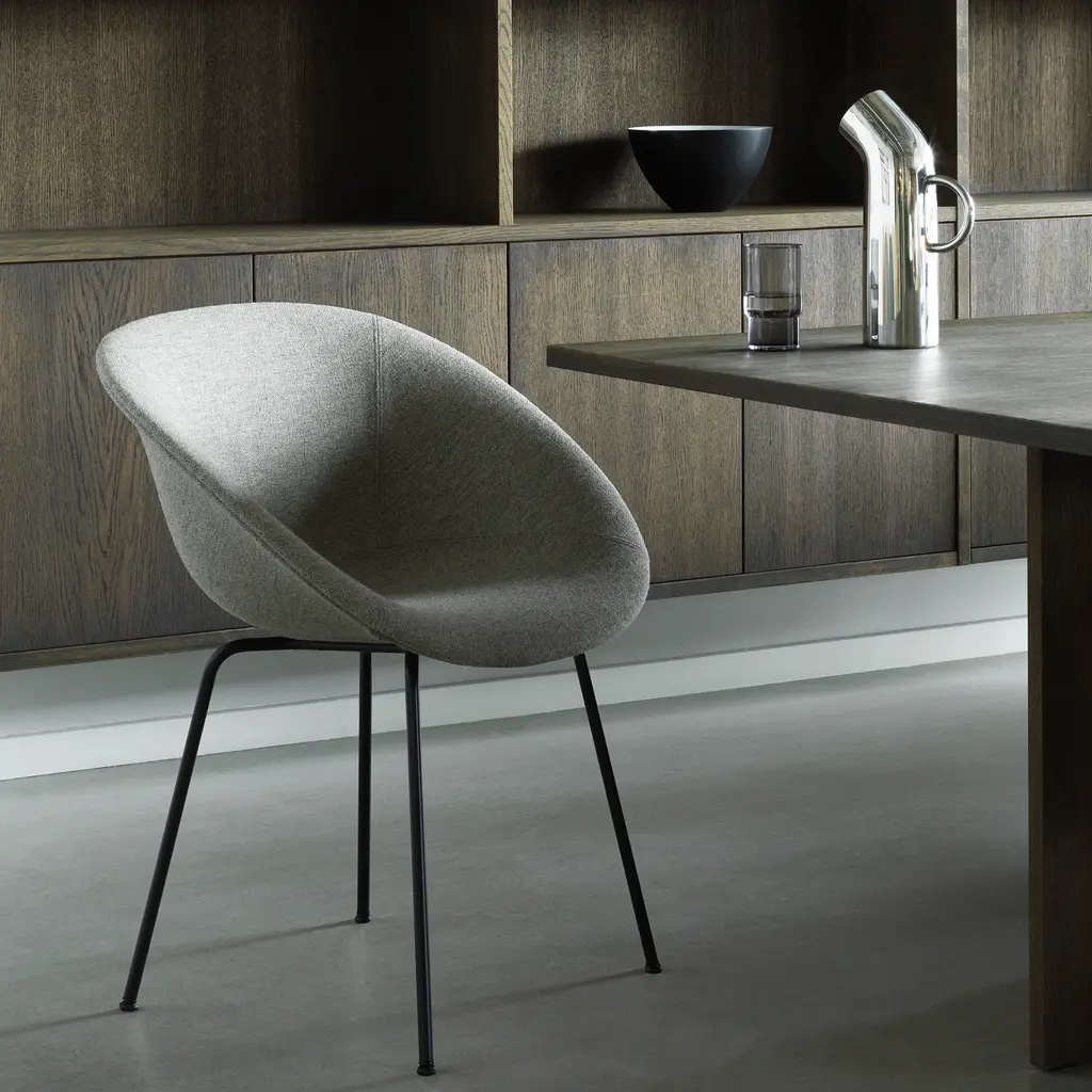 Swathed in a selection of fine fabric or leather, Foersom & Hiort-Lorenzen’s sustainable take on a classic shell armchair gets a completely custom look. Underneath, the molded form is made from an innovative and fully recyclable composite using hemp and eelgrass seaweed—and the seating also offers a choice of steel legs in black or cream powder coat.