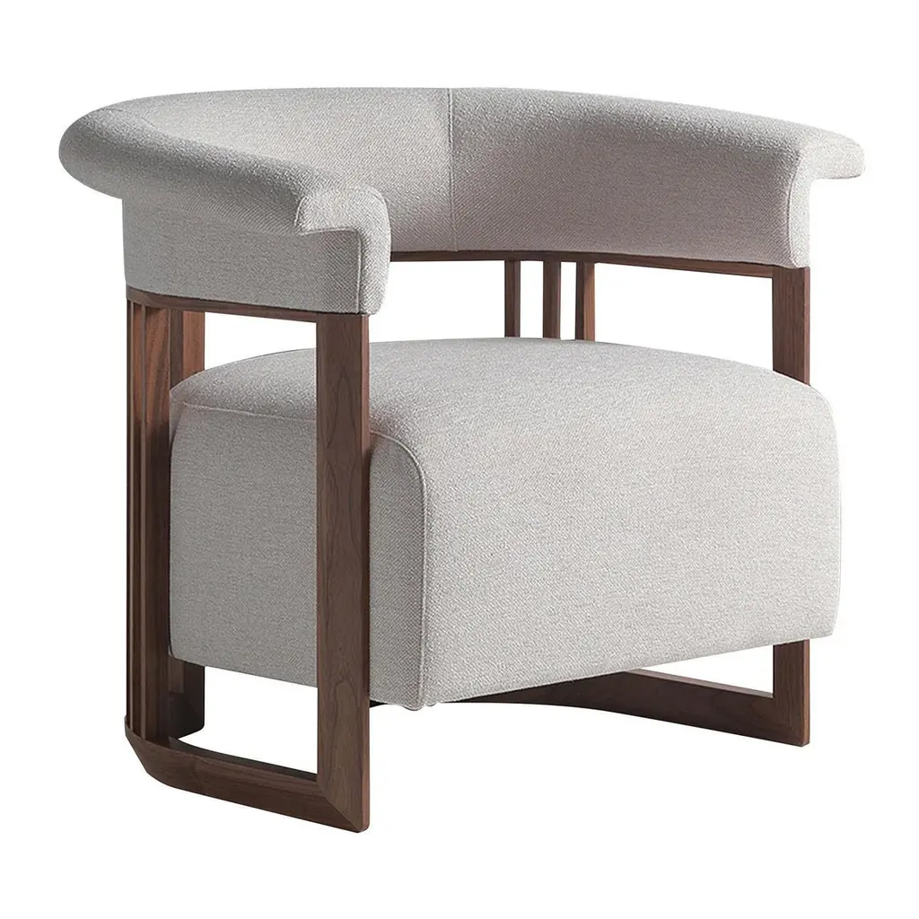 The Matilde armchair features a curved backrest supported by vertical slats, creating an open and elegant silhouette. Upholstered in soft ZR Infinity Soft 10711-811 fabric, this medium-sized chair combines comfort with refined design. The walnut canaletto frame highlights natural wood grain, adding warmth and texture to contemporary interiors. Its balanced proportions and distinctive shape make it suitable for lounges, living areas, or stylish office spaces.