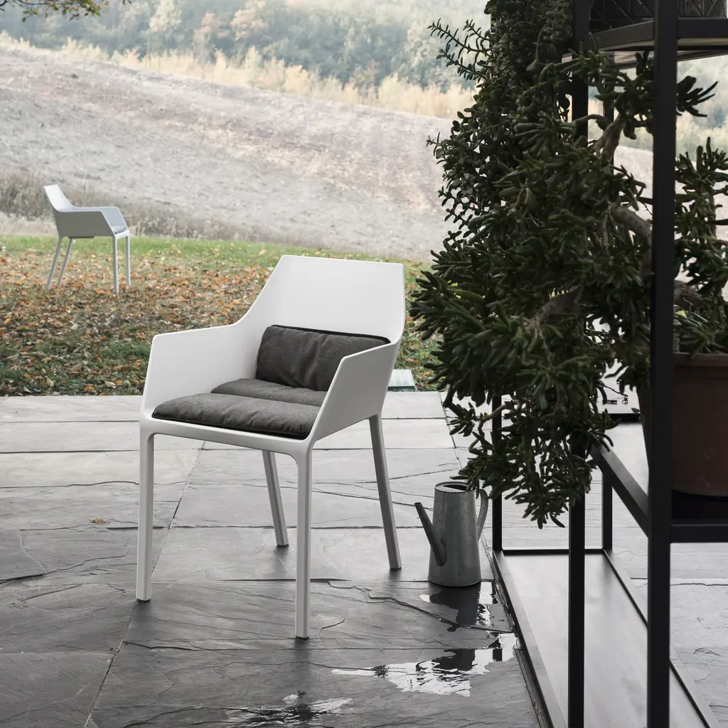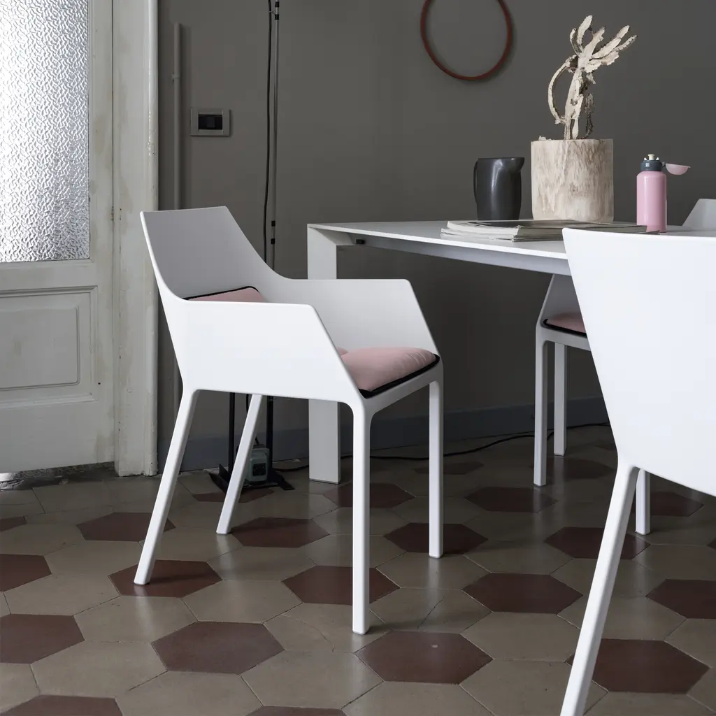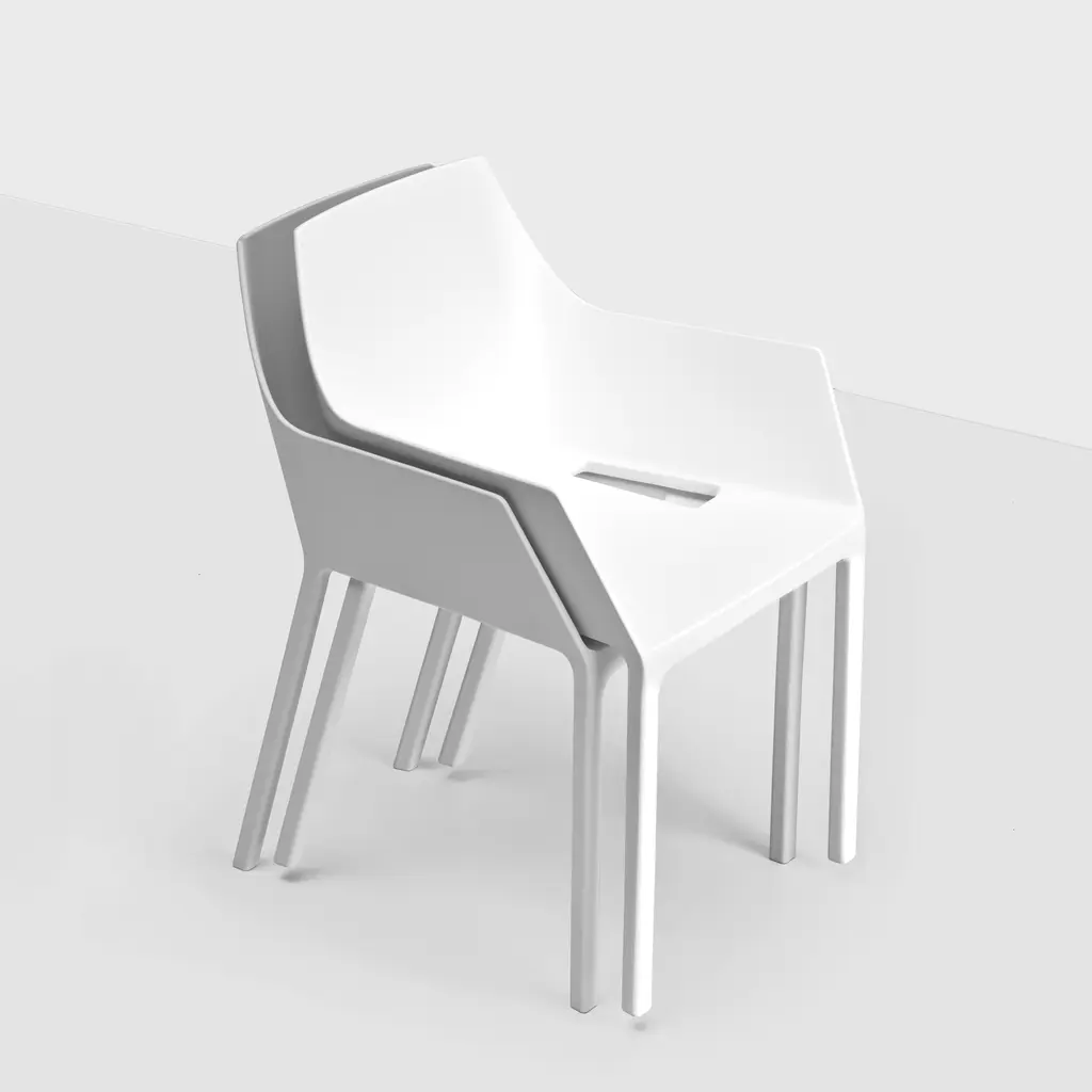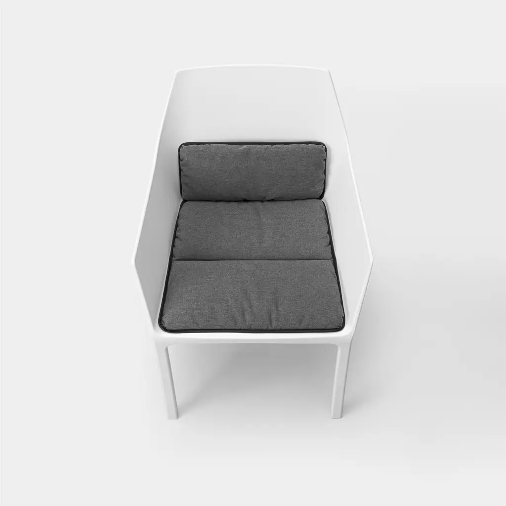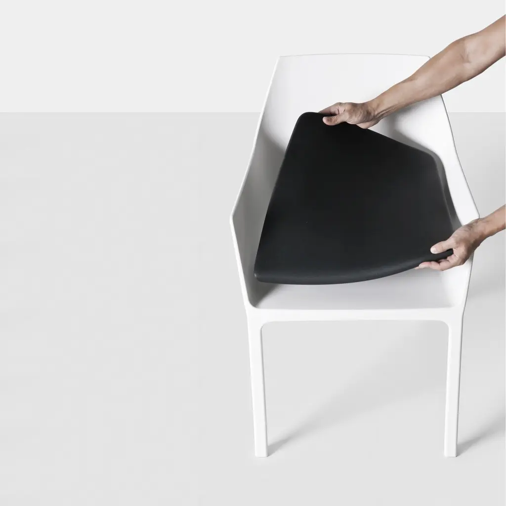 Made of injection-moulded polypropylene reinforced with glass, the Mem chair by Christophe Pillet, with its barely highlighted angles and curves, combines strength with elegance. The two holes in the seat are aesthetic yet also functional details, since they make the chair stackable despite its embracing shape. Mem is also available with a removable soft polyurethane cushion that matches or contrasts with the seat, or with a lumbar cushion upholstered in a choice of fabrics, making the seat even more comfortable.