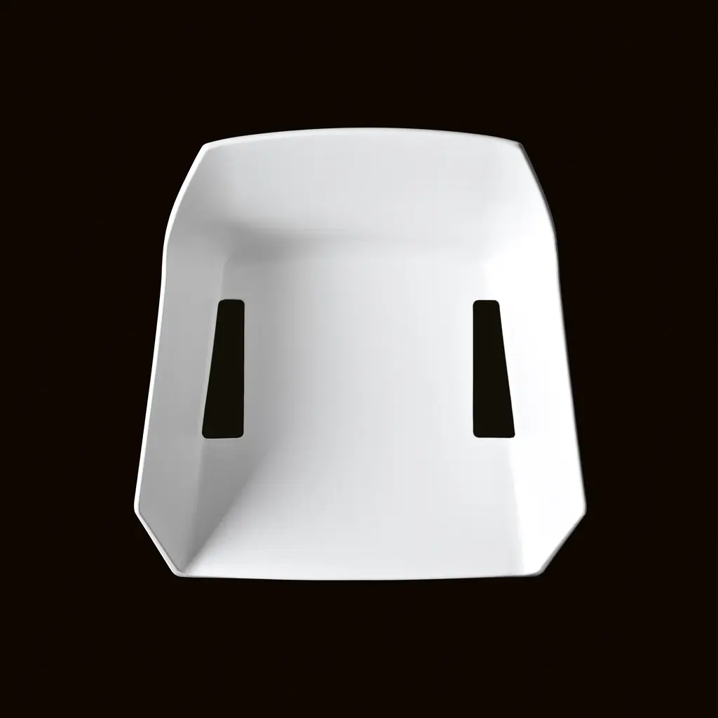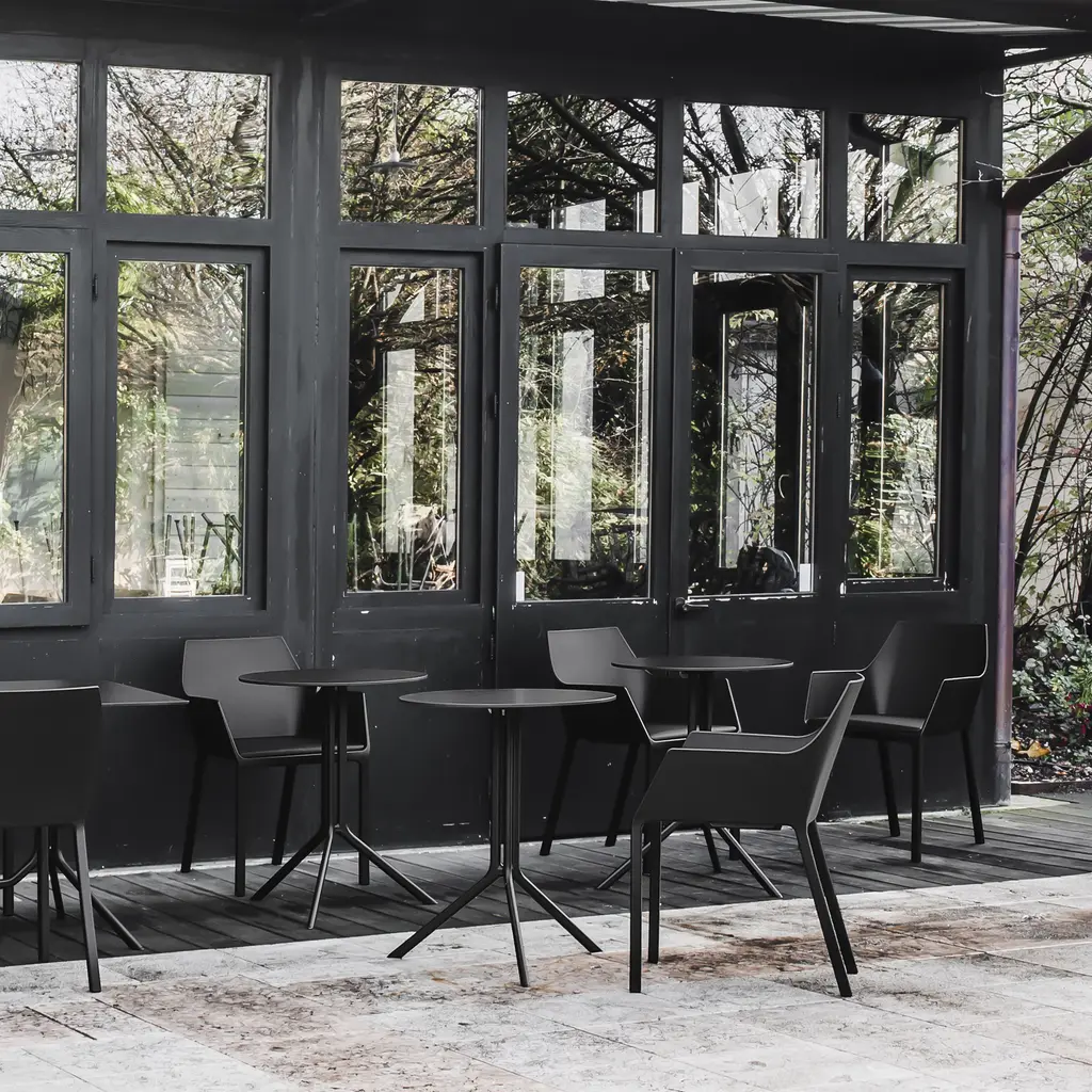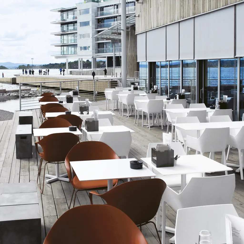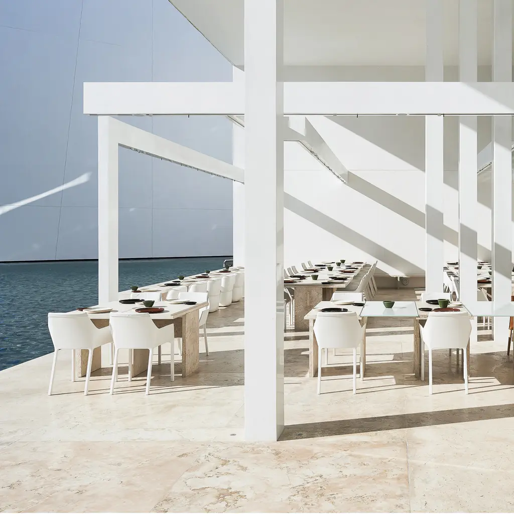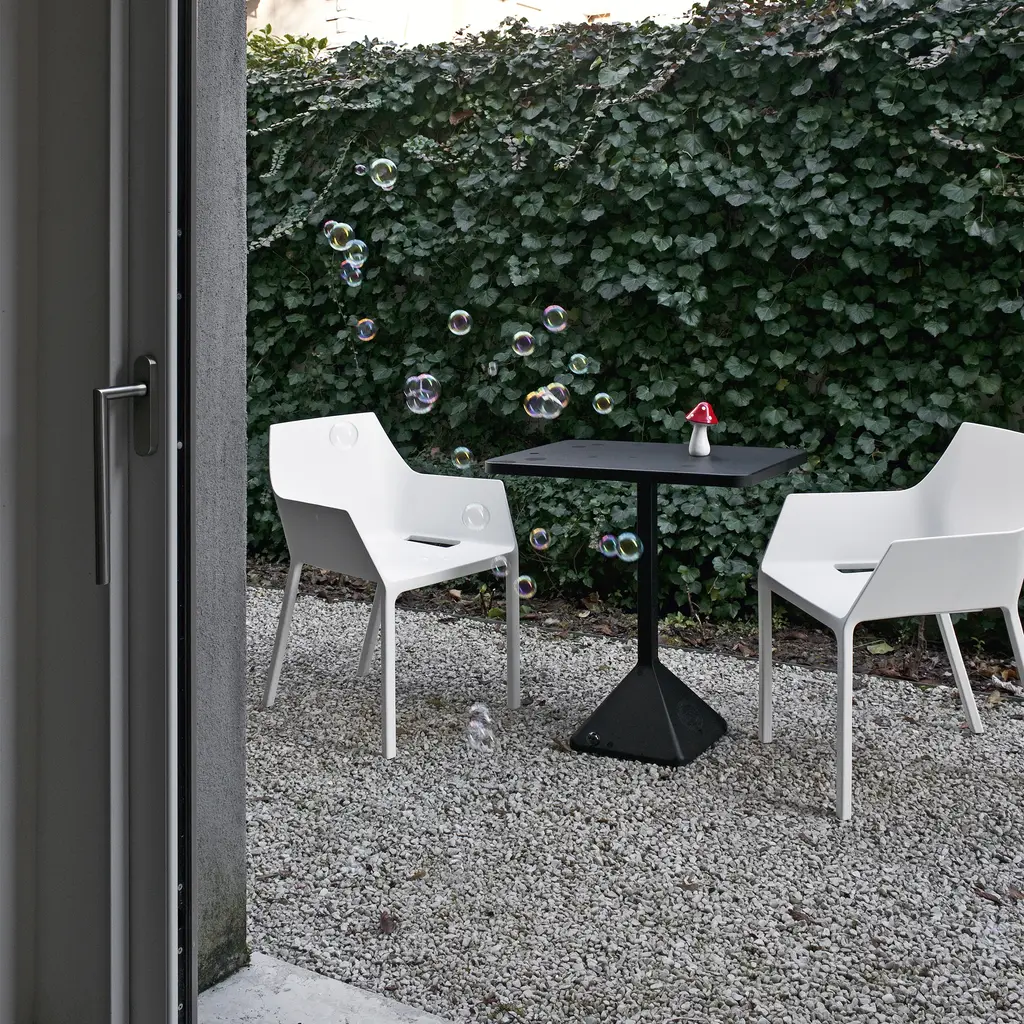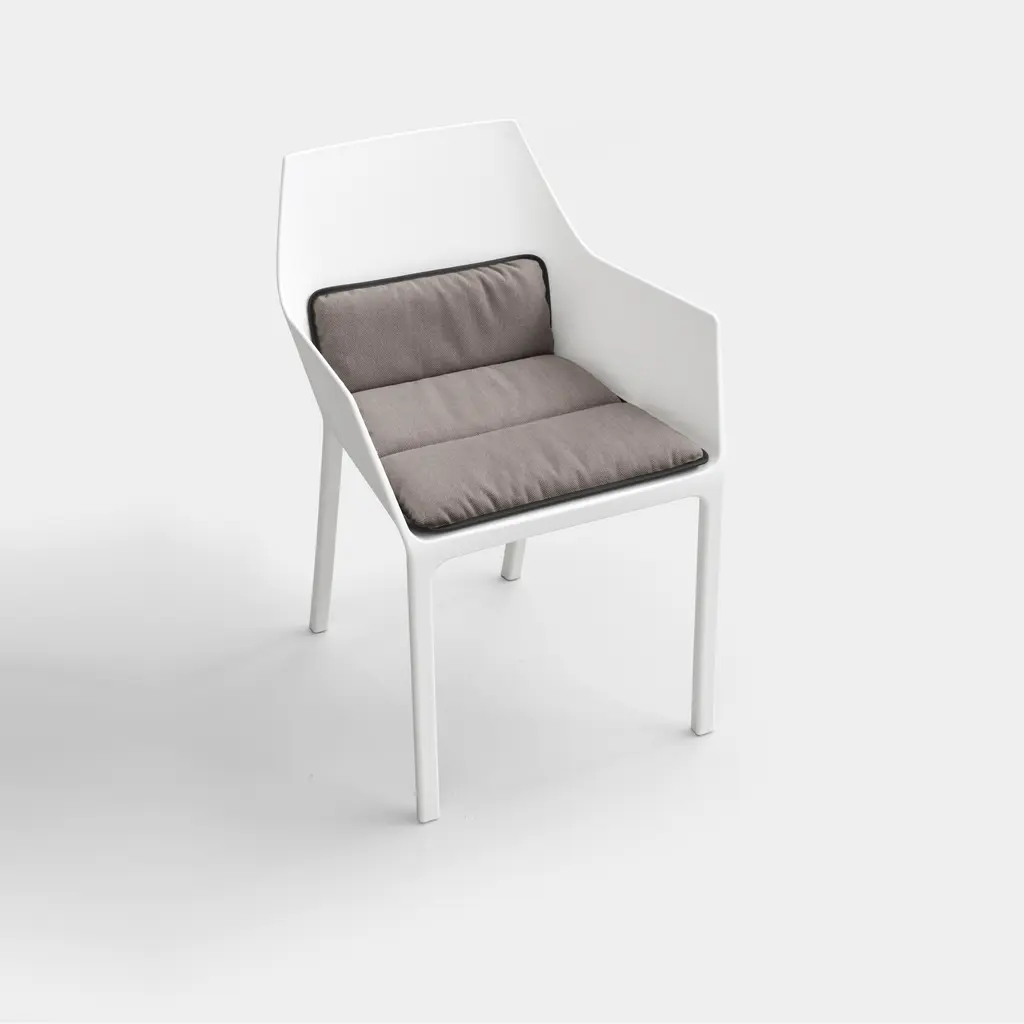 Made of injection-moulded polypropylene reinforced with glass, the Mem chair by Christophe Pillet, with its barely highlighted angles and curves, combines strength with elegance. The two holes in the seat are aesthetic yet also functional details, since they make the chair stackable despite its embracing shape. Mem is also available with a removable soft polyurethane cushion that matches or contrasts with the seat, or with a lumbar cushion upholstered in a choice of fabrics, making the seat even more comfortable.