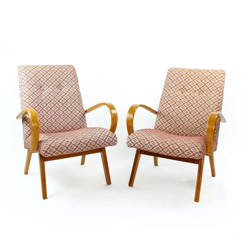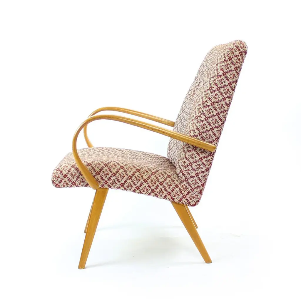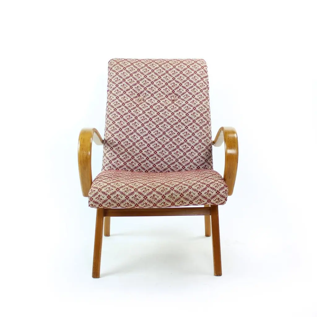 Beautiful Mid-century armchair with typical design for the era. Produced in Czechoslovakia by TON, original label still attached. The chair is partially restored with newly restored wooden parts. The chair shows beautiful design with smooth, bent wooden armrests. The fabric is original, we kept it as it still looks beautiful and shows only minor wear. Originally, these chairs were very little used, as they were mostly covered by blankets and kept away from daily use, as they were treasured by people who once bought them for high prices. Beautiful chair for any interior. We have two available. Price per chair.