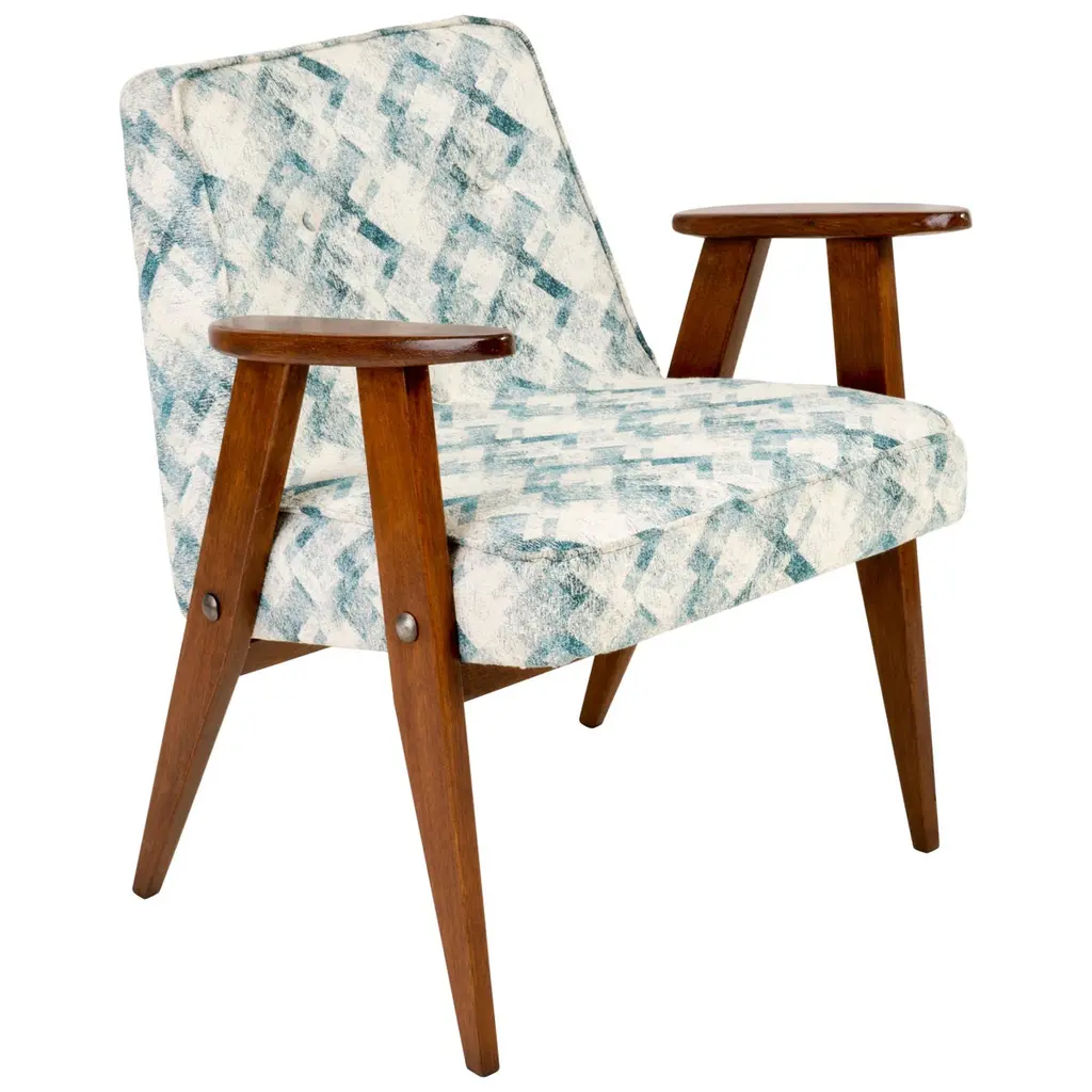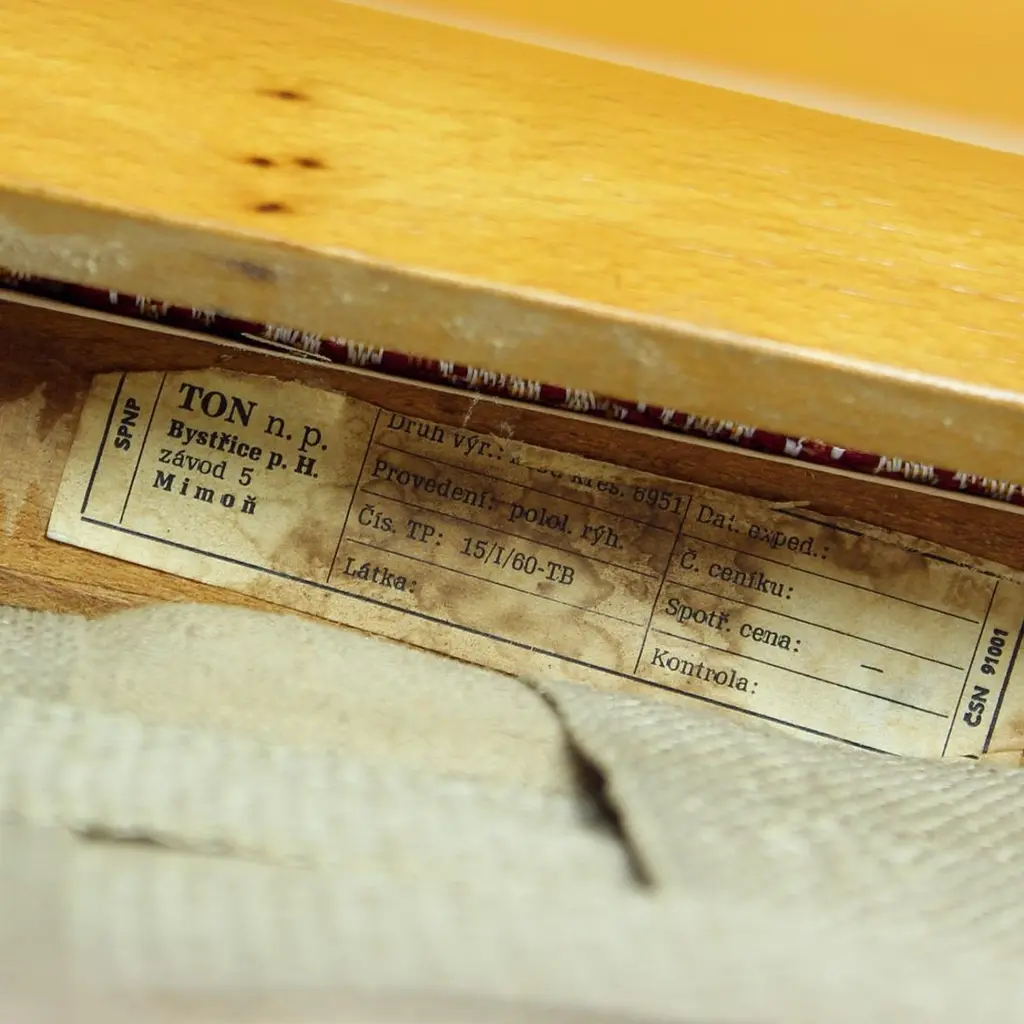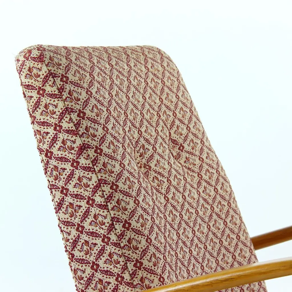 Beautiful Mid-century armchair with typical design for the era. Produced in Czechoslovakia by TON, original label still attached. The chair is partially restored with newly restored wooden parts. The chair shows beautiful design with smooth, bent wooden armrests. The fabric is original, we kept it as it still looks beautiful and shows only minor wear. Originally, these chairs were very little used, as they were mostly covered by blankets and kept away from daily use, as they were treasured by people who once bought them for high prices. Beautiful chair for any interior. We have two available. Price per chair.