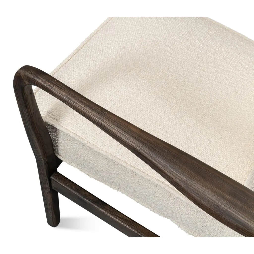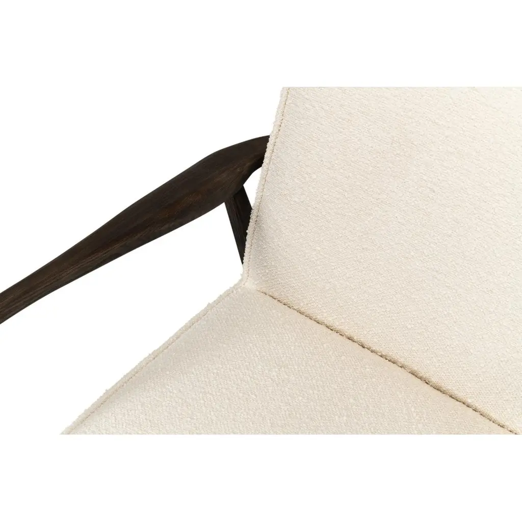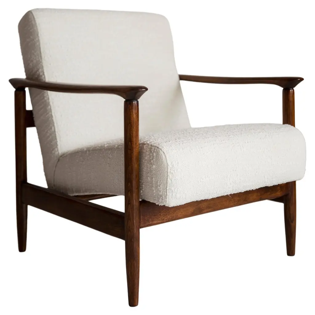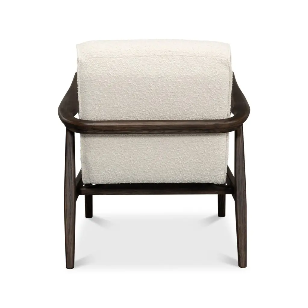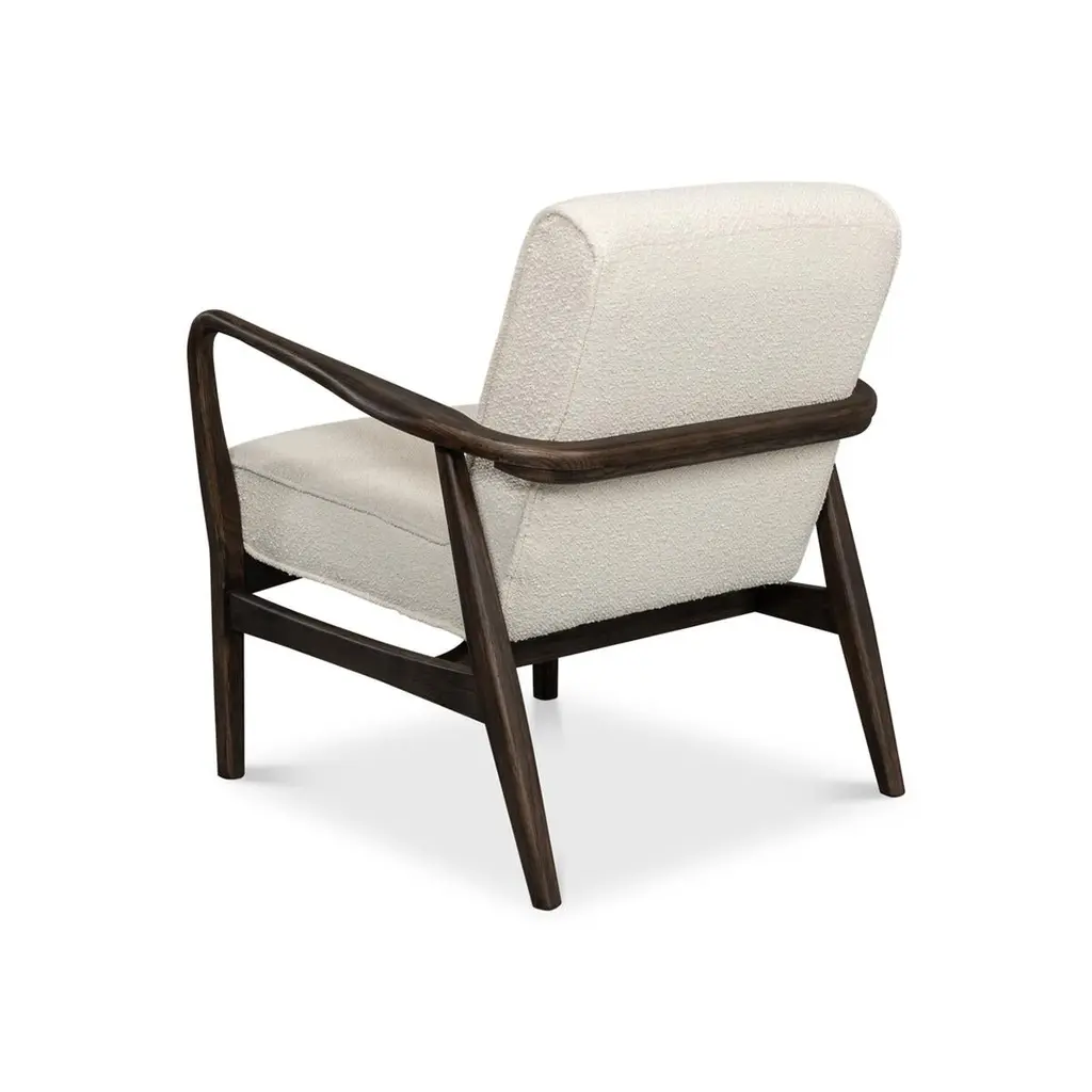 Mid Century armchair with ivory Boucle fabric, a warm finish to the ash frame. Stylish chair option in any space.Dimensions: 27" W x 30" D x 31" HSeat - 18" H Arm - 25" H.