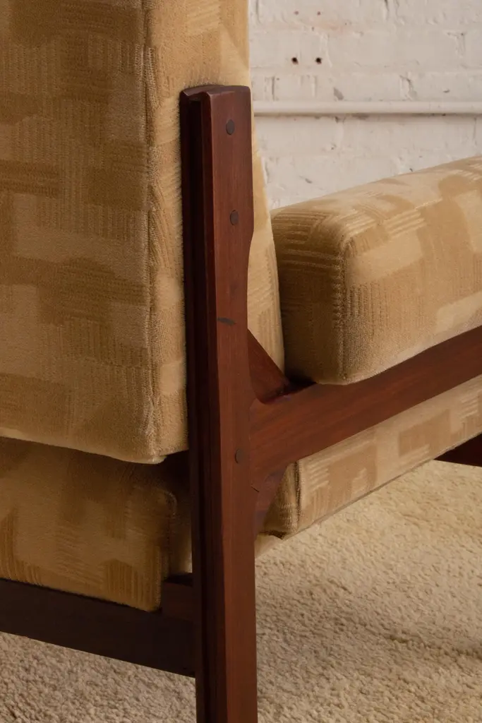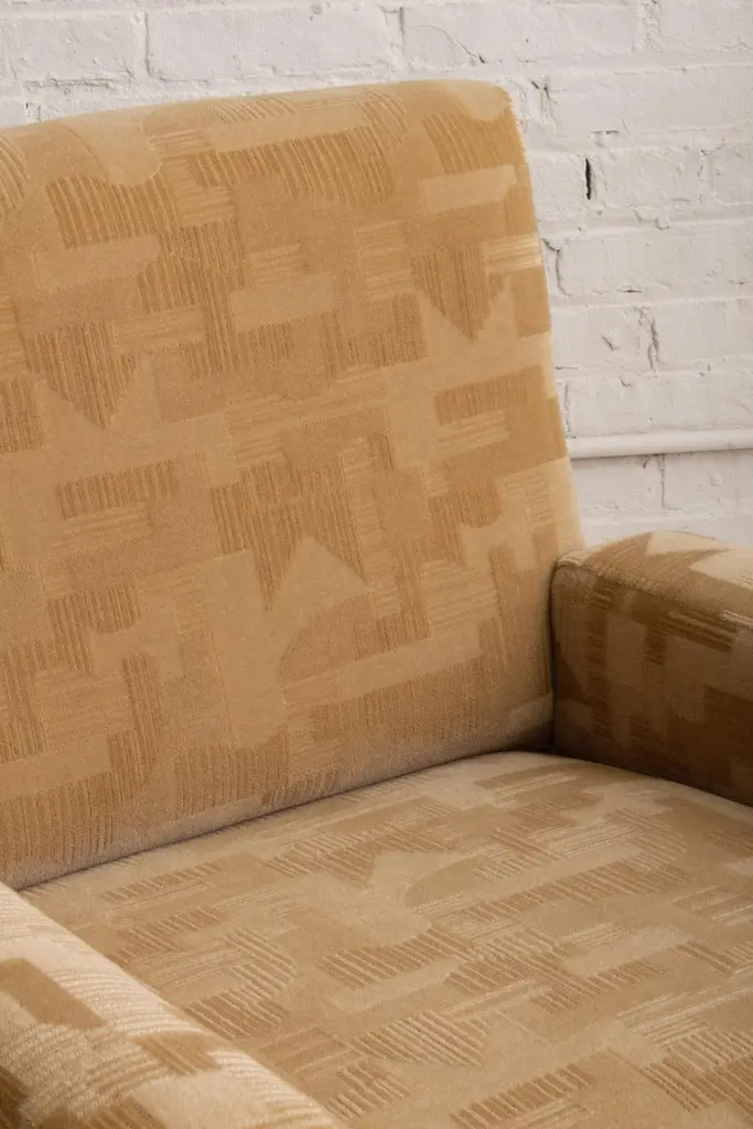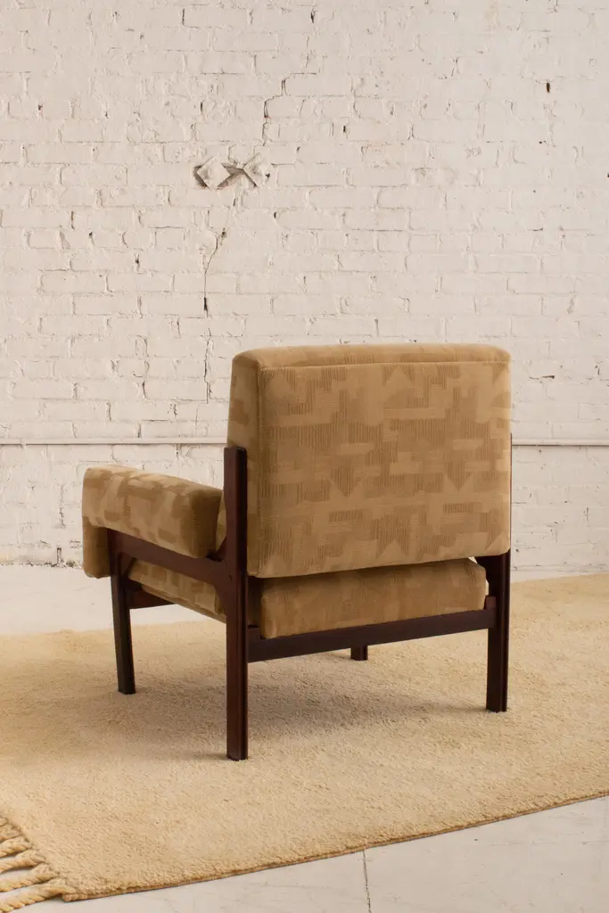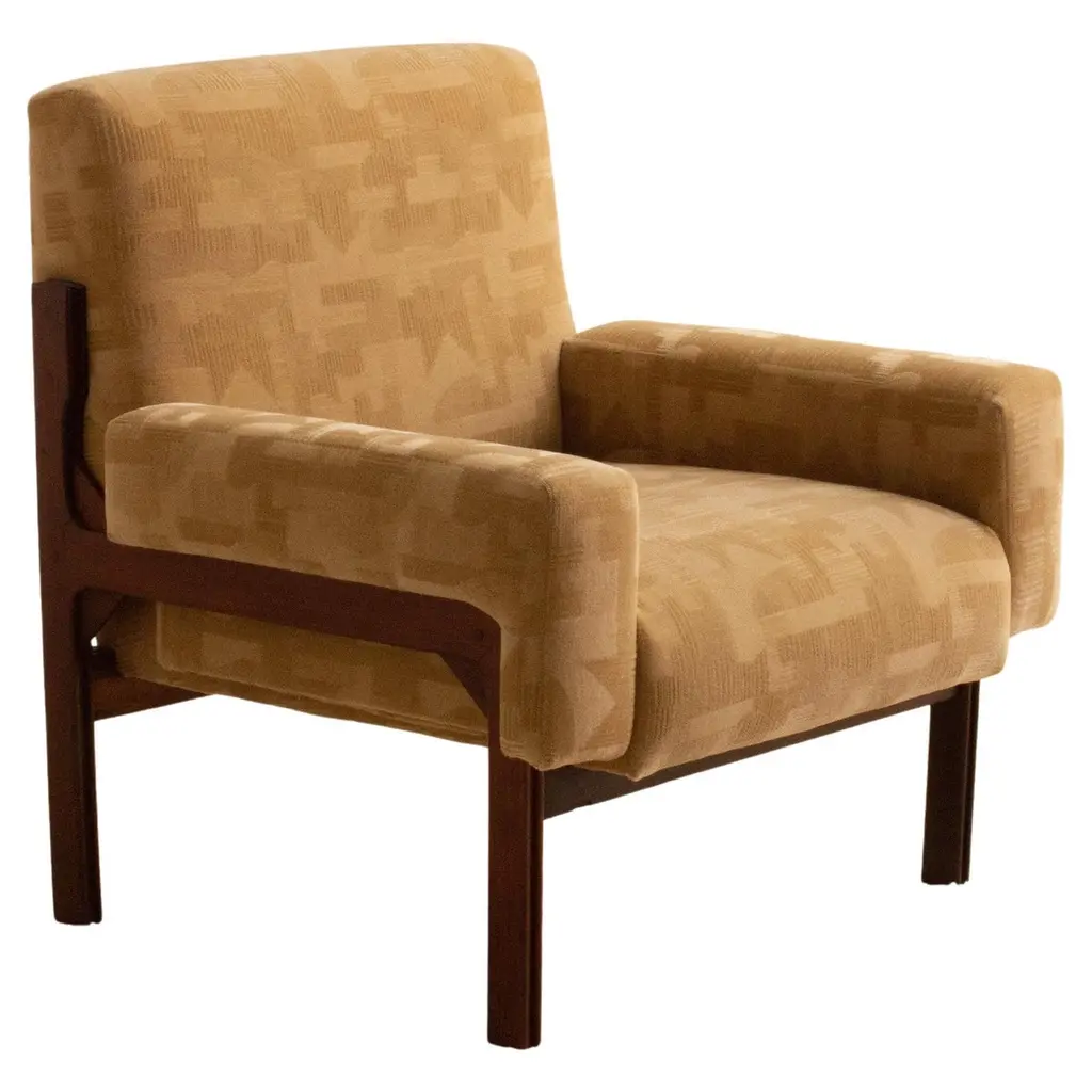 A mid century Italian armchair. Wood frame with new upholstery in a geometric cut velvet mohair. Sourced in Northern Italy. Two available, sold separately.