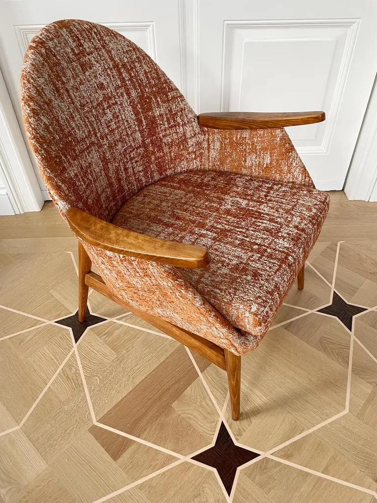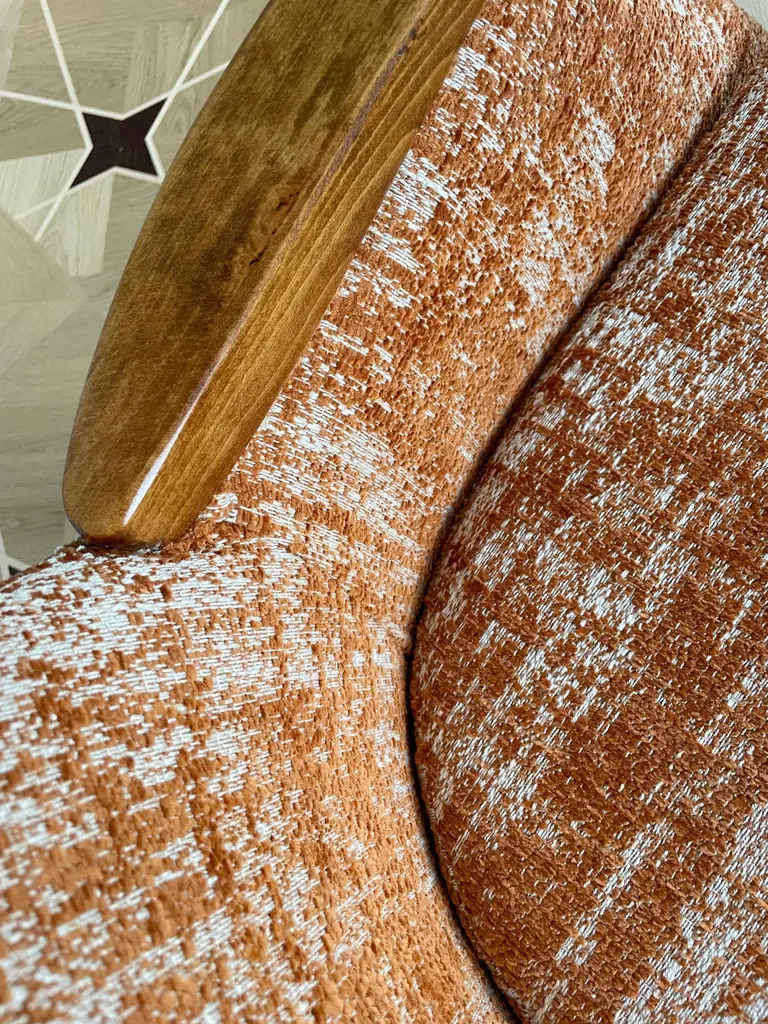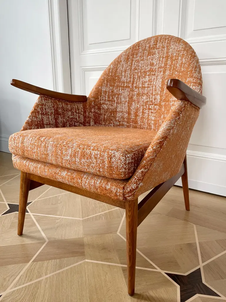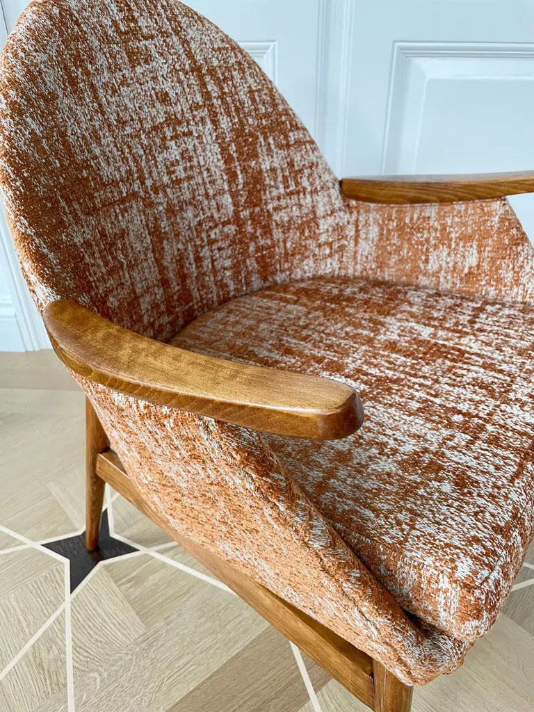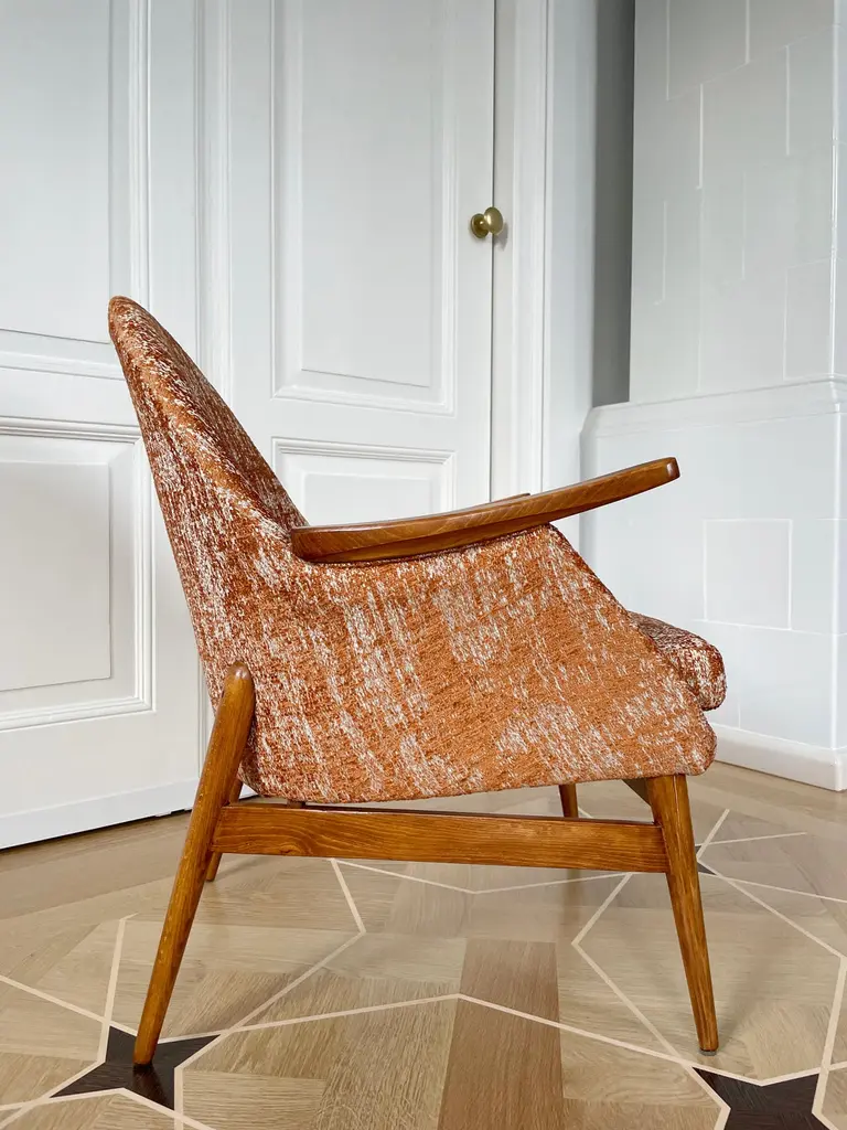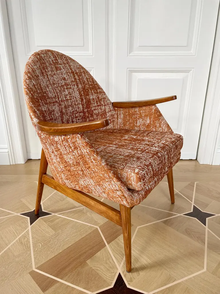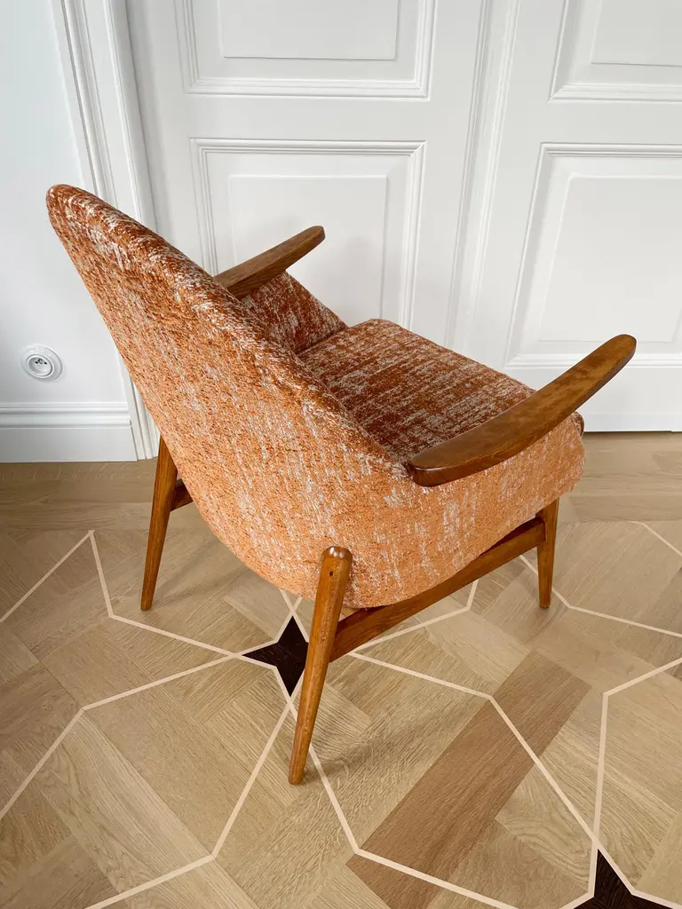 Beautiful armchair in ginger boucle type fabric, designed by Julia Gaubek, a Polish architect, designer of Industrial Design and interior architecture, professor at the Academy of Fine Arts in Gdansk.The armchairs were made in the 1960s in the Gosciecinska Furniture Factory. They are made from solid beechwood. The swallow type armchair is regarded one of the best Polish armchair design from the previous age. The armchairs have been thoroughly renovated. The tension belts have been changed, new upholstery foams.Upholstery fabric with a clear, thick weave with a visual antiquing effect. The color transitions of irregular weaves look like abrasions, and the colors themselves seem faded. The fabric can also be interpreted in the chanel style - combined with golden haberdashery accessories, add details in the form of pearl buttons or beads. This is a mixture of many types of fibers, which provides this fabric not only with an intriguing texture and appearance, but also perfectly balanced performance properties. For this armchair we used color ginger 09.We can prepare this armchairs also in another wood and fabric color.