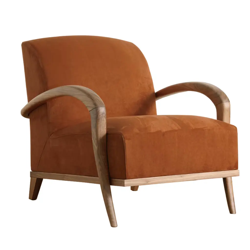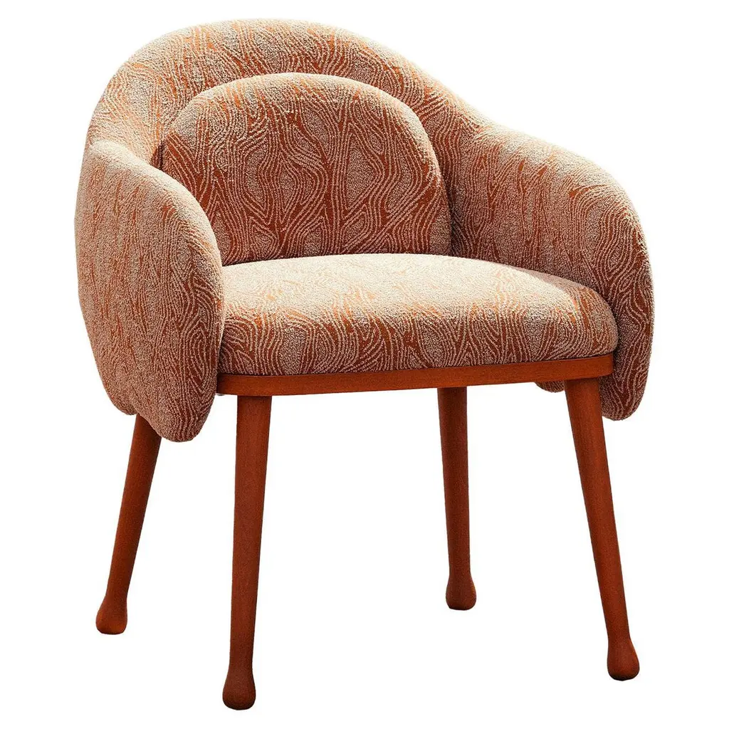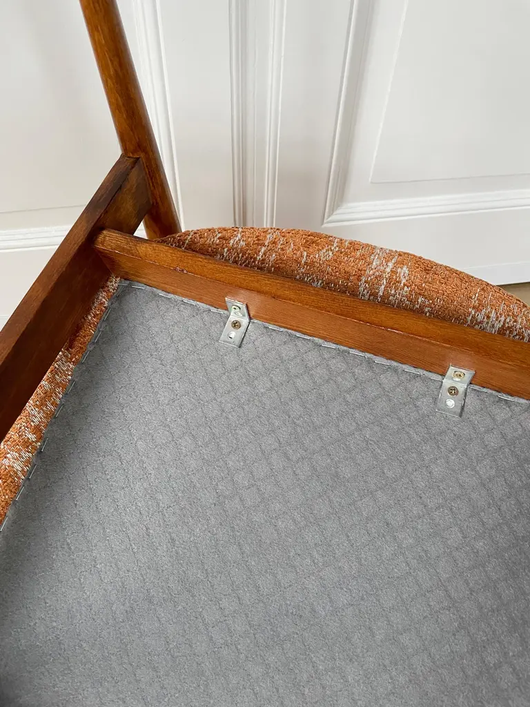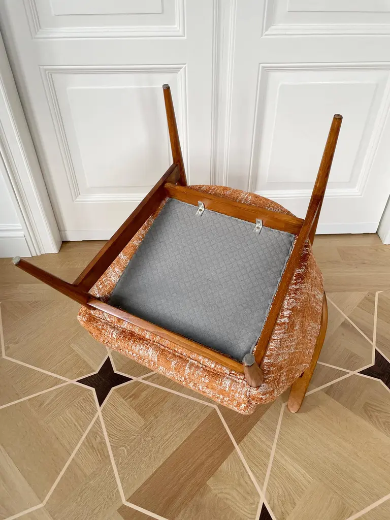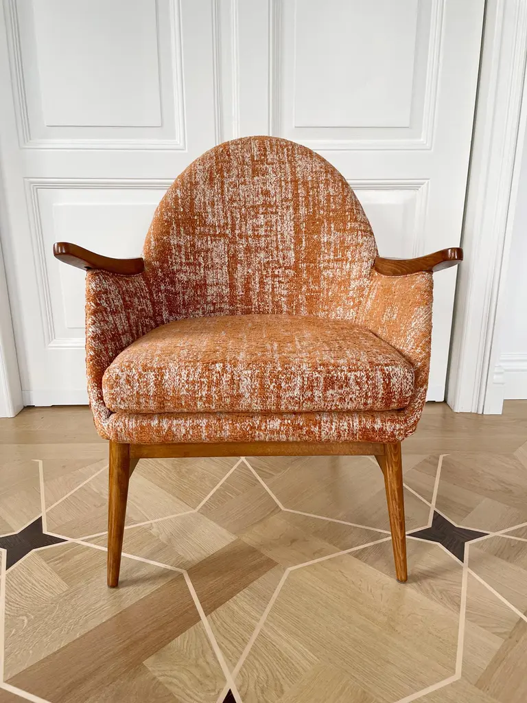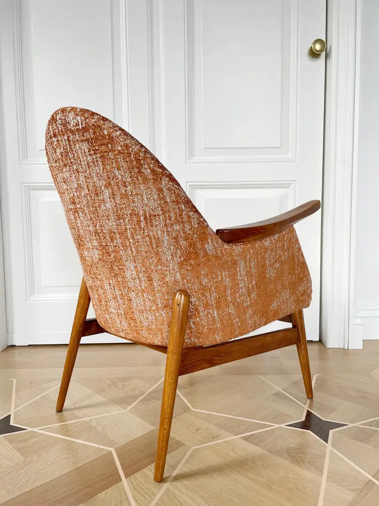 Beautiful armchair in ginger boucle type fabric, designed by Julia Gaubek, a Polish architect, designer of Industrial Design and interior architecture, professor at the Academy of Fine Arts in Gdansk.The armchairs were made in the 1960s in the Gosciecinska Furniture Factory. They are made from solid beechwood. The swallow type armchair is regarded one of the best Polish armchair design from the previous age. The armchairs have been thoroughly renovated. The tension belts have been changed, new upholstery foams.Upholstery fabric with a clear, thick weave with a visual antiquing effect. The color transitions of irregular weaves look like abrasions, and the colors themselves seem faded. The fabric can also be interpreted in the chanel style - combined with golden haberdashery accessories, add details in the form of pearl buttons or beads. This is a mixture of many types of fibers, which provides this fabric not only with an intriguing texture and appearance, but also perfectly balanced performance properties. For this armchair we used color ginger 09.We can prepare this armchairs also in another wood and fabric color.