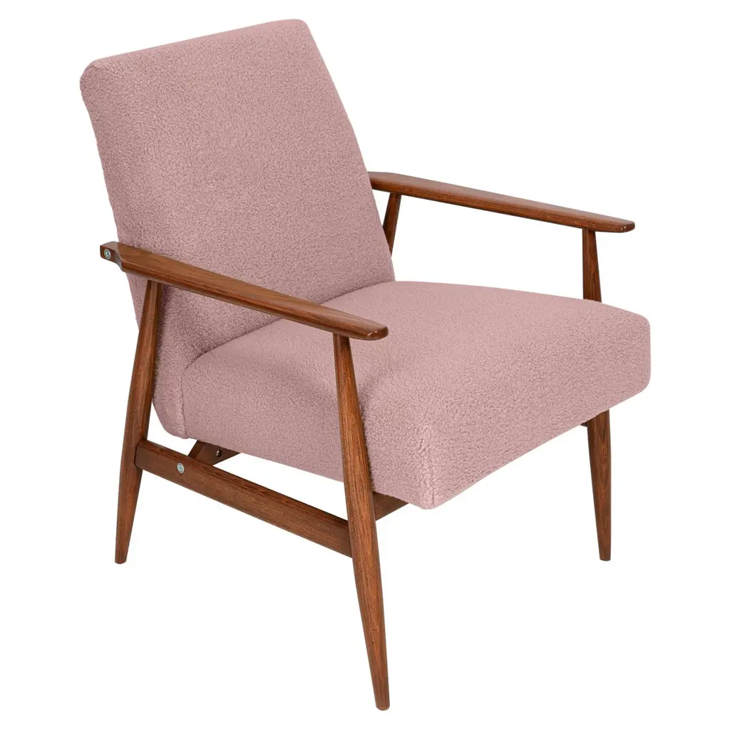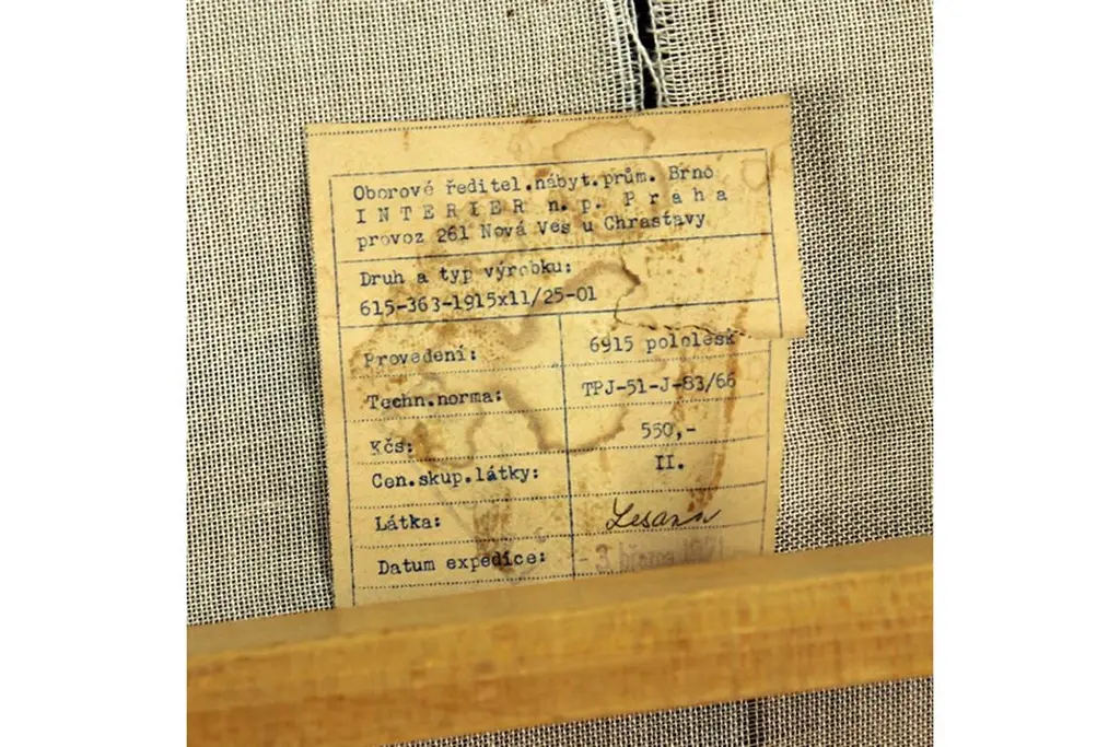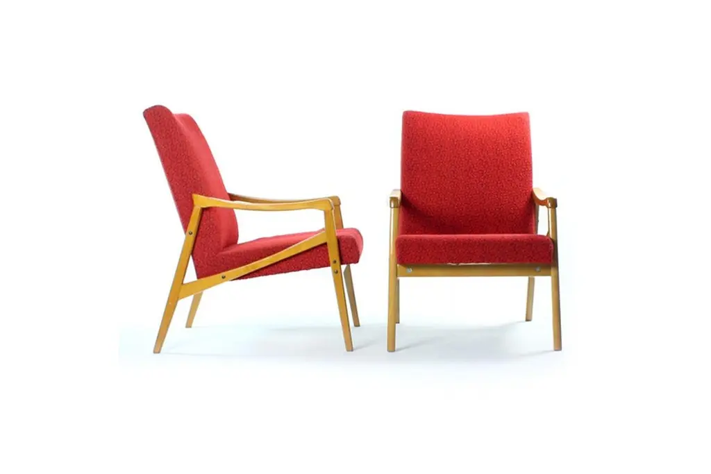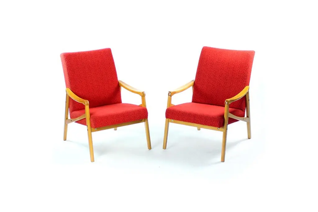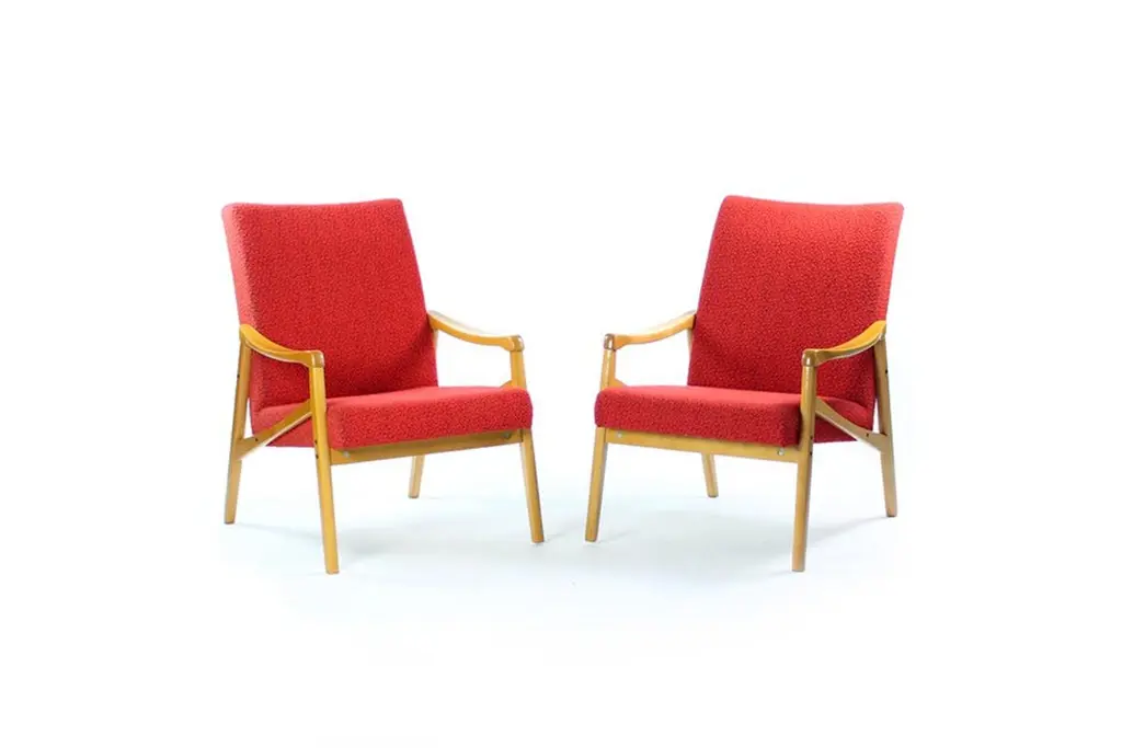 Beautiful armchair shows the typical Mid-Century armchair designed by Interier Praha. This model was created in 1971 in Czechoslovakia. Original label still attached on the bottom of the chair. This is a very strong and elegant armchair. Beautiful oak wood construction in blond shad of wood. Original red fabric without any tears or wear. The armchair is in a very good condition. Excellent condition of the wood. The fabric shows only minor fading. The lighter wood shows beautiful design features and elegant lines. Beautiful chairs with a very comfortable seating, ready to shine in any interiors. We have two available, price per chair.Condition report:Excellent vintage condition. Original fabric, wood in beautiful condition.Additional dimensions information:seat hight 38cm
