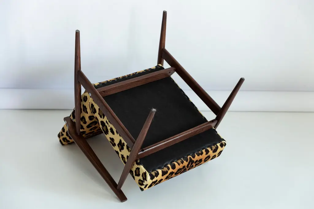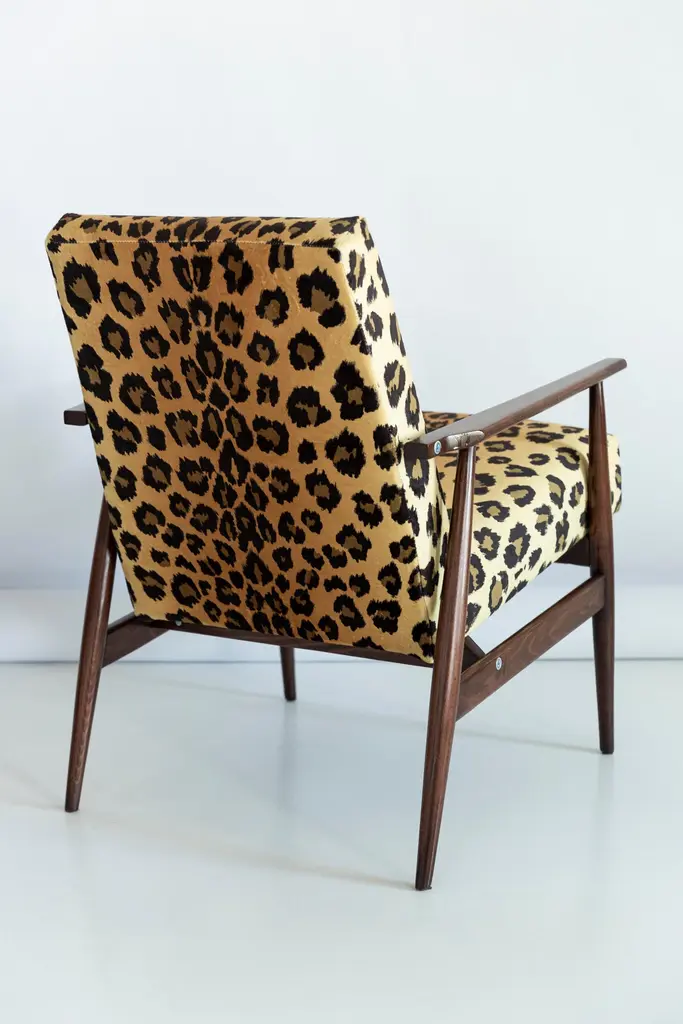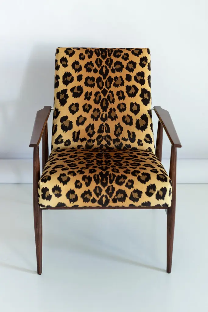 A beautiful, restored armchair designed by Henryk Lis. Furniture after full carpentry and upholstery renovation. The fabric, which is covered with a backrest and a seat, is a high-quality Italian velvet upholstery printed in leopard pattern. The armchair will be perfect in Minimalist spaces, both private and public. We can prepare this armchair in different color of fabric and wood.