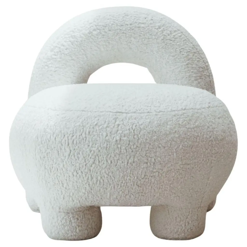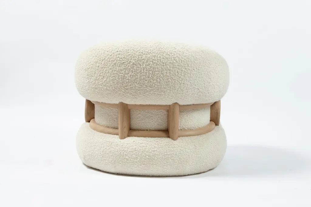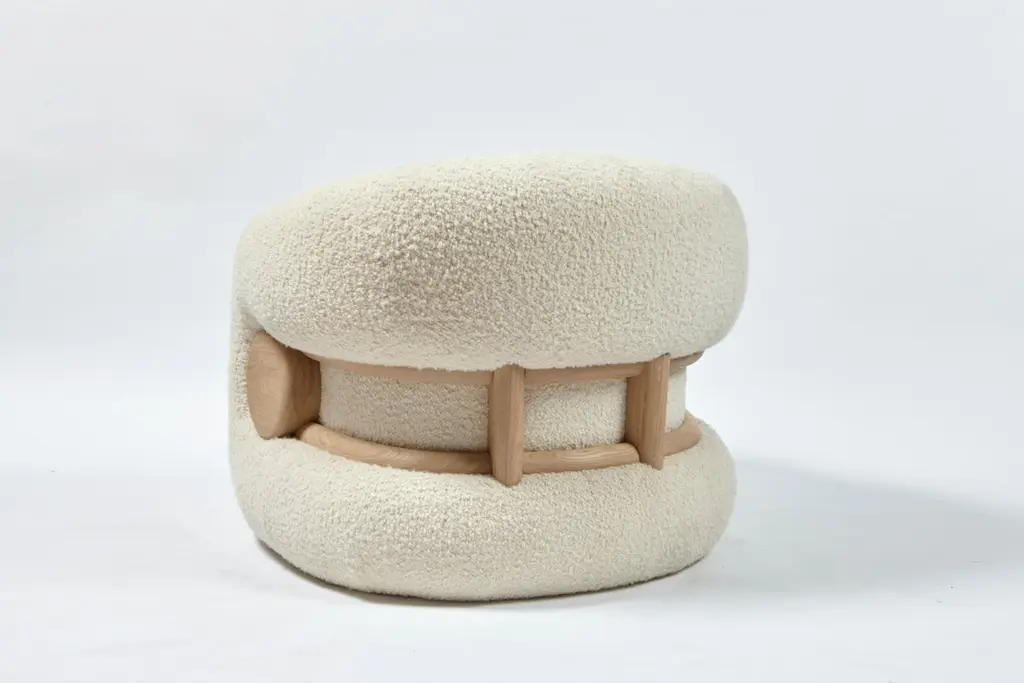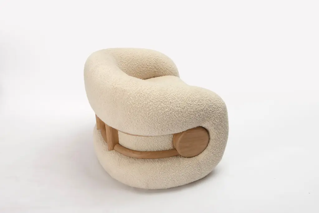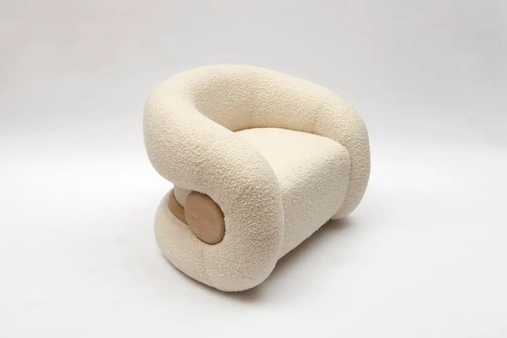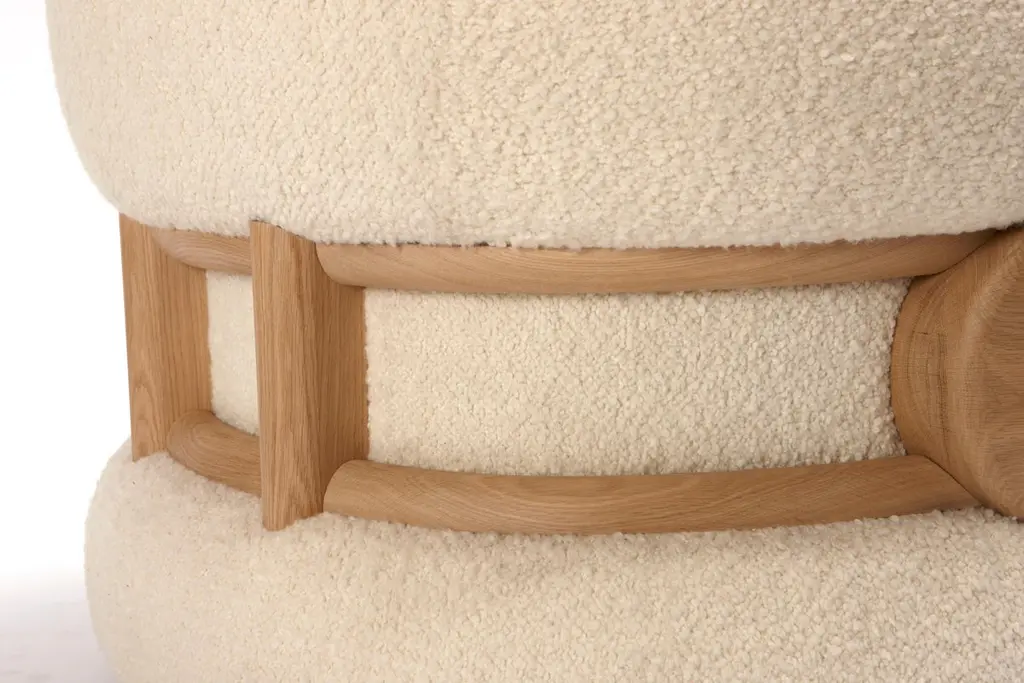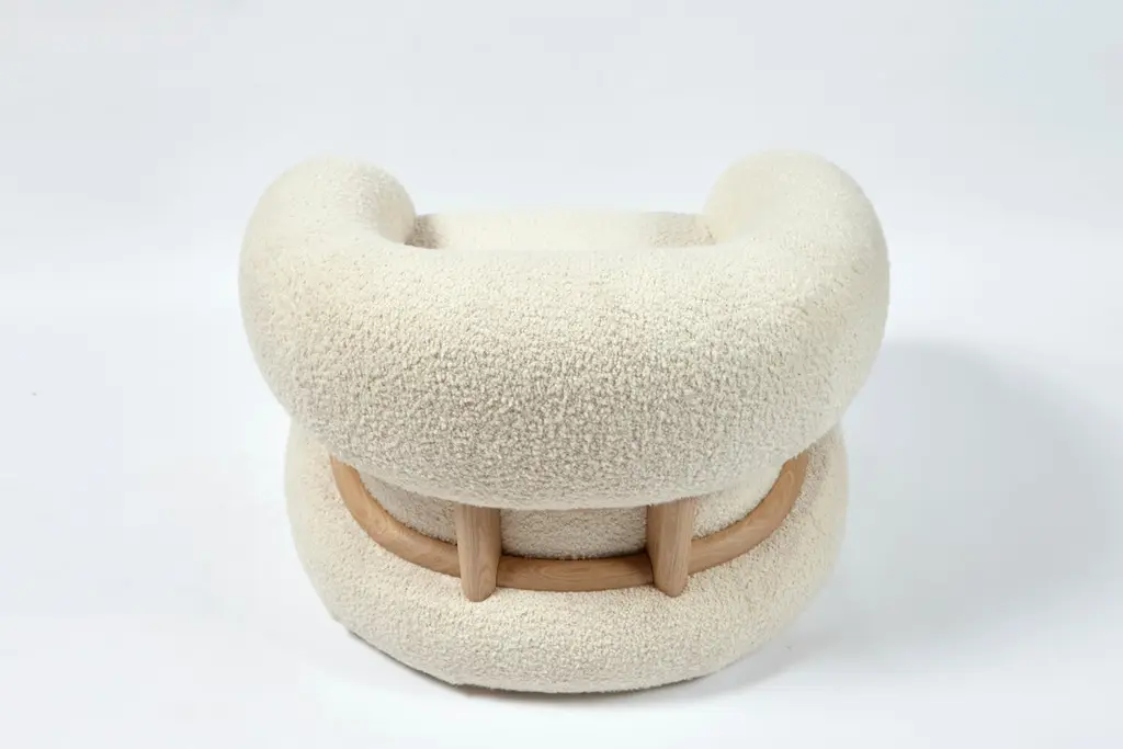 Mistral Armchair by Studio BazazoDimensions: D 80 x W 100 x H 78 cm. Materials: Bouclé fabric and French oak.Light as a breeze with the force to shape landscapes, the “Mistral” collection is a voyage to a moment of relief by the Mediterranean Sea. A reverie on shores that offers a place of calm, merriment, and grandeur, an escape from a present filled with chaos and disarray.“Studio Bazazo” by Ahmad Bazazo is a multidisciplinary design practice that specializes in the creation of unique spaces and pieces. The Studio challenges the notions of traditional design by pushing the boundaries of material experimentation and precision to create objects of the highest possible quality. It is not driven by a given style, but rather by a principal of producing bespoke made-to-measure objects that bring light and focus into the spaces that they encompass.The studio aims to create bespoke pieces, while also having a permanent collection that can be customized in terms of materials and finishes. All pieces are handmade and finished using only the finest of local Lebanese master craftsmen, which is at the core of our values to provide a high-end middle eastern product.