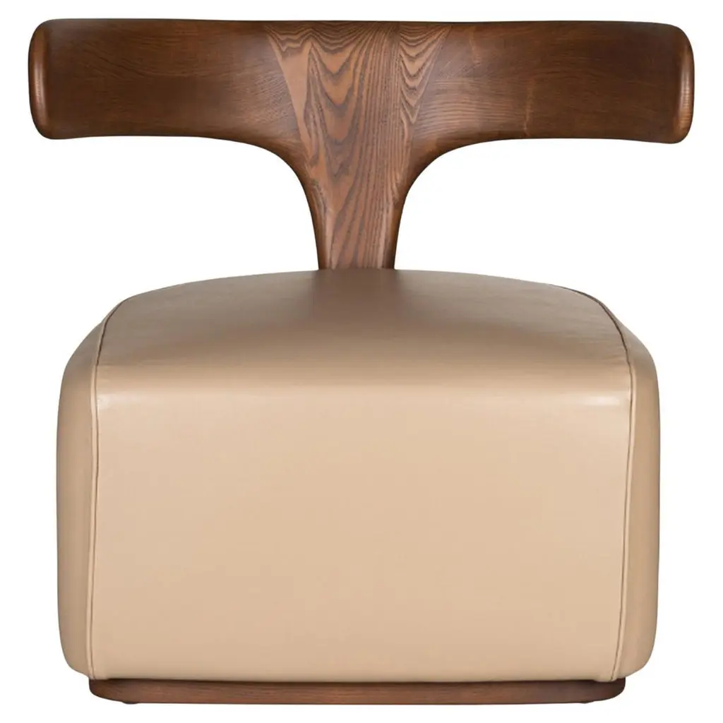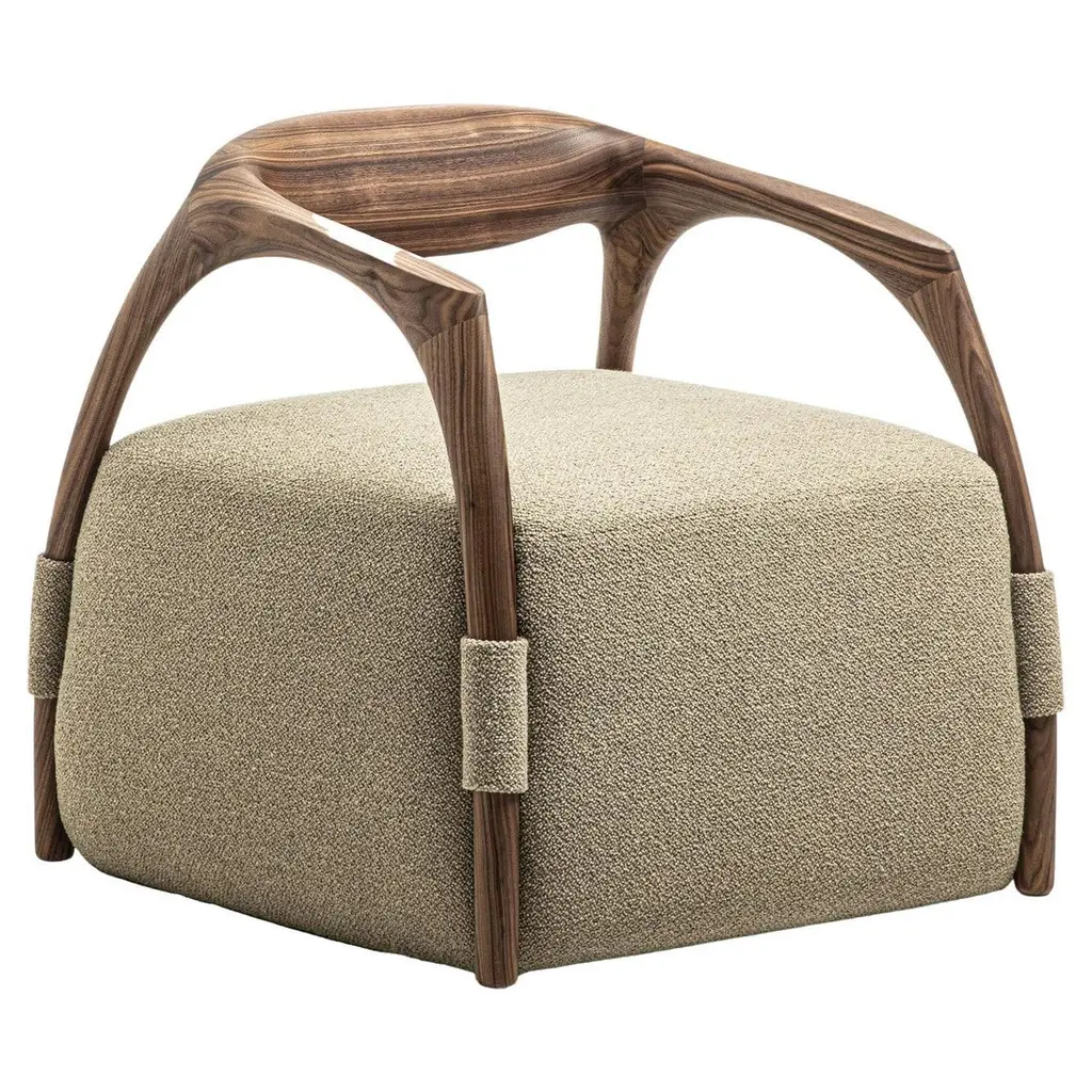 Sartorial refinement and playful inspiration coexist in this exquisite armchair by Libero Rutilo. Offered in a dark stain standing in rich chromatic contrast with the seat's beige-toned fabric upholstery, the ash frame captures the eye with its shape reminiscent of a whale's tail. Multiple variants and finishing options are available in the Artemest catalog.