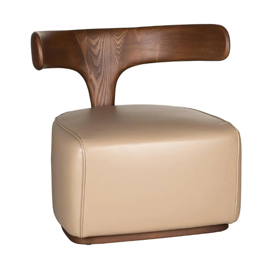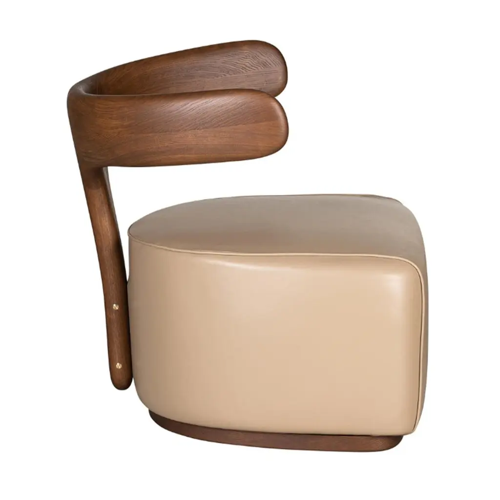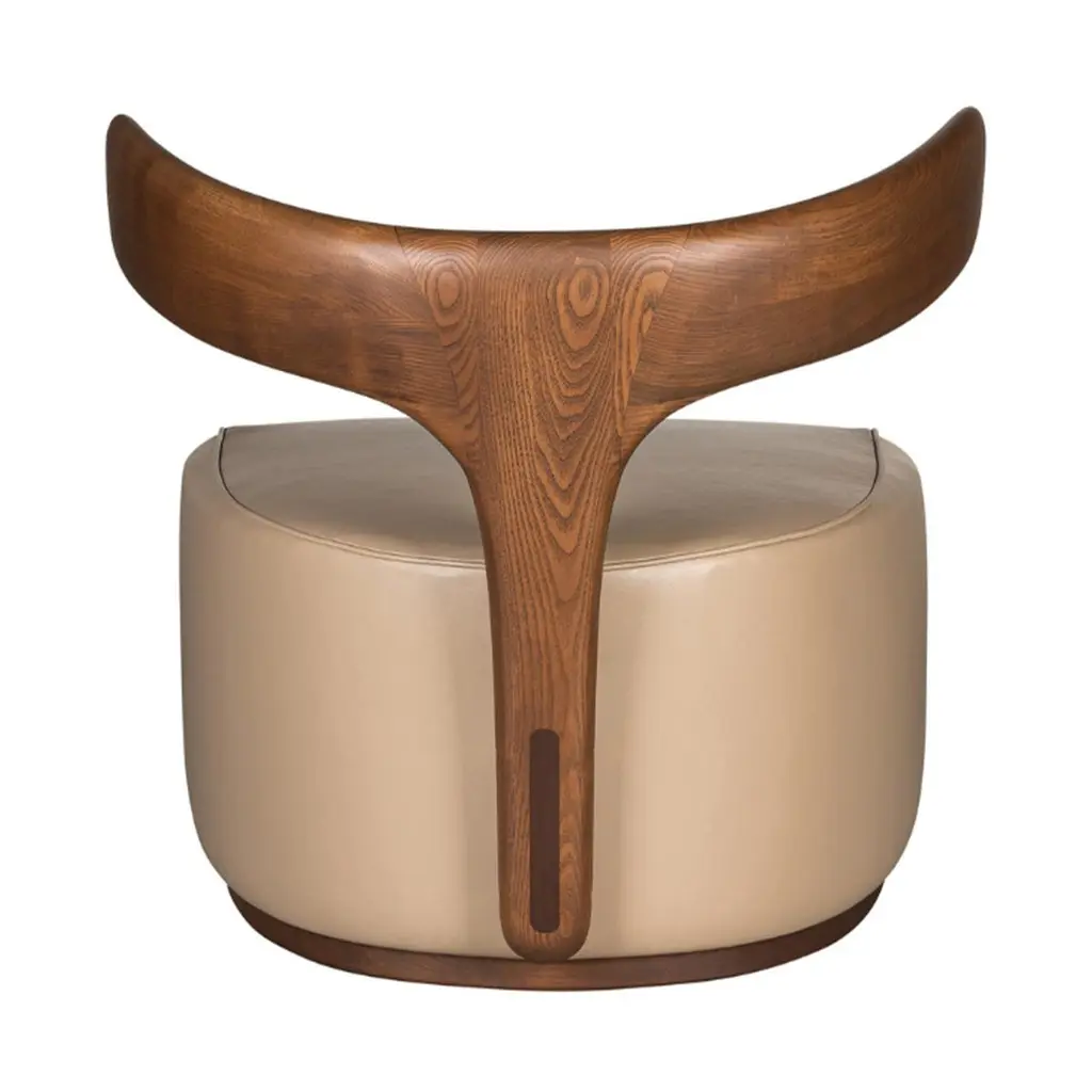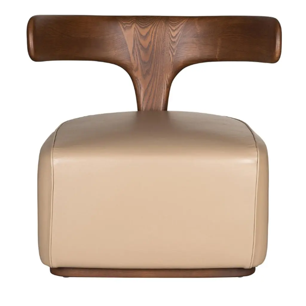 At once playful and refined, this armchair combines the perfect comfort of a monobloc seat luxuriously covered in beige leather with the sturdiness of an ash shell whimsically reminiscent of a whale's tail. Its fluid lines and artful references state its unmistakably contemporary flair, while the precious upholstery attests to its sartorial elegance. A design by Libero Rutilo, it comes in multiple versions.