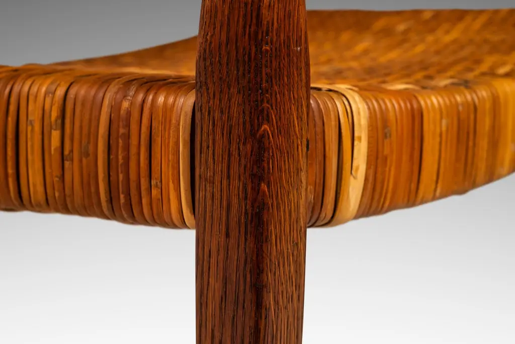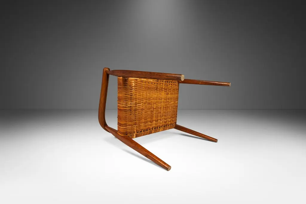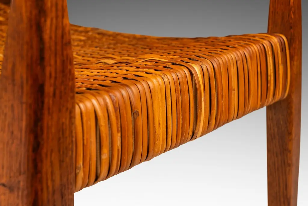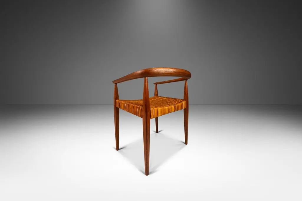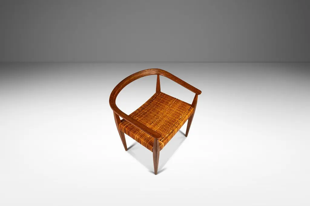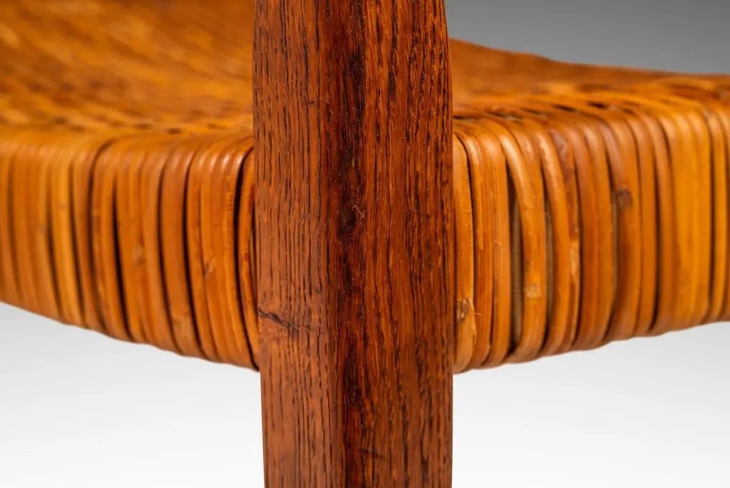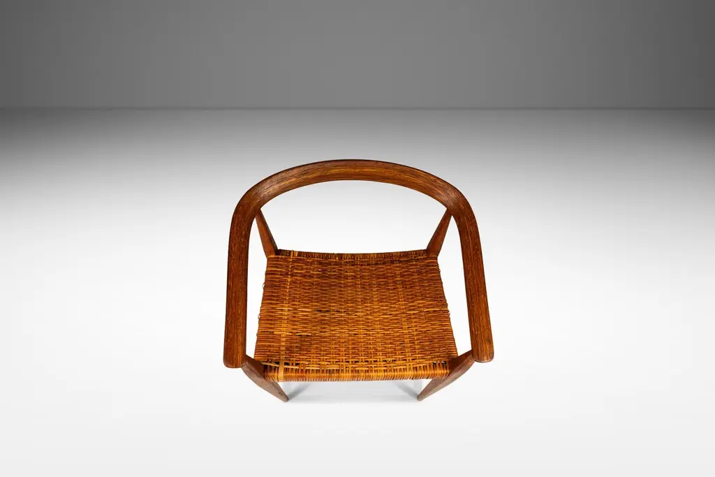 This “Model 113” chair, with it's elegant and ergonomic shape, is instantly recognizable as being Danish Mid-Century Modern. As with most of Ditzel’s designs, like her iconic “Egg Chair” (c. 1959), the Model 113 chair is based on a circular shape as shown with the deep curvature of the backrest. This graceful curve is contrasted with the square, tapered shape of the legs and the smooth oak softens this juxtaposition; resulting in a balanced and clean-lined frame. The delicately hand-woven, multi-colored cane seat perfectly offset the deep richness of the solid oak frame. The slight bow of the seat flows with the curves of the frame, making the chair both cohesive and comfortable. This delicate chair, with it's use of premium materials and subtle elegance, showcases all of the best qualities of Danish Mid-Century Modern design.Nanna Ditzel (1923 - 2005) was an icon of post-war Danish design, famous for her forward-thinking approach to shape and innovative use of new materials and techniques. She studied at the Danish School of Arts and Crafts and the Royal Danish Academy of Fine Arts in Copenhagen where she studied under Victor Isbrand, as well as fellow icons of Danish Modern Design such as Orla Mølgaard-Nielsen, Peter Hvidt and Kaare Klint.Largely forgotten by history during her own lifetime as woman operating in a man's world, Nanna Ditzel's life and prolific body of work has recently undergone a Renaissance of acclaim, admiration and reproduction. Now considered by many to be one of the top 5 Danish Modern designers and this reevaluation of Ditzel's impact on Danish design history is part of a wider reassessment of design and architecture history in recent years, acknowledging the impact of women whose work has historically been overlooked in favor of their male peers. Though she began furniture design at the zenith of the Danish Modern movement it's been argued that Ditzel's work served as a link between the canon of Mid-Century Danish Design and a more contemporary generation of designers in Denmark, including Cecilie Manz and Maria Bruun.In ultra-rare 100% original, vintage condition this 113 chair is ideal for collectors and designers alike searching for an authentic, Danish-made Nanna Ditzel chair. Perfect in both home and office spaces this Model 113 chair can blend seamlessly against a myriad of design backdrops from Mid-Century Modern to Contemporary to Boho Chic and everything in between. With it's intricately sculpted back, hand-woven cane seat and feminine features this extraordinary armchair is as rare as it is aesthetically breathtaking. Make it yours today before it's truly gone forever.---Dimensions---Width: 23 in / 58.42 cmDepth: 21 in / 53.34 cmHeight: 26.5 in / 67.31 cmSeat Height: 16.5 in / 41.91 cmThis iconic Model 113 chair, designed by the revered Nanna Ditzel and produced in Denmark in the mid-1950's, is in 100% original, vintage condition and is as at home in an art museum as it is in a household. The solid oak frame is in excellent shape showing only minor nicks and light scratches (the worst of which can be seen in the detail photos provided) but showing no gouges, stains or other signs of wear whatsoever and the woodgrains are truly stunning in natural light. It's always our intention to leave authentic pieces in original condition, however we do offer carpentry services and if you'd like this chair refinished please message us prior to checkout to discuss options and pricing.The caning does show some signs of wear such as a few missing strands as well as areas of minor discoloration (all of which can be seen both in the detail photos as well as the natural light video provided). With that said the seat is weight-bearing and structurally sound. We do offer re-caning services, if this options interests you please message us prior to checkout to discuss pricing and lead time.This visually stunning 113 chair is incredibly comfortable, structurally sound and ready for decades more of use. Please view all photos and video for details on this chair's current condition. We're limited on the amount of media we can post so additional photos and videos are available upon request.