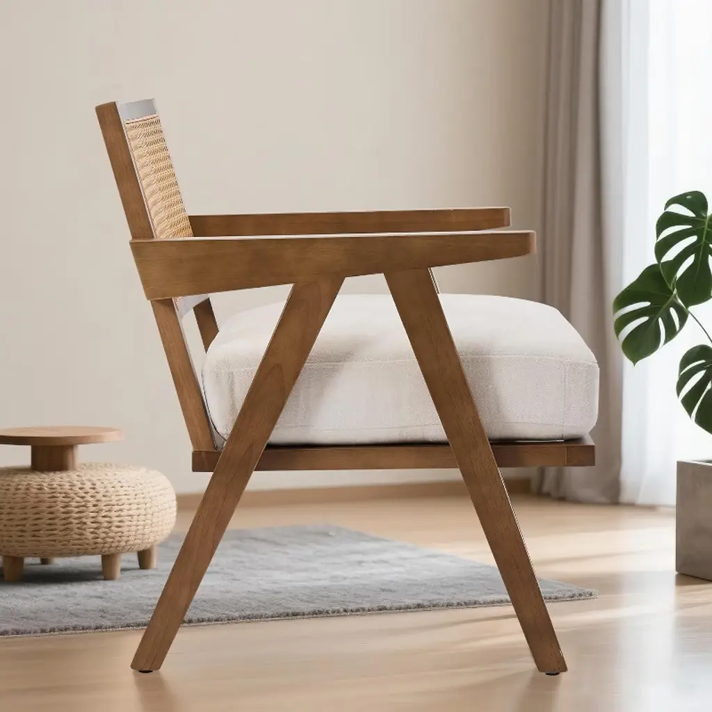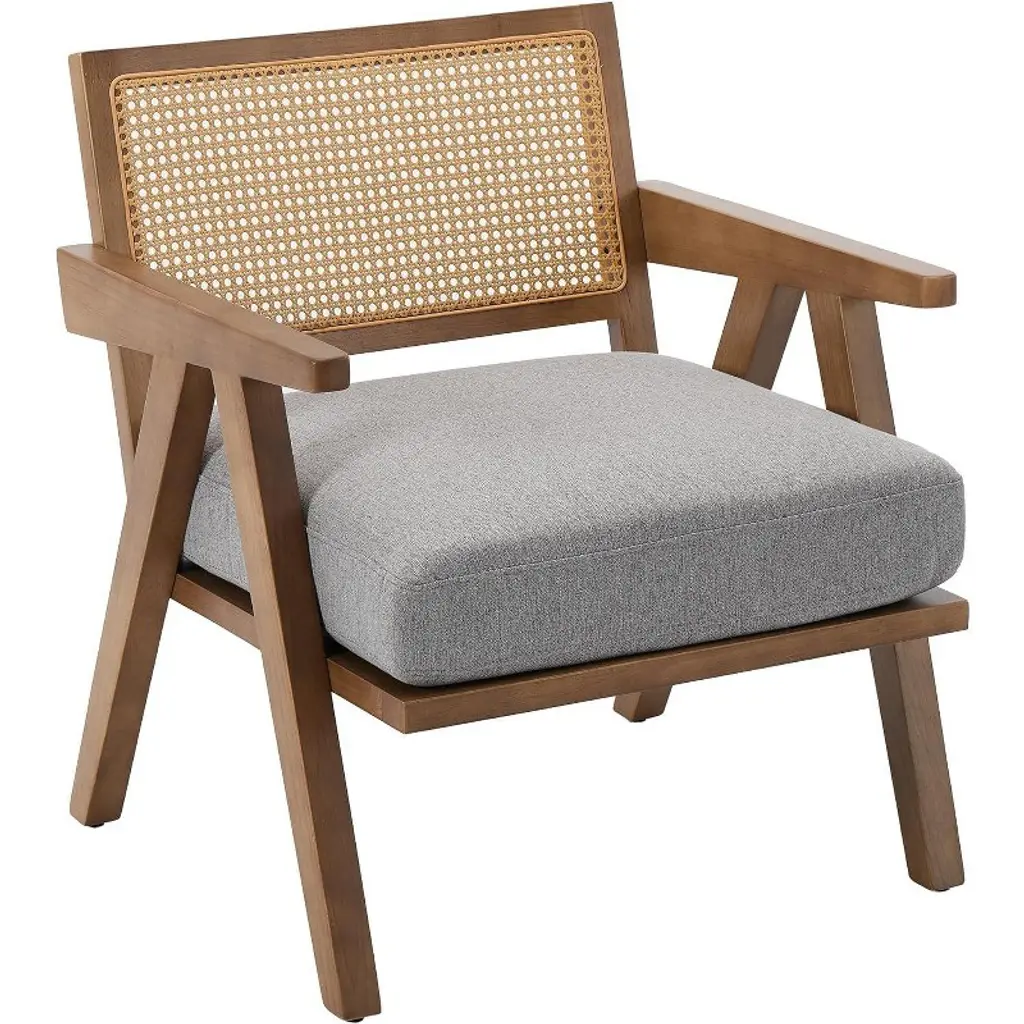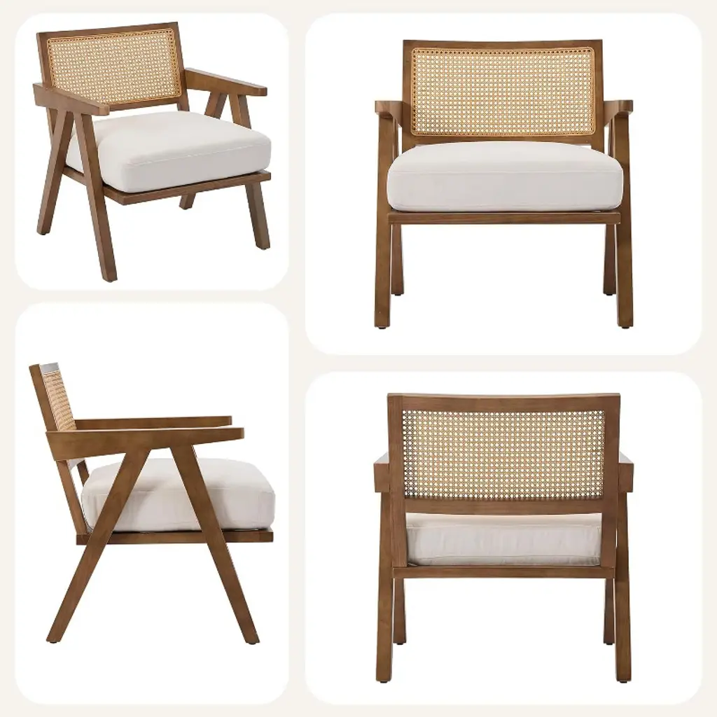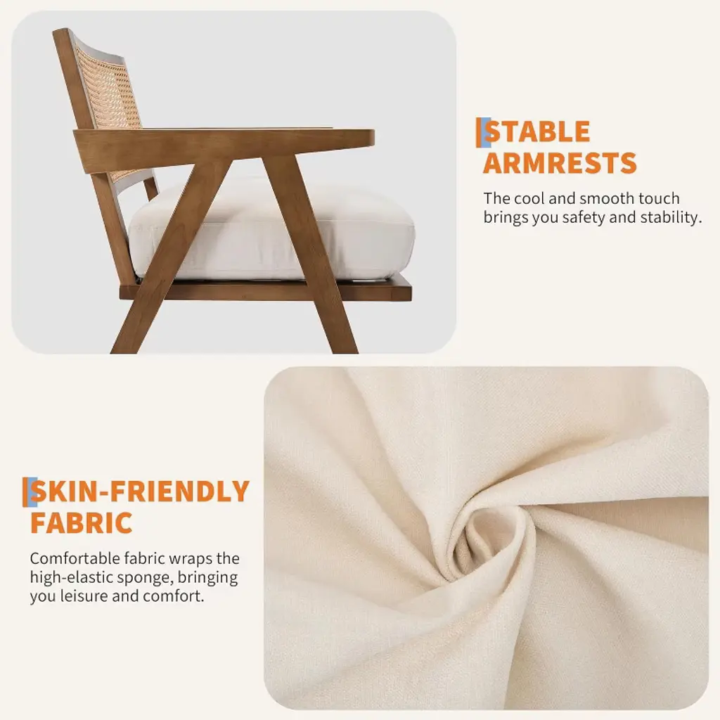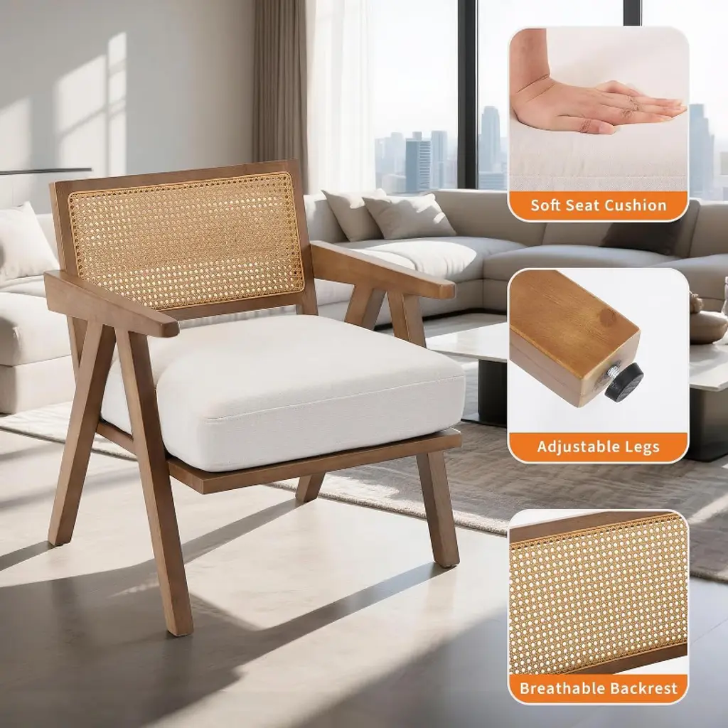 Modern Accent Chair, Comfy Living Room Chairs With Sturdy Wood Legs, Rattan Backrest & Beige Thick Linen Cushion, Armchair, Beige