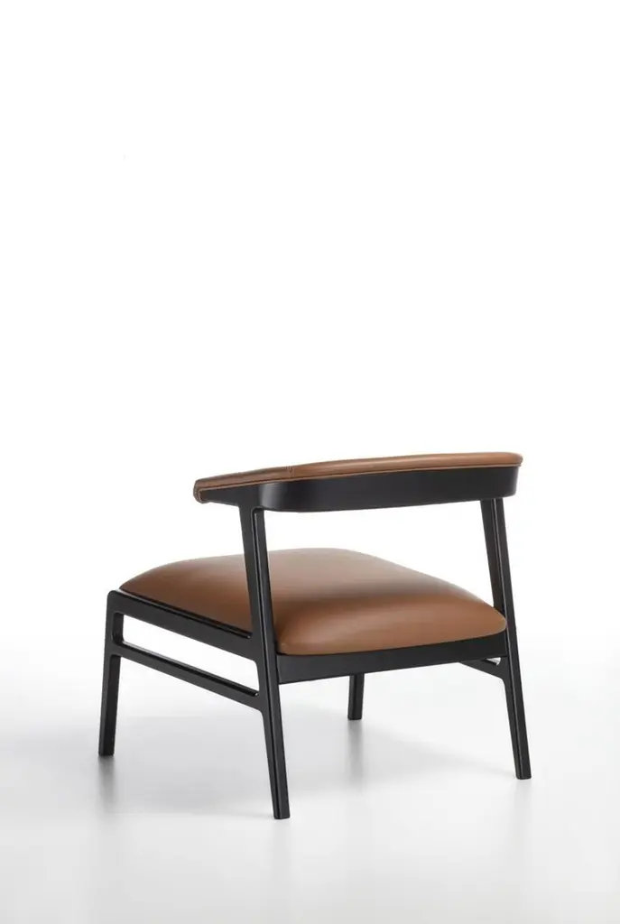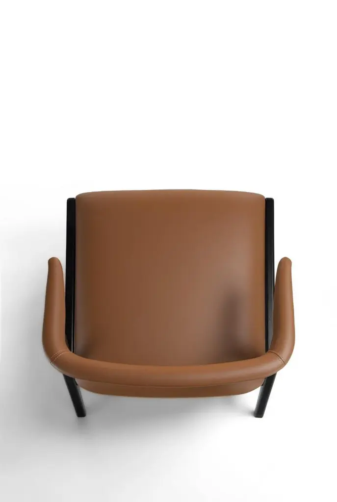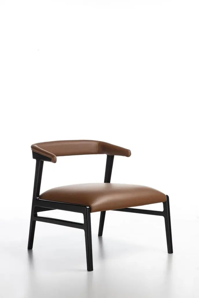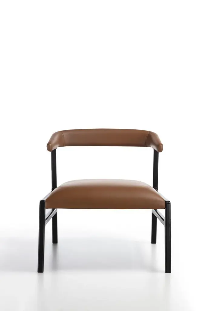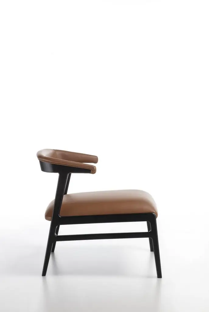 Armchair from the Aida line with an essential and light design. Solid wood frame, available in Canaletto Walnut or black finish. Padded backrest with a wrap-around shape, featuring fine stitching. Leather Trim.