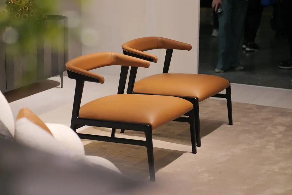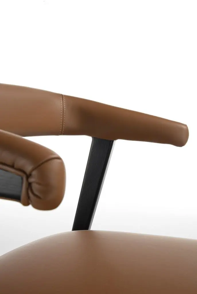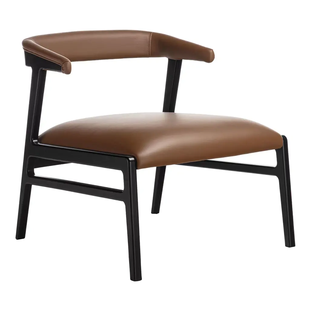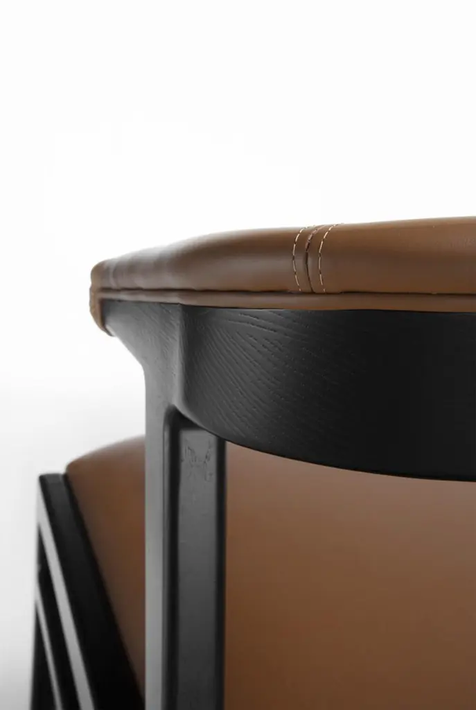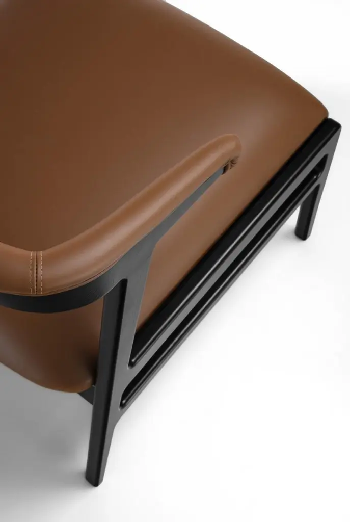 Armchair from the Aida line with an essential and light design. Solid wood frame, available in Canaletto Walnut or black finish. Padded backrest with a wrap-around shape, featuring fine stitching. Leather Trim.