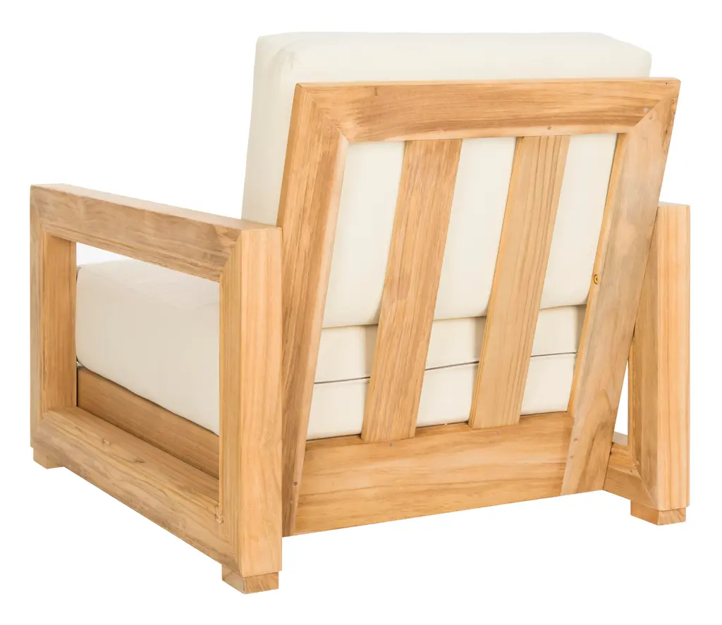 The sleek angels and minimalist style of this contemporary teak armchair transform any outdoor living area into a modern oasis. Crafted with solid wood, it's cut-out arms and back frame it's neutral off-white upholstery. Designers use year-round in pairs.