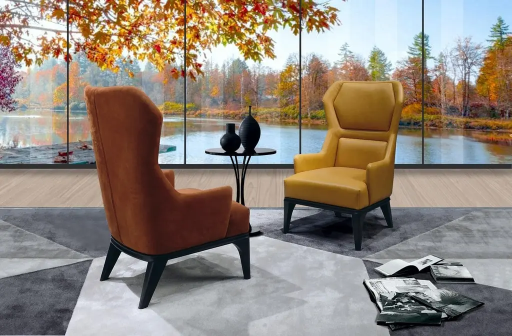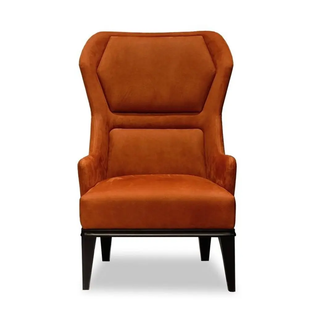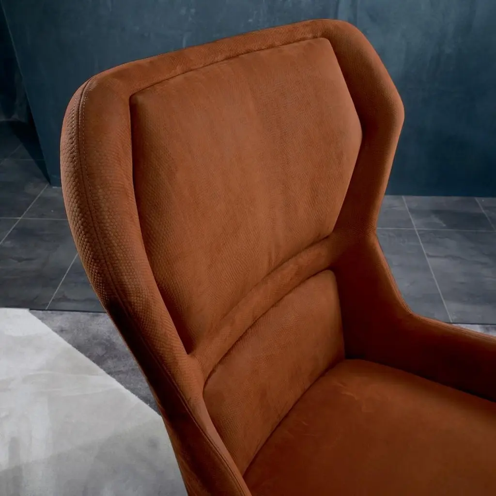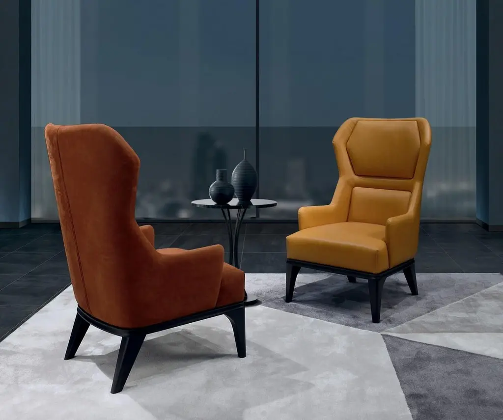 Relax armchair made of a wooden structure coated with polyurethane in different densities. The armchair is enhanced by "english" seams. The base is in solid Maple dyed in Dark Sycomoro wood.Upholstery can be in fabric, velvet, leather or nabuk.