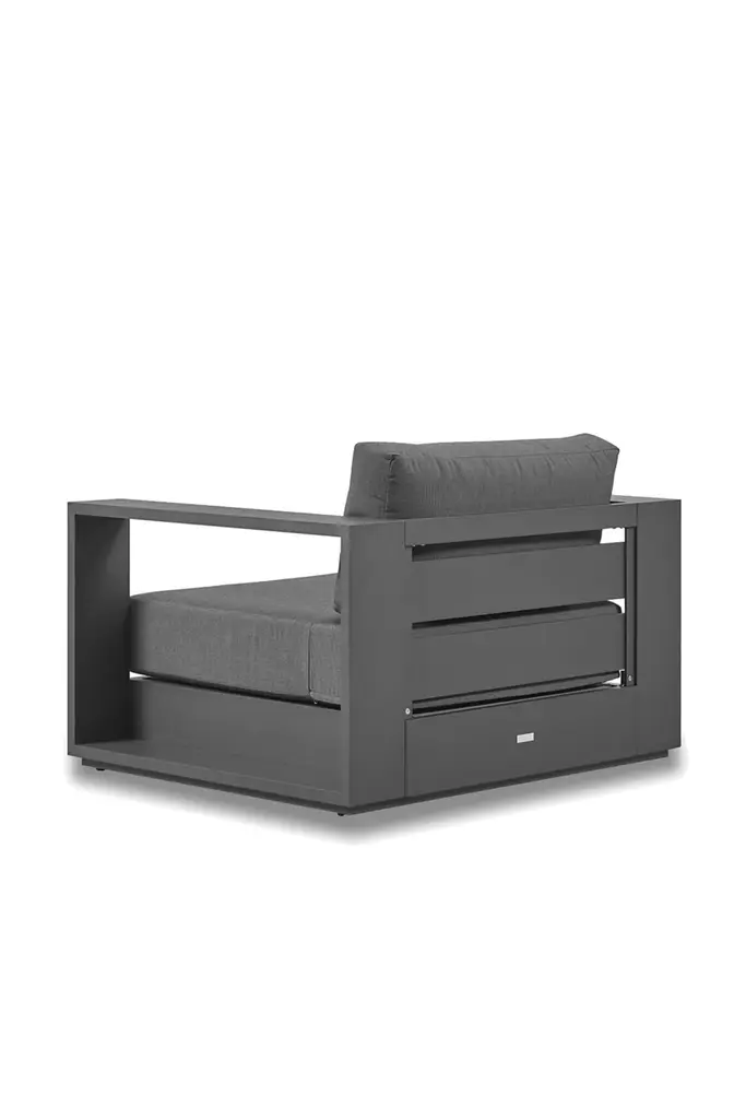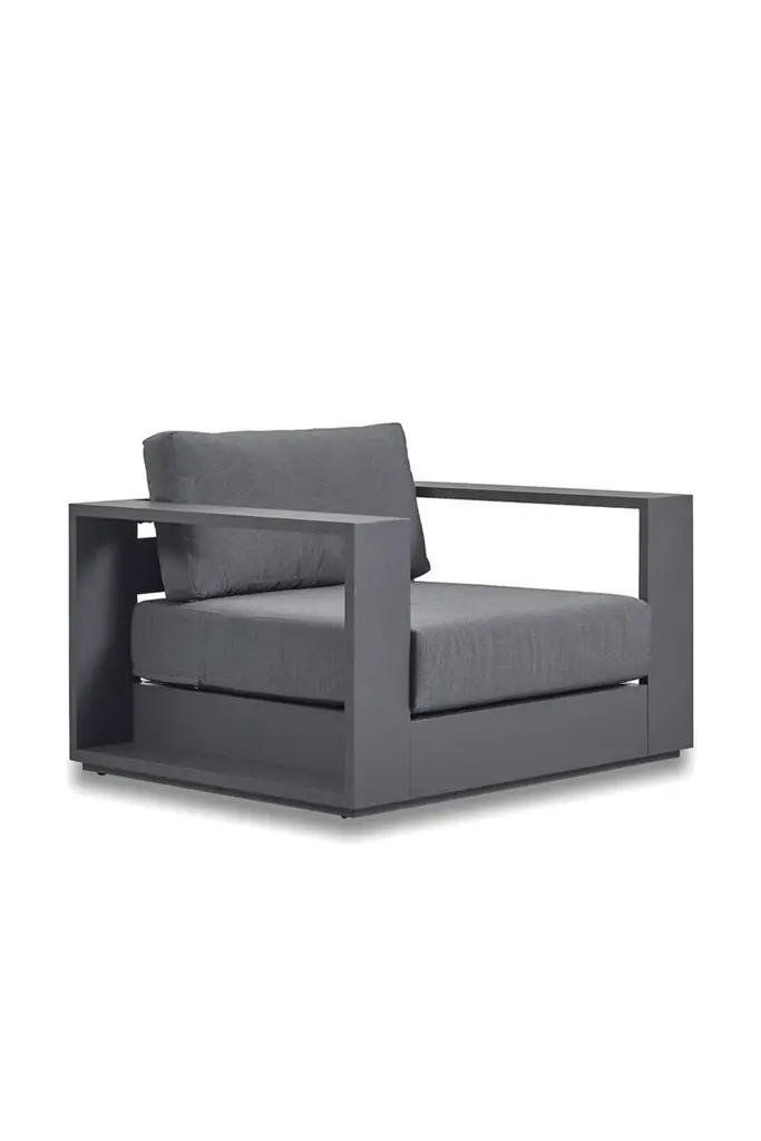 Our Bora collection was inspired by easy going, island living, with clean straight lines and a low profile. The minimalist design is formed from a dark gray, powder coated, rust proof aluminum frame. Upholstered in slate gray removable, cleanable, anti mold and waterproof fabric with outdoor foam fillings meaning is it is suitable to be left outdoors. The ample seat width and depth allows for laid back comfort in your outdoor area and the swivel feature gives this piece extra versatility. Comes with a 5 year frame guarantee.