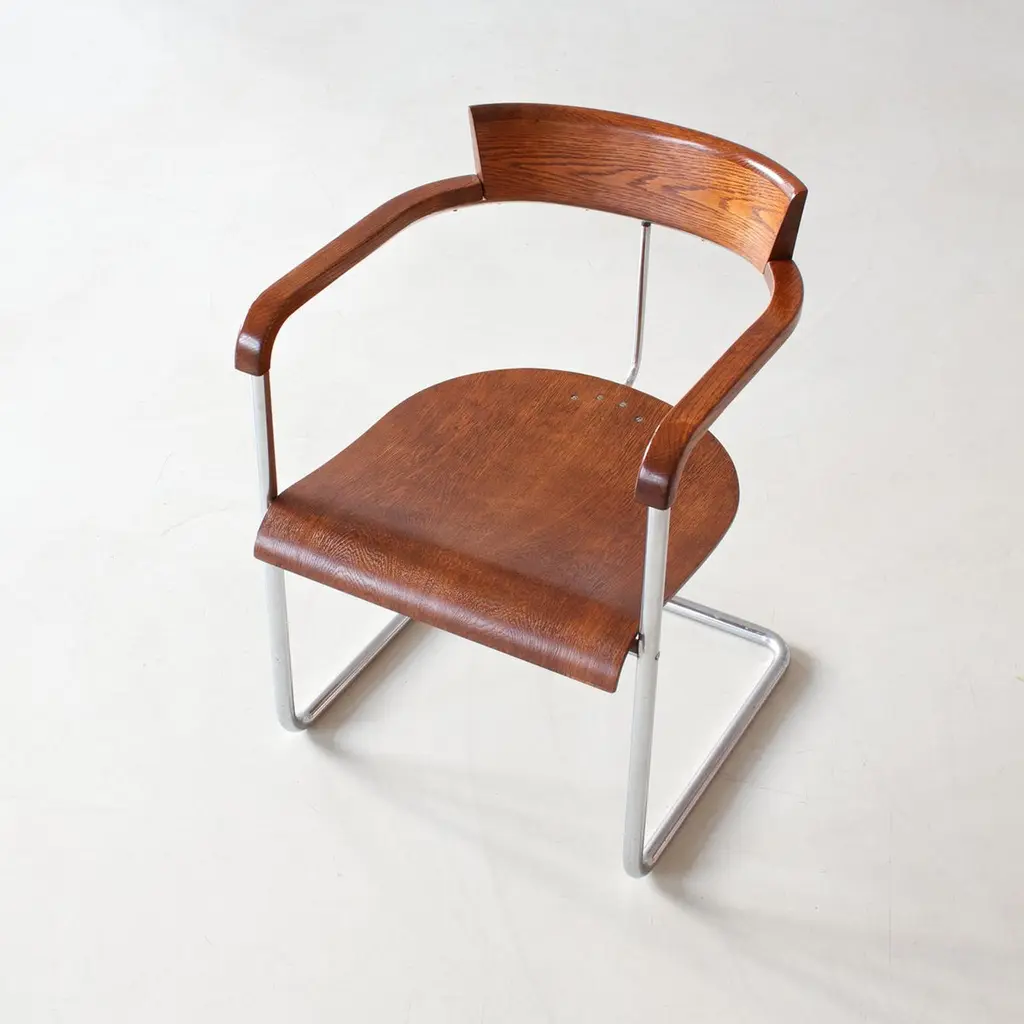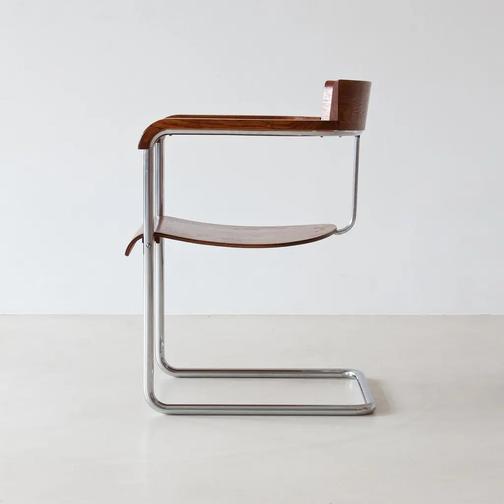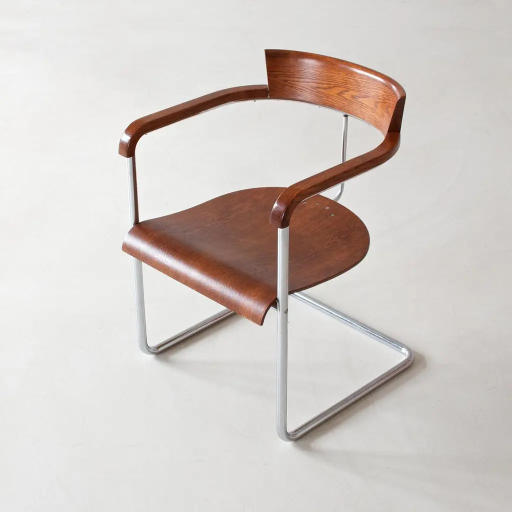 Modernist Cantilever Armchair By Jindrich Halabala, Chromed Metal, Veneered Wood